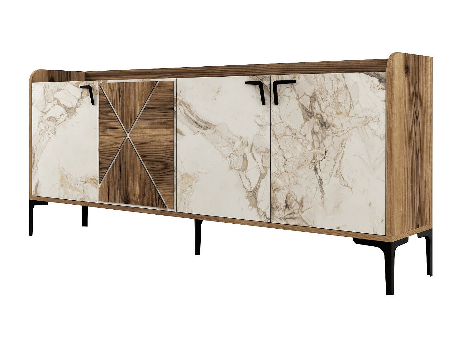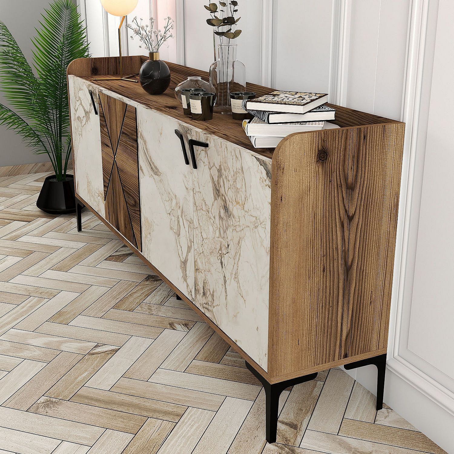 Buffet bas 4 portes Zenger 180cm Bois Naturel et Blanc effet marbre et Métal Noir