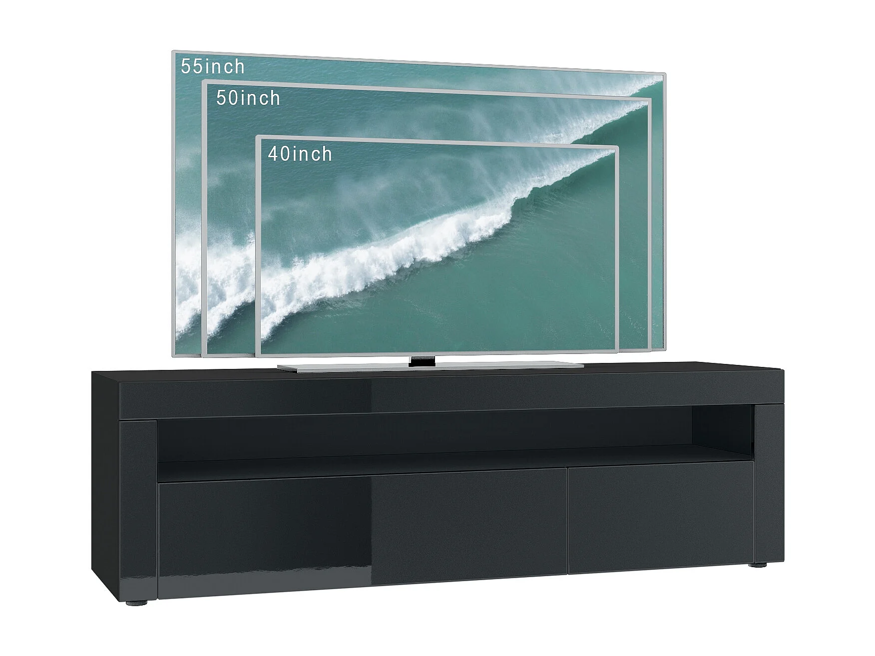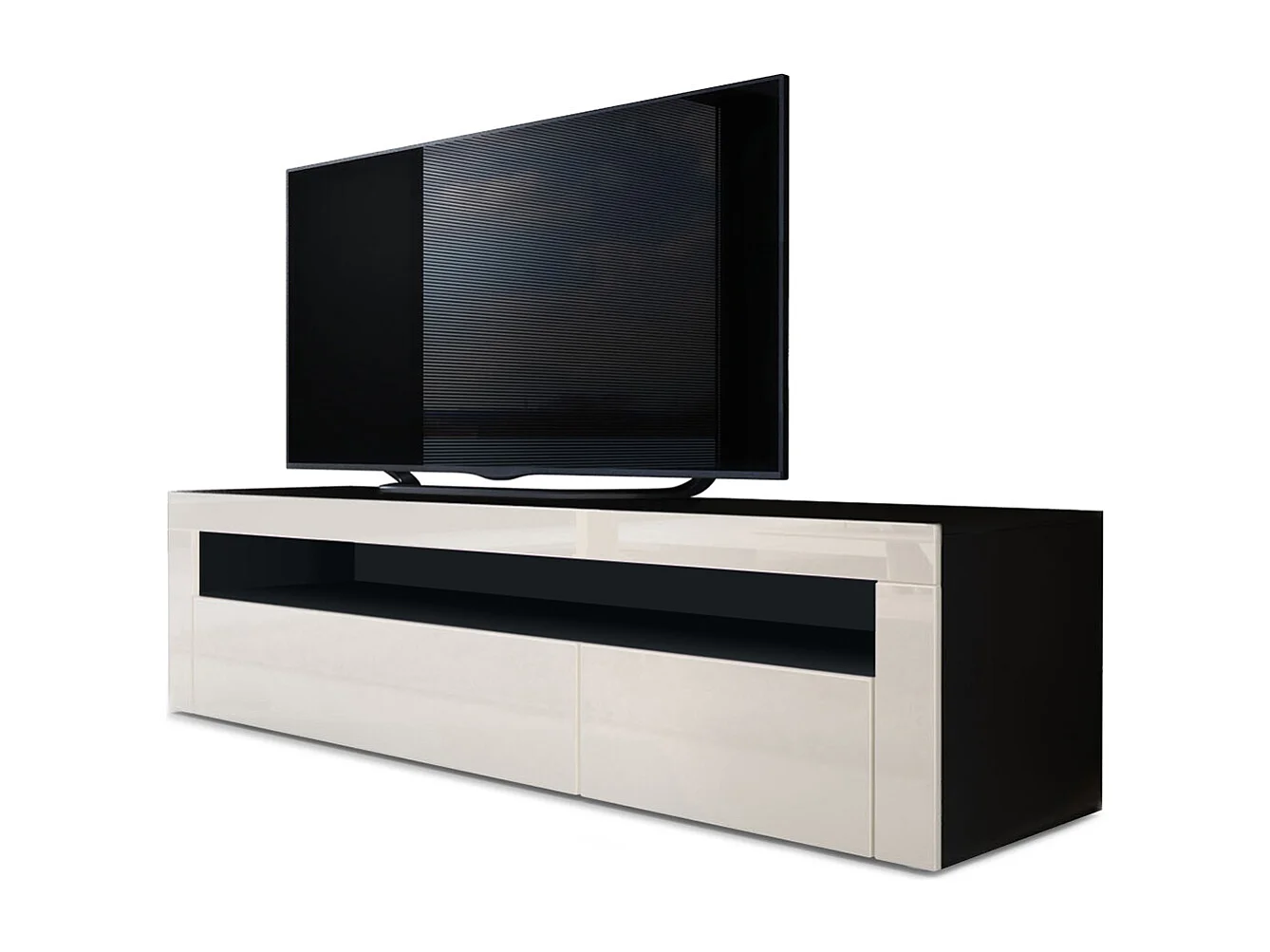 Buffet bas Valencia, Meuble TV avec 1 compartiment ouvert et 2 clapets, Noir mat/crème haute brillance/crème haute brillance (155 x 46 x 40 cm)
