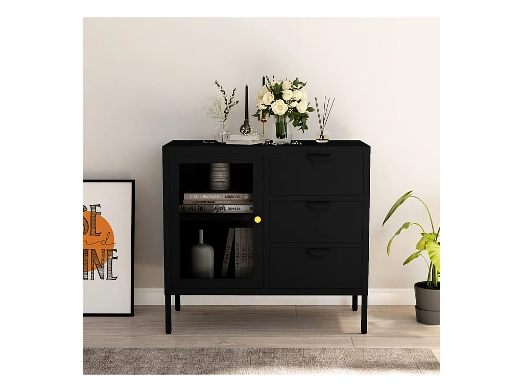 Buffet | Commode à tiroir | Meuble de rangement Noir 75x35x70 cm Acier et verre trempé