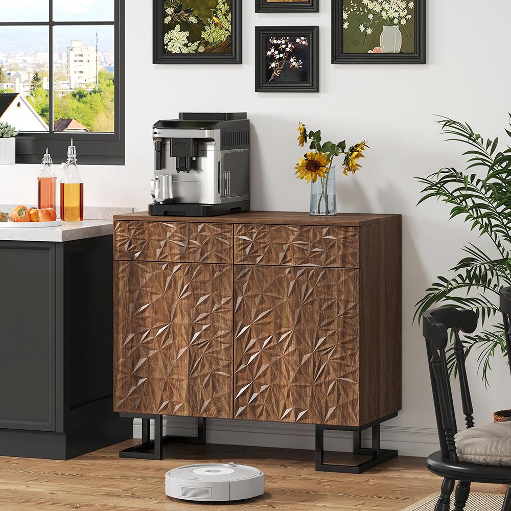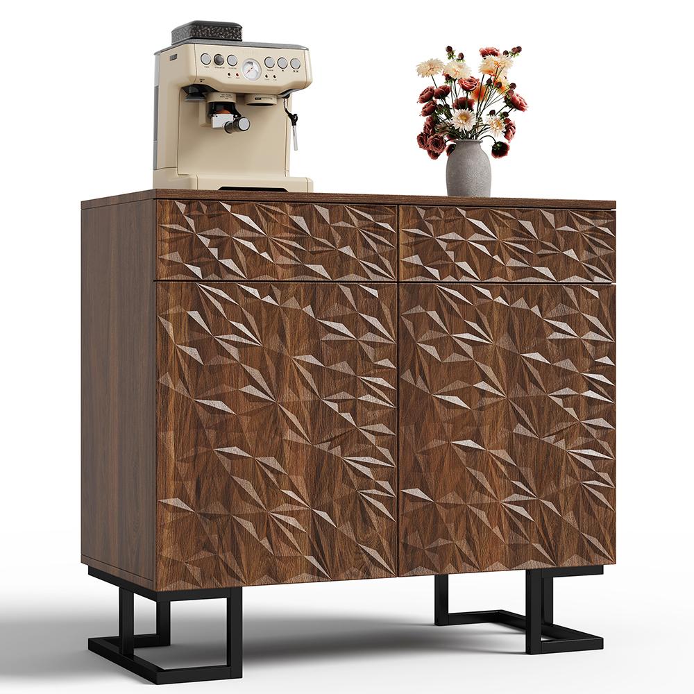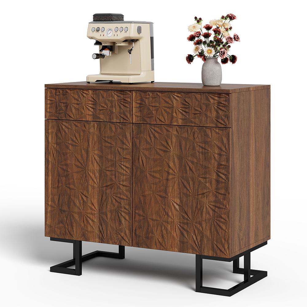 Buffet commode noyer foncé relief feuilles pieds métalliques 2 tiroirs 2 portes sans poignées salon salle à manger
