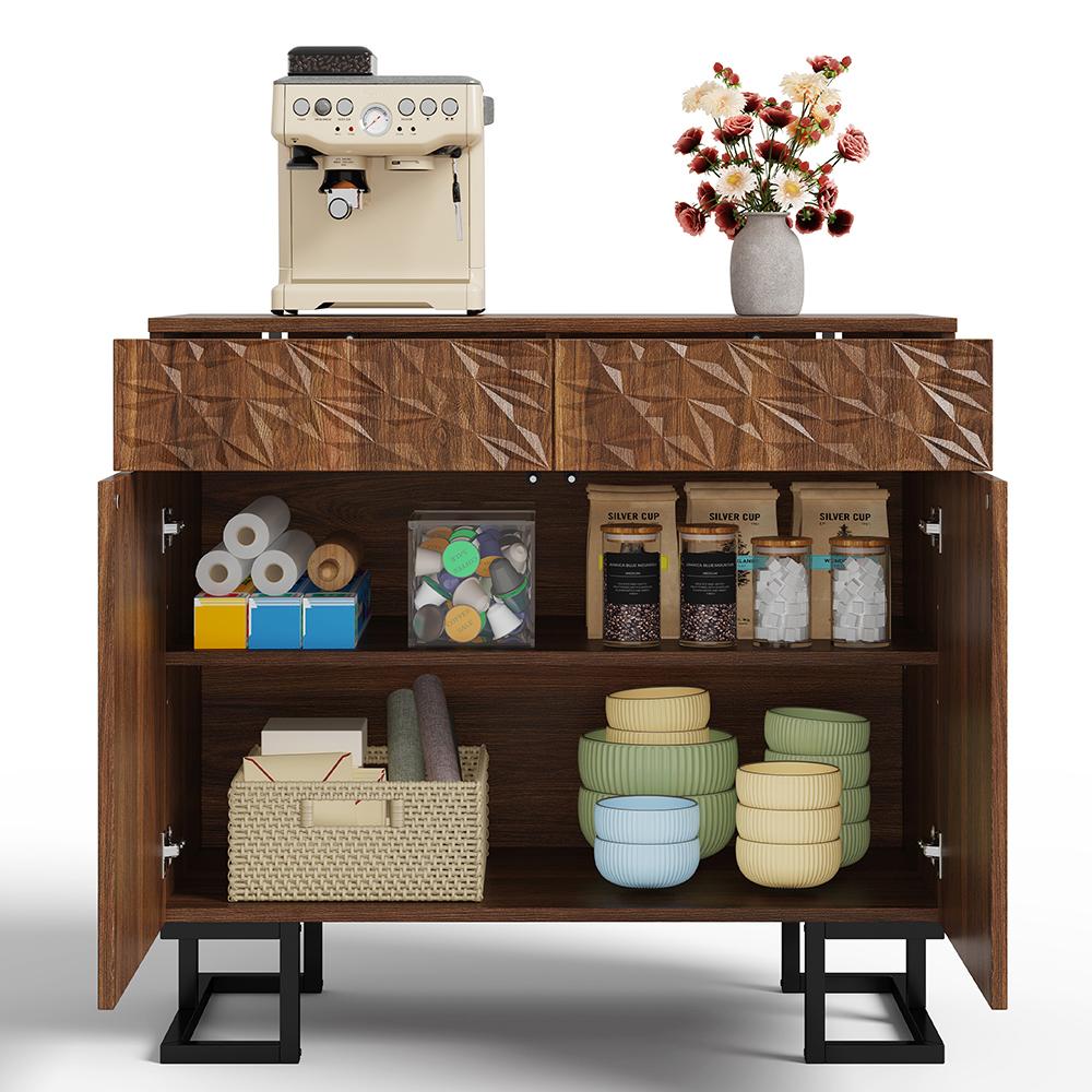 Buffet finition noyer foncé relief feuilles pieds métalliques 2 portes 2 tiroirs salle à manger salon couloir