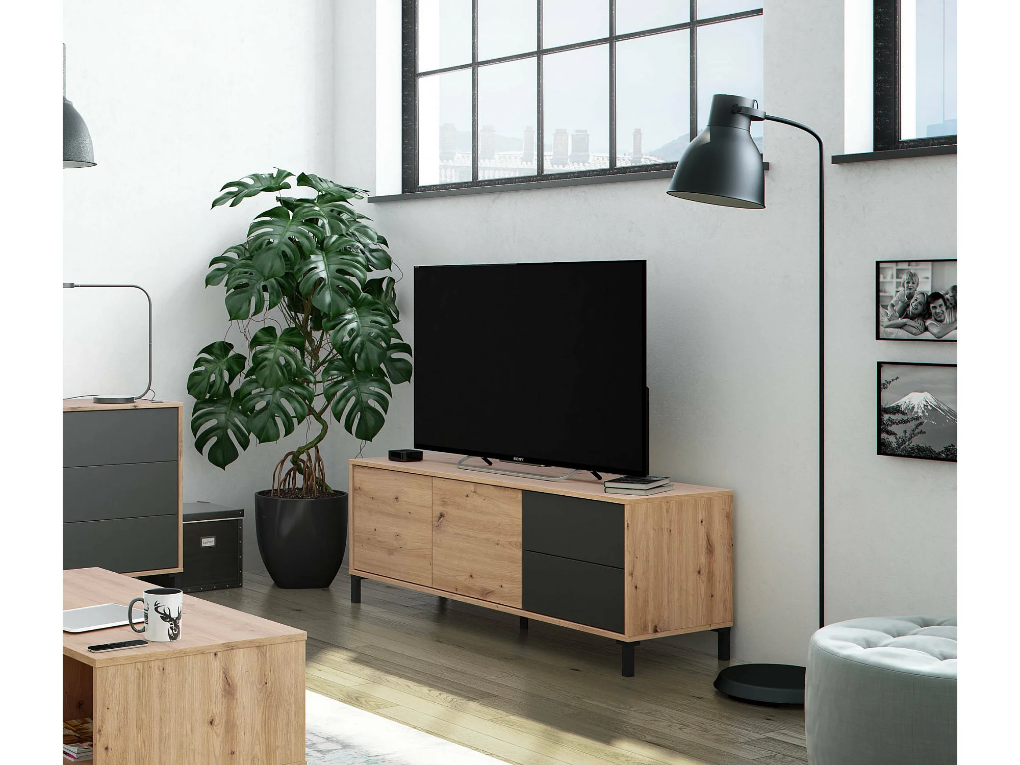 Buffet Daca, Buffet de salon, Meuble TV, Buffet avec pieds pour salon, Armoire moderne avec 2 portes, 130x41h47 cm, Chêne noué et Anthracite
