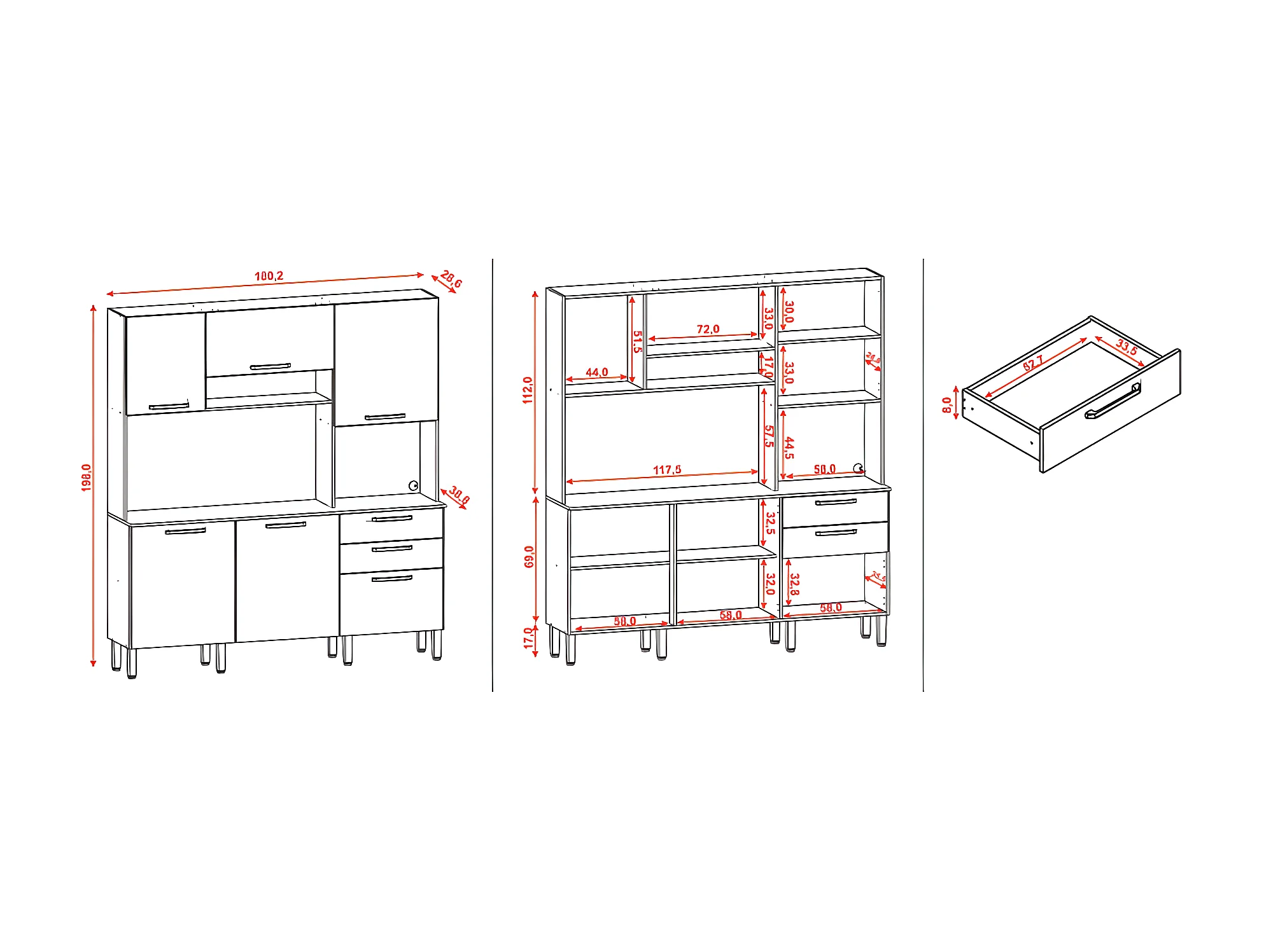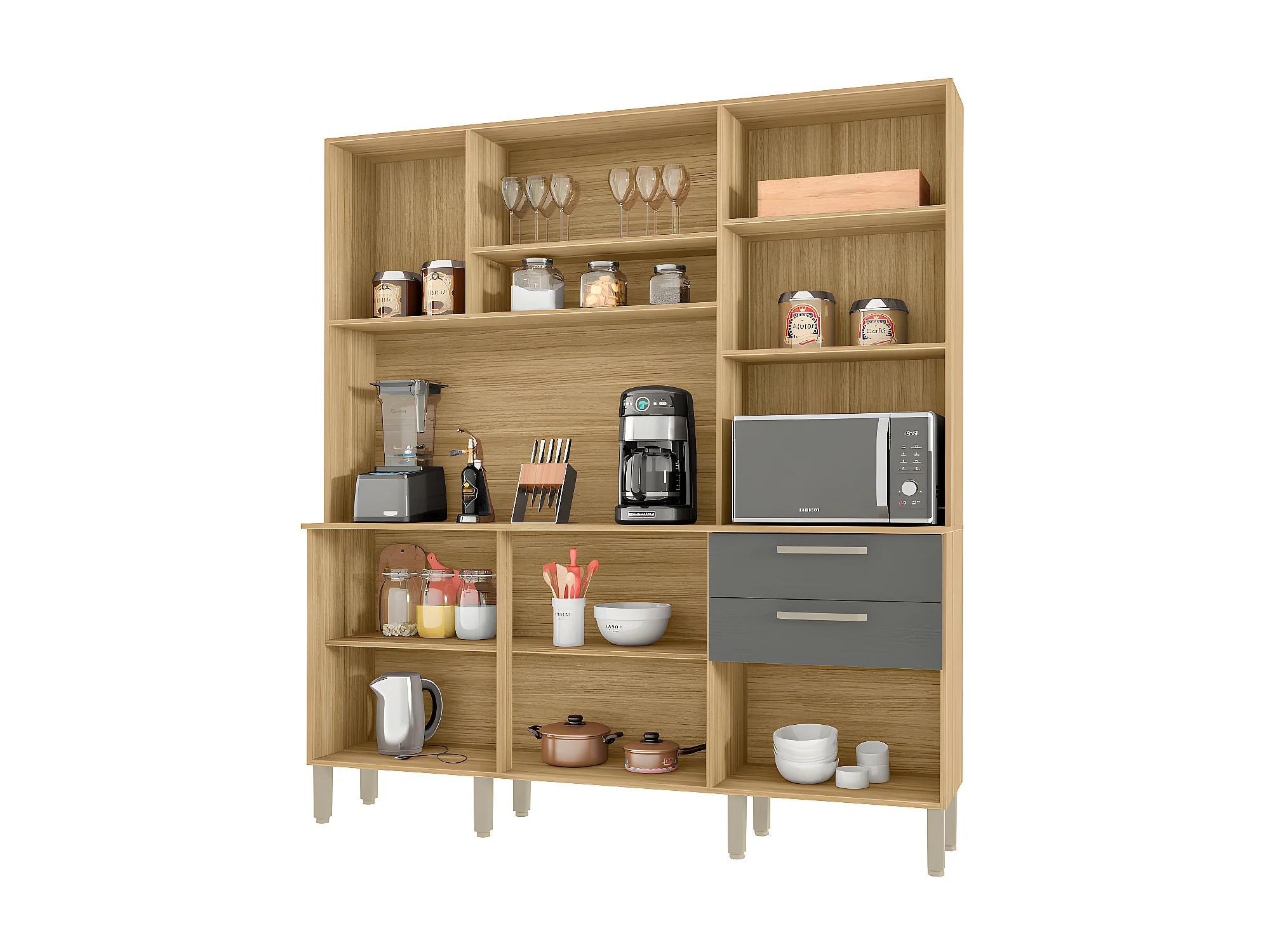 Buffet de Cuisine 6 Portes 2 Tiroirs Chêne et Gris L 180.2 H 198 P 38.8 cm