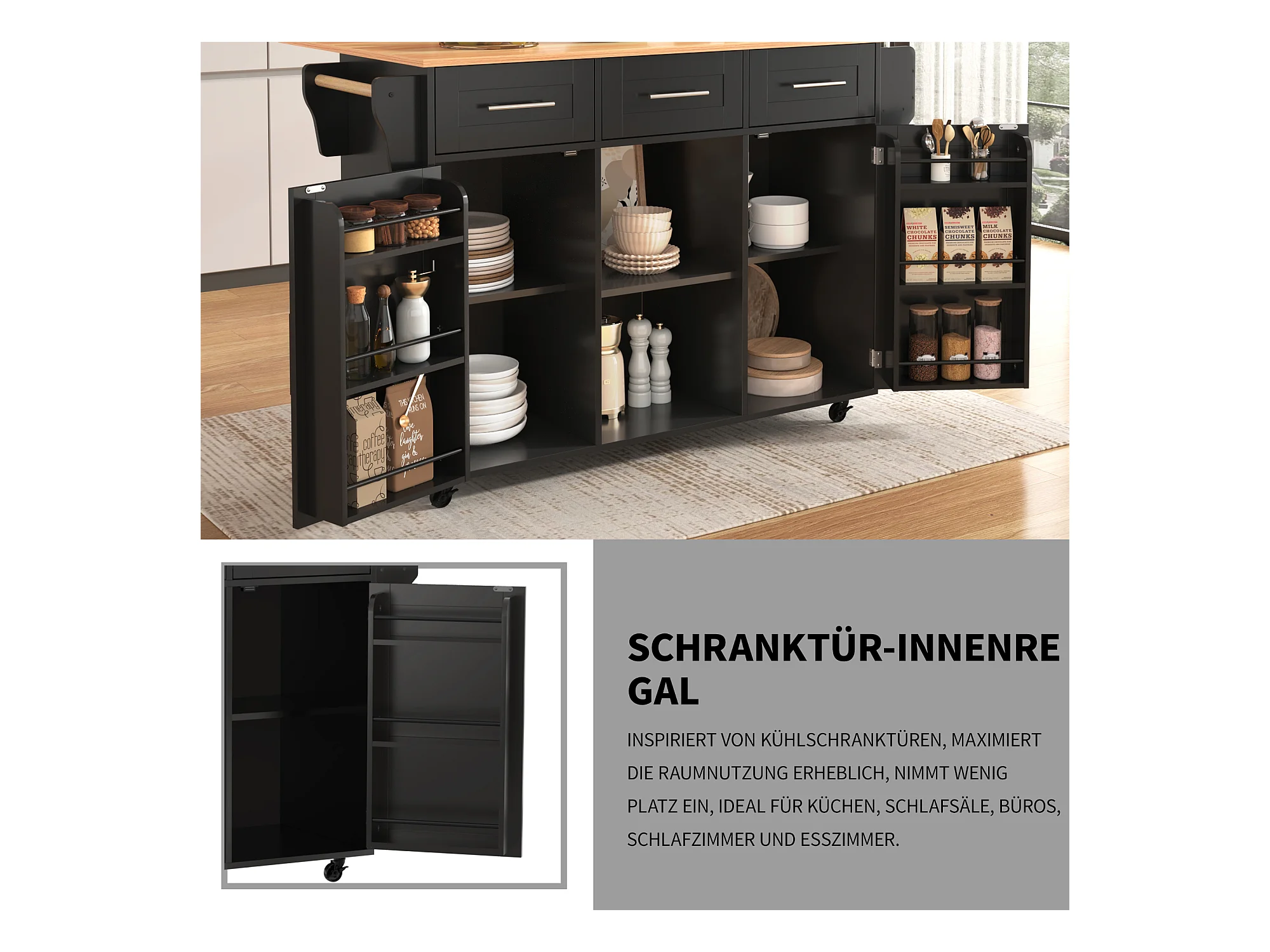 Buffet de cuisine roulant avec plateau rabattable, design européen, MDF noir et bois massif, 4 tiroirs et étagères (139x46x91.5cm)