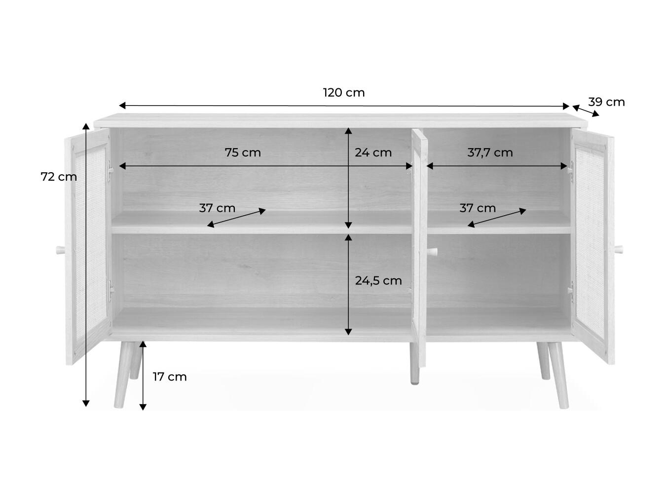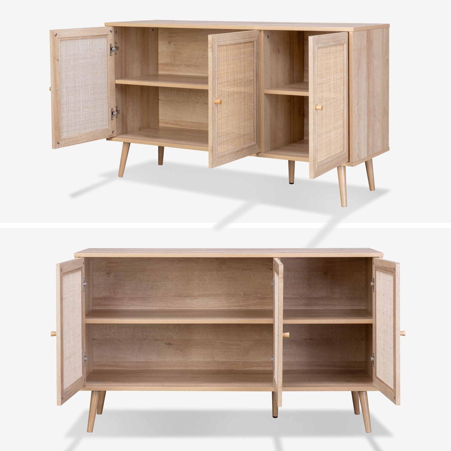 Buffet de rangement en cannage 120x39x70cm - Bohème - 2 niveaux. 3 portes. pieds scandinaves. buffet bas