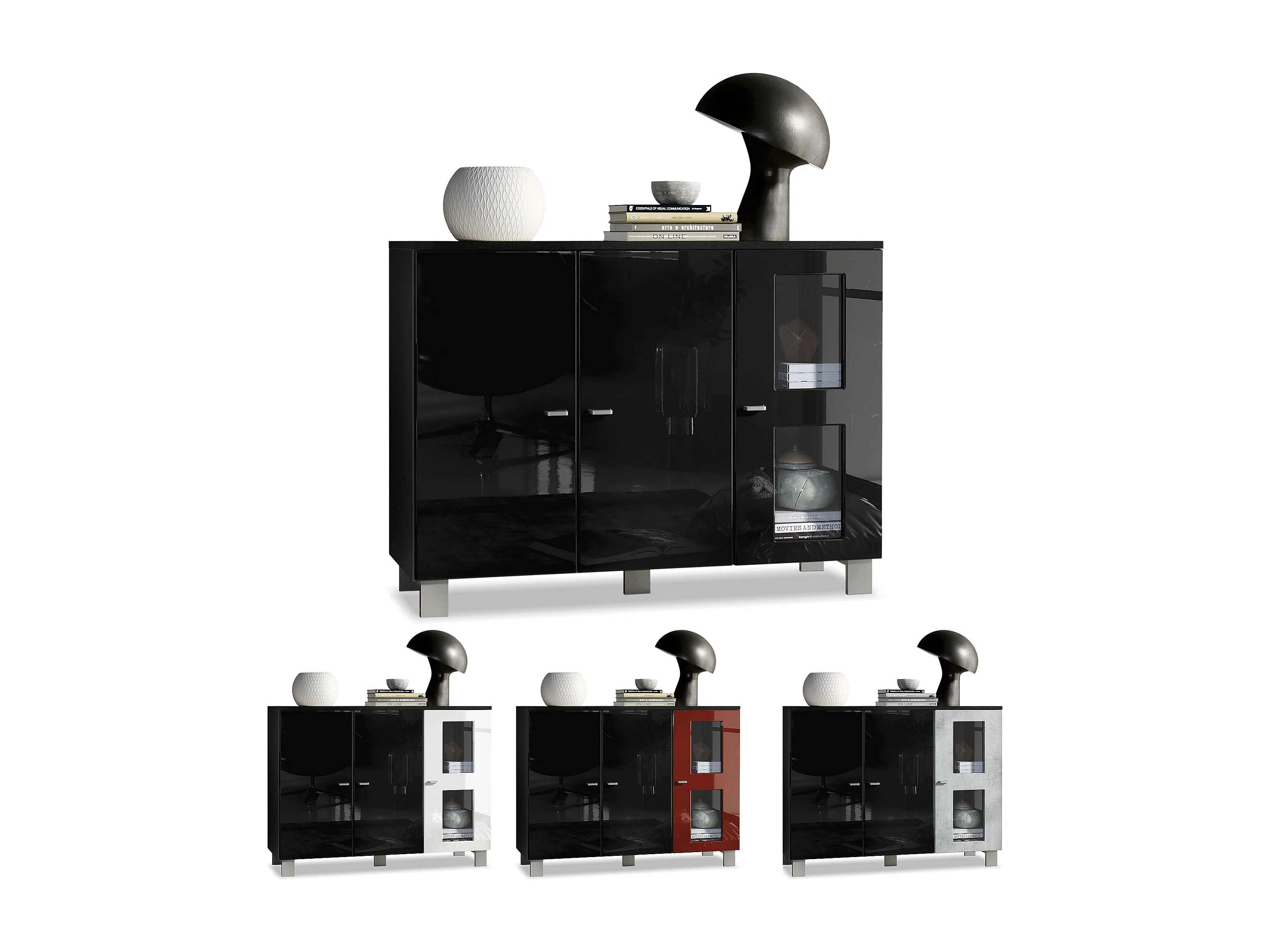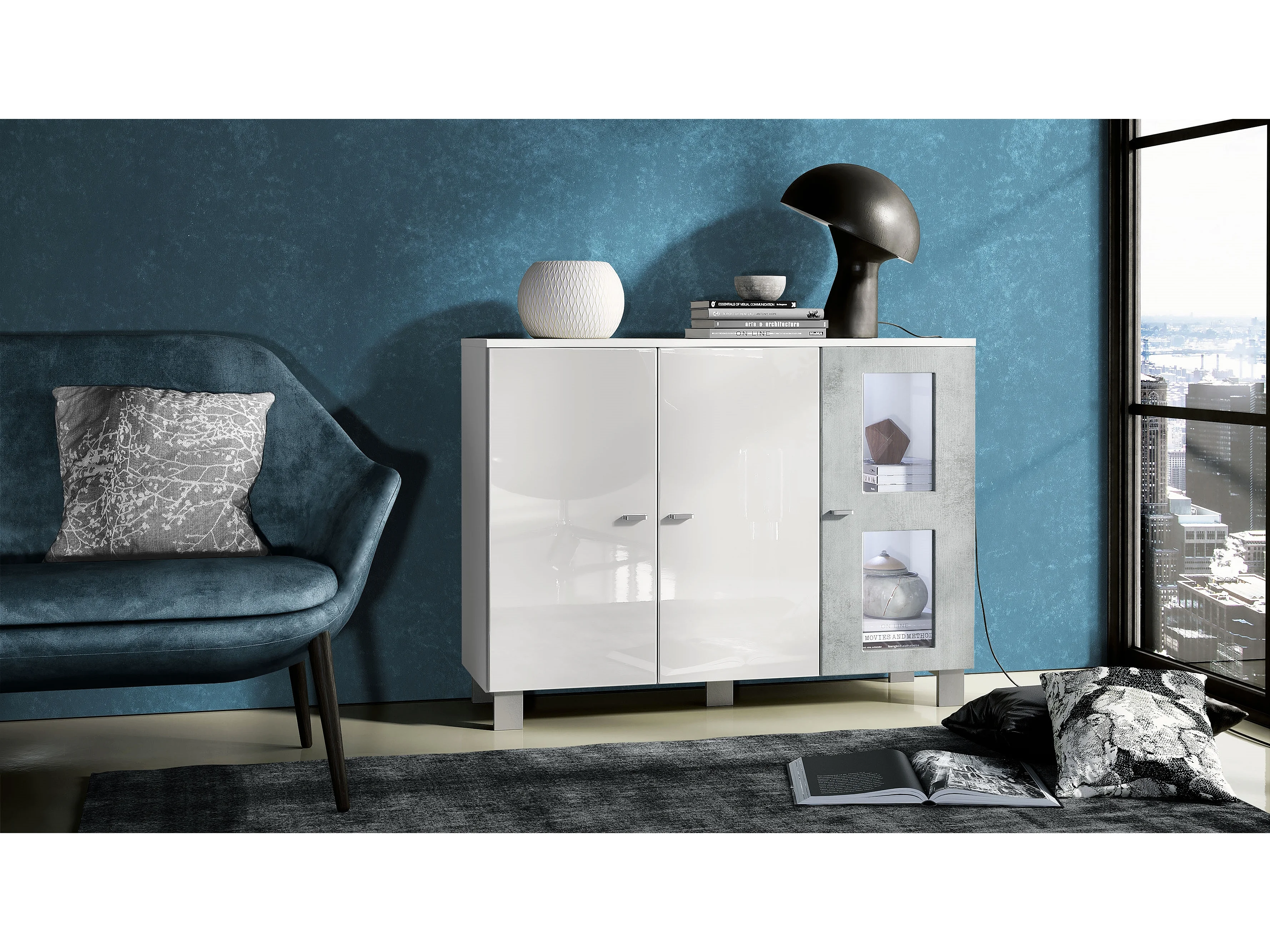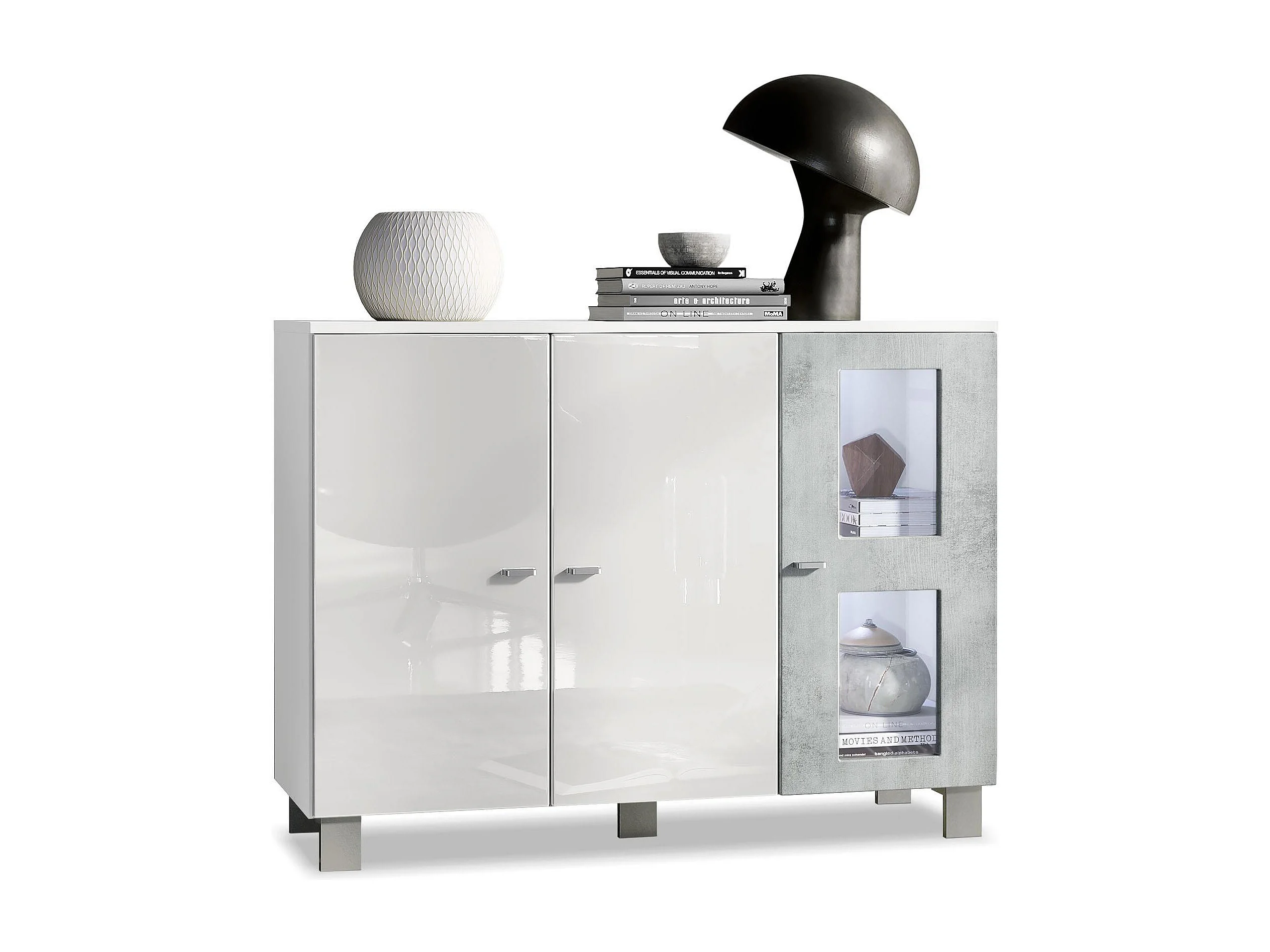 Buffet Denjo, Commode avec 3 portes, Blanc mat/Blanc haute brillance/Aspect Béton Oxyde, éclairage LED inclus (107 x 81 x 35 cm)
