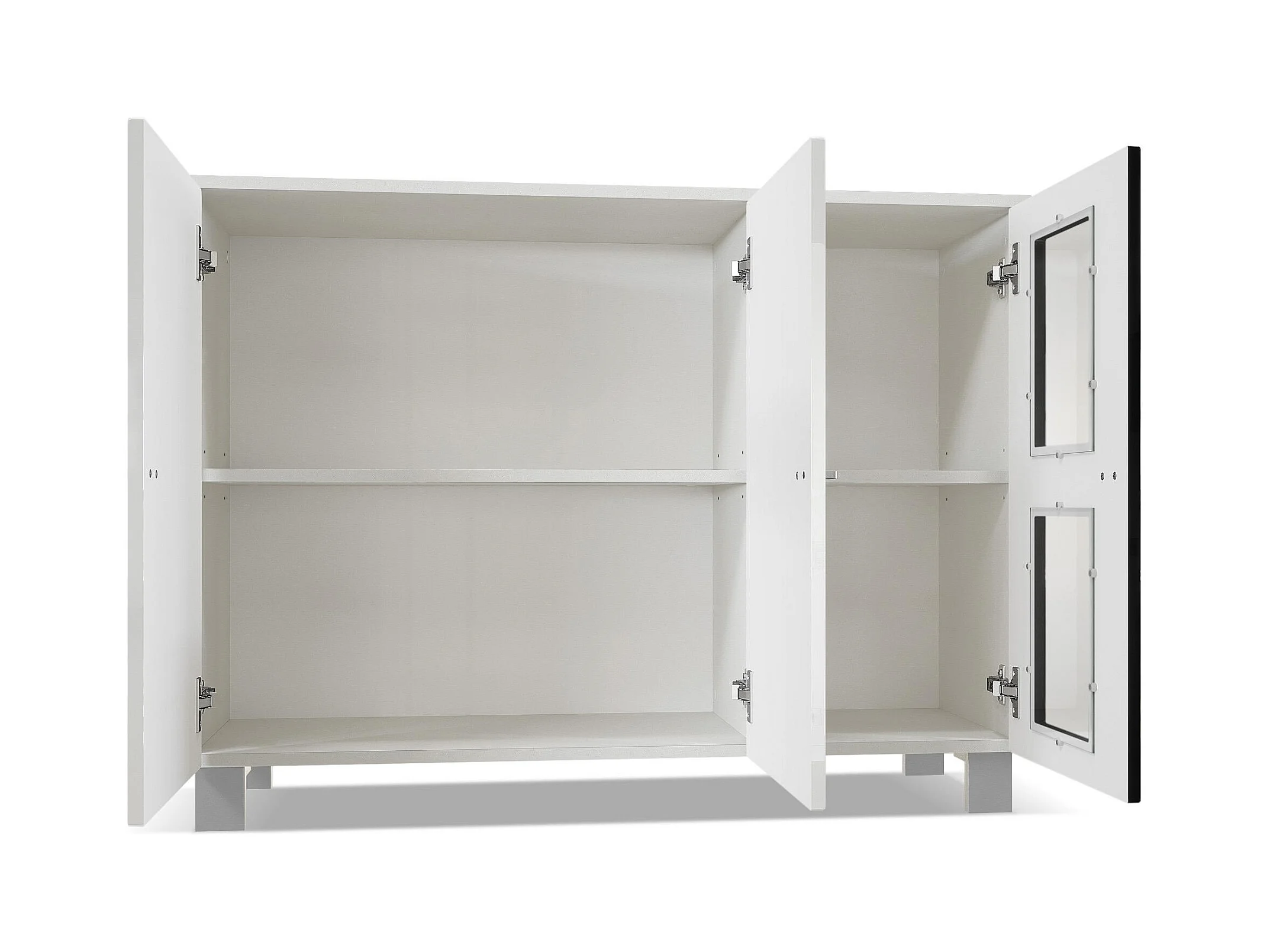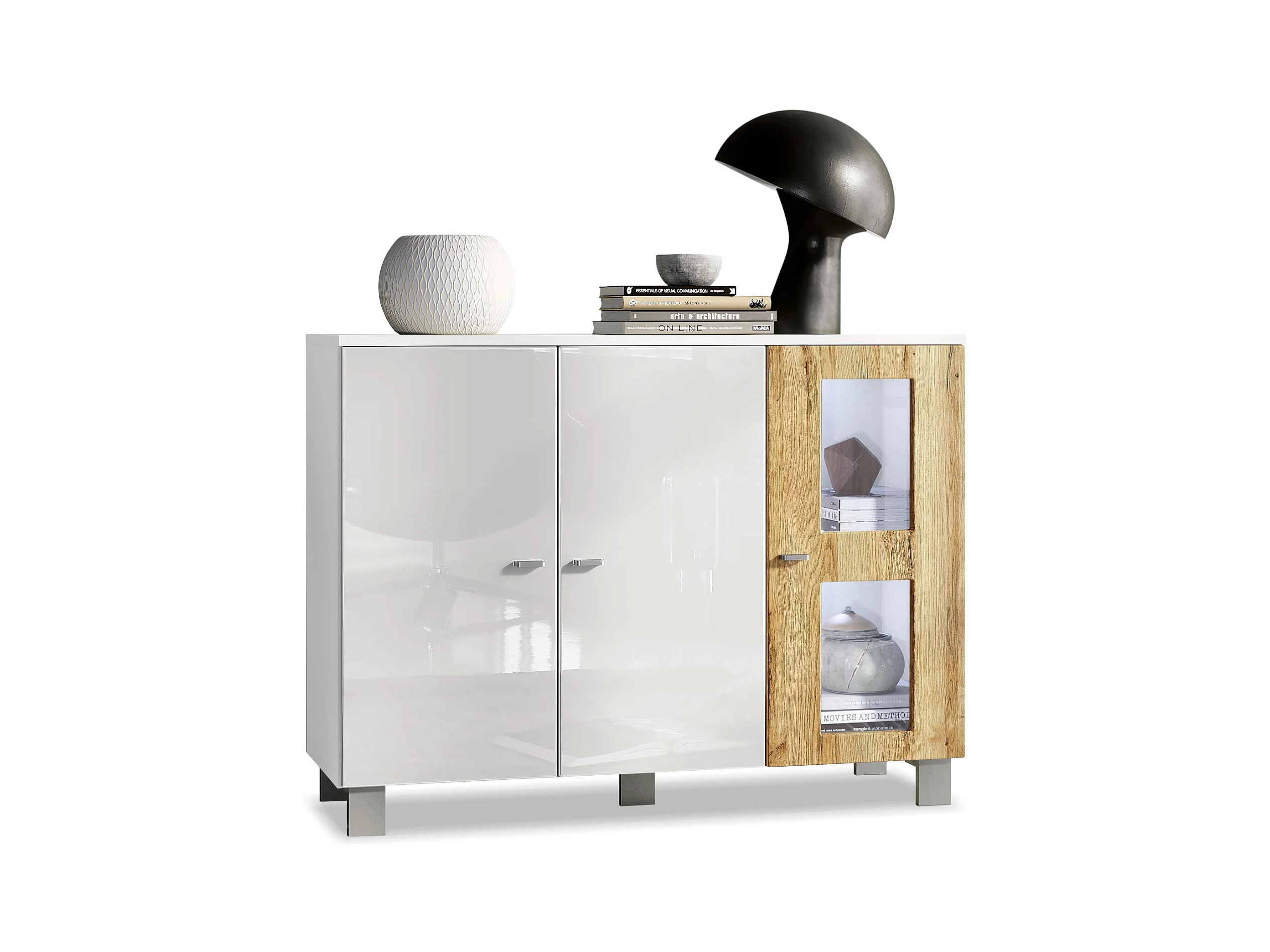 Buffet Denjo, Commode avec 3 portes, Blanc mat/Blanc haute brillance/Chêne Nature, éclairage LED inclus (107 x 81 x 35 cm)