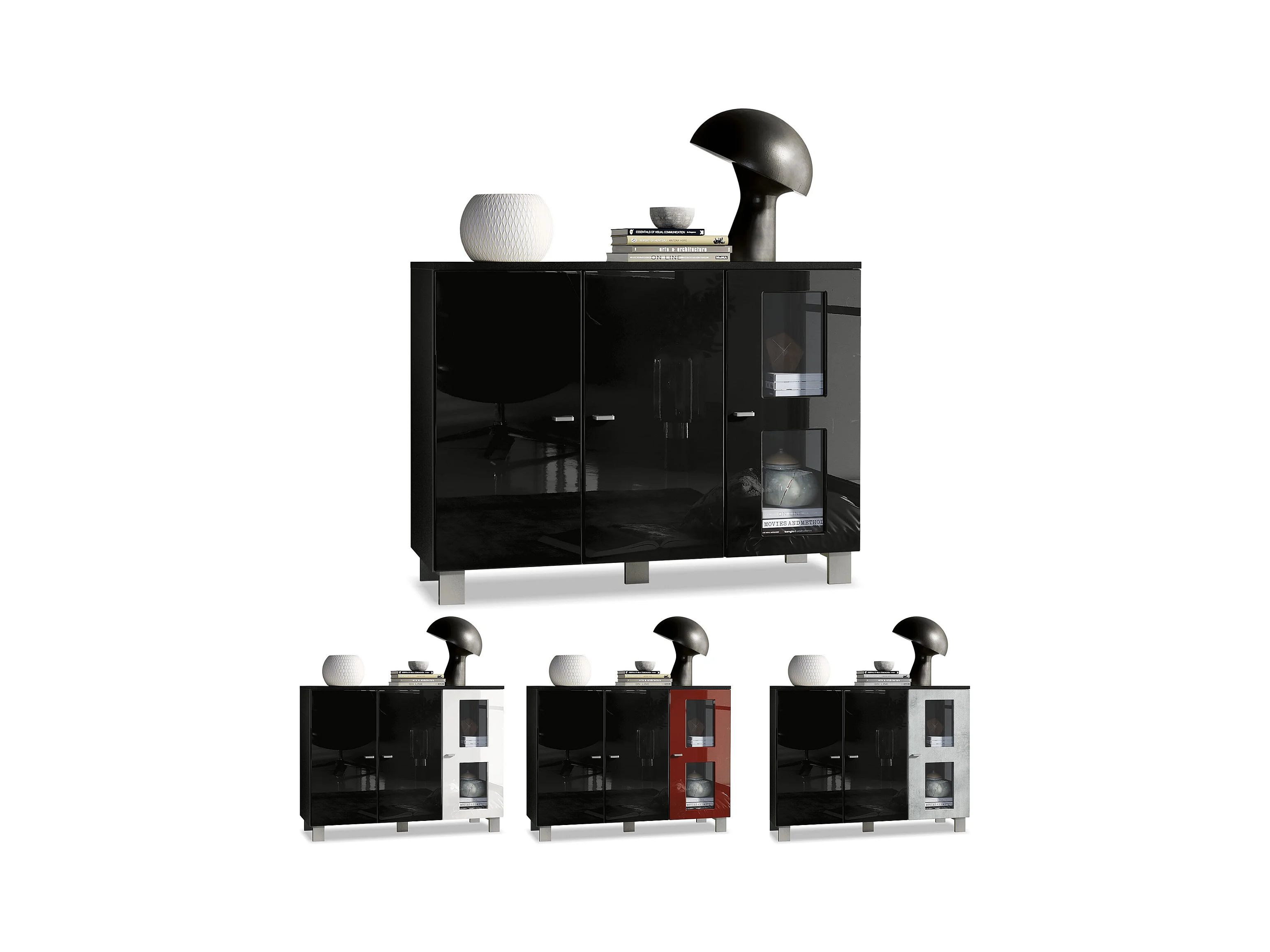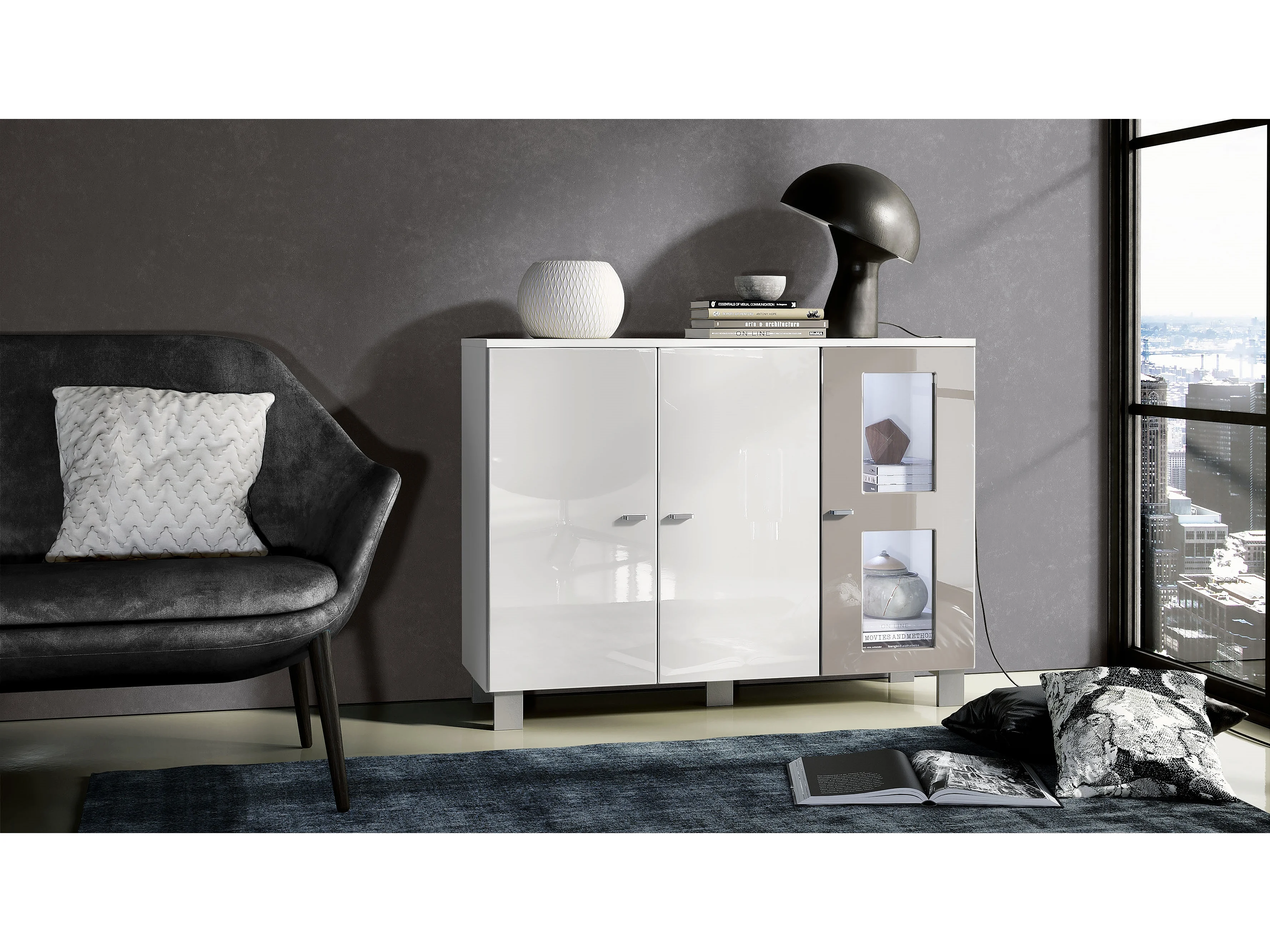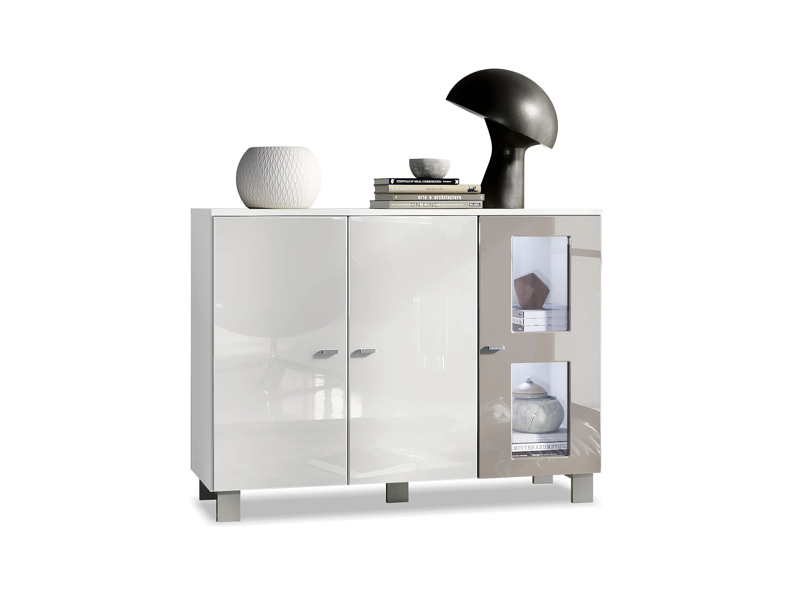 Buffet Denjo, Commode avec 3 portes, Blanc mat/Blanc haute brillance/Gris sable haute brillance, éclairage LED inclus (107 x 81 x 35 cm)