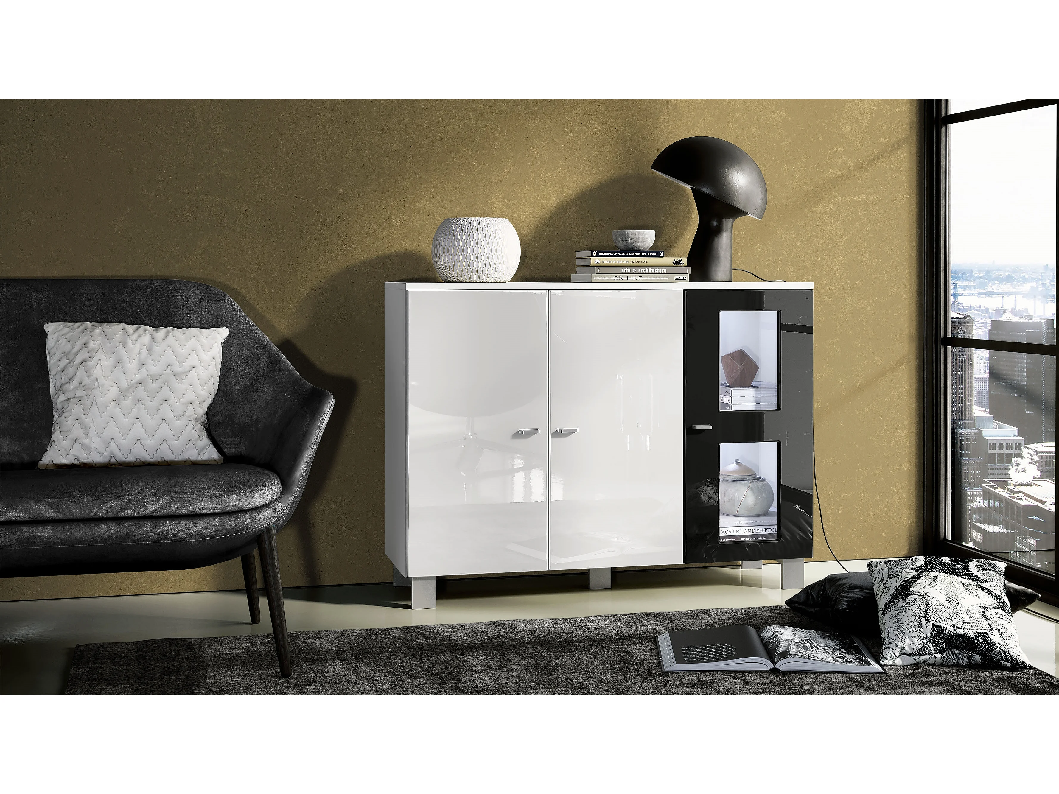 Buffet Denjo, Commode avec 3 portes, Blanc mat/Blanc haute brillance/Noir haute brillance, éclairage LED inclus (107 x 81 x 35 cm)
