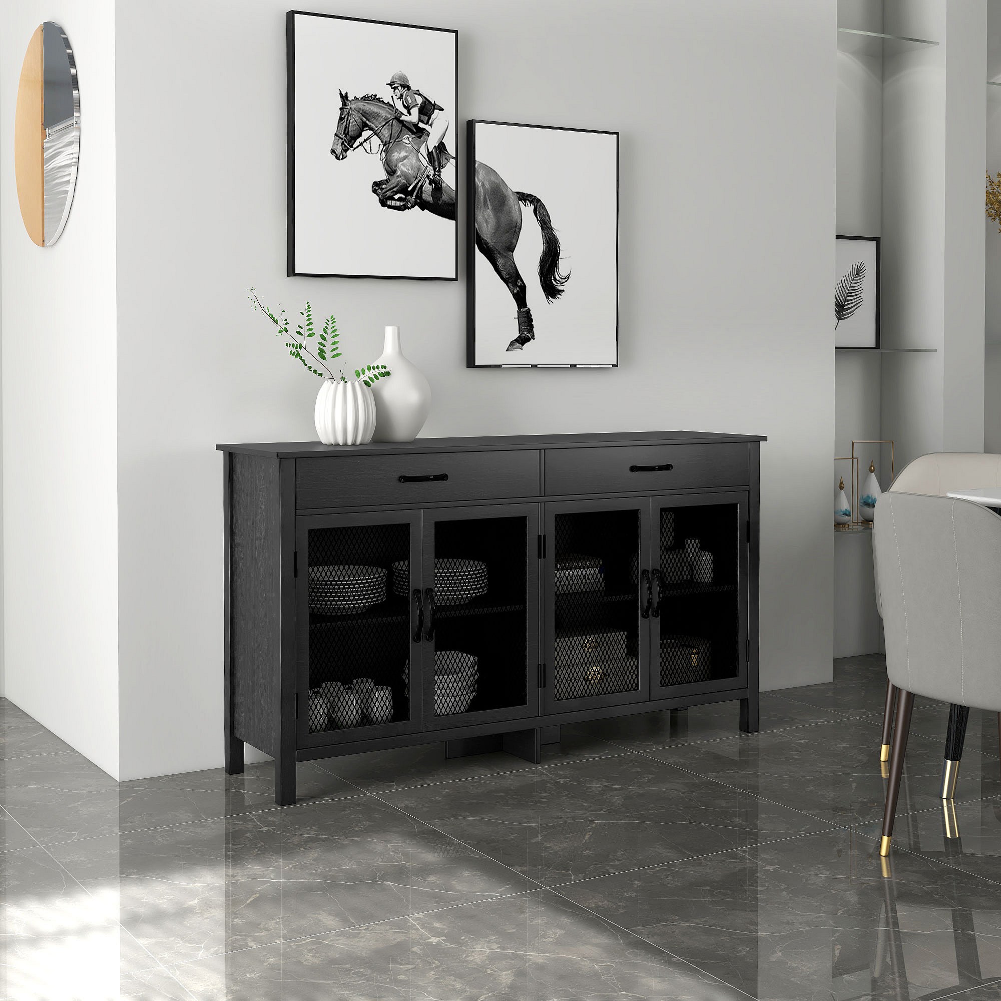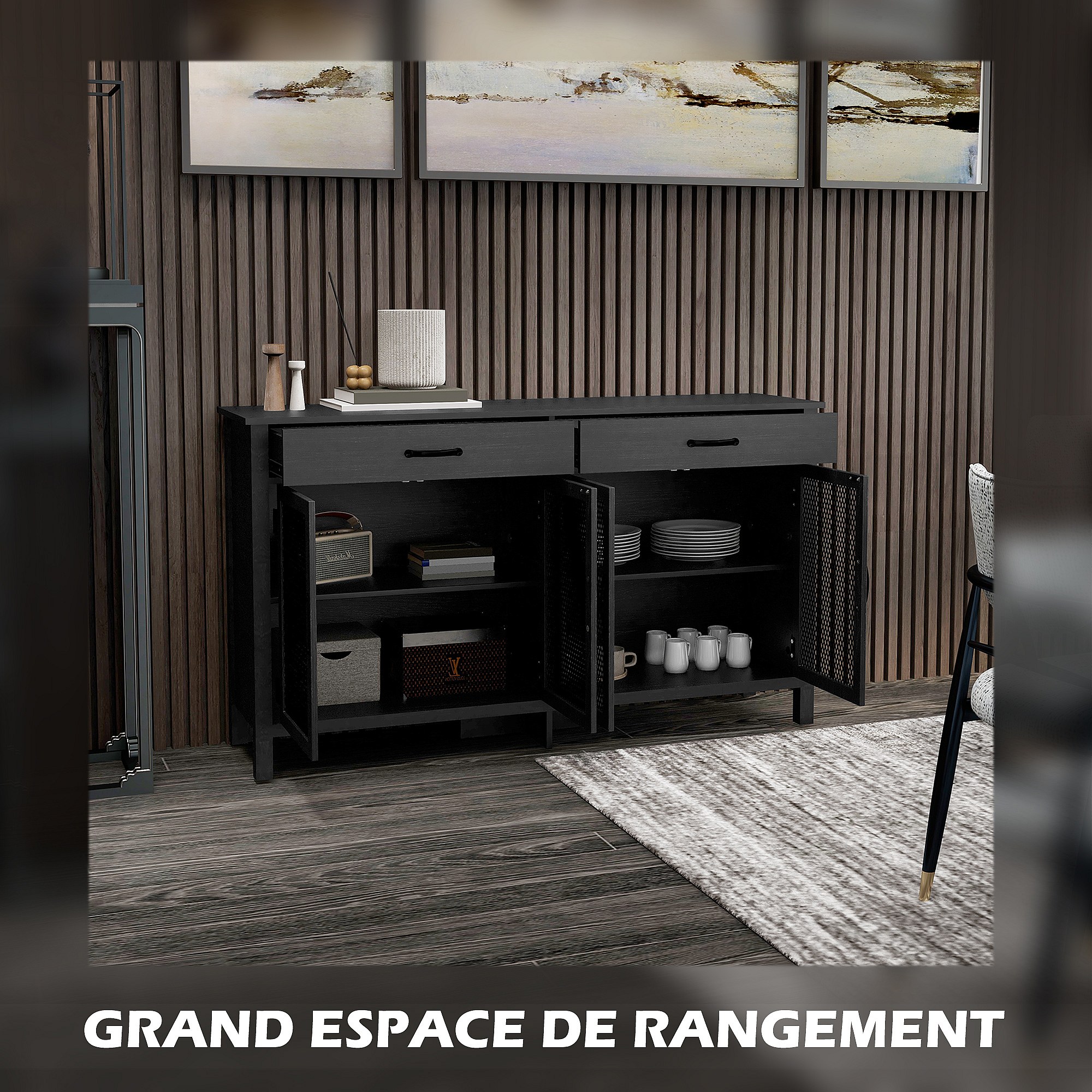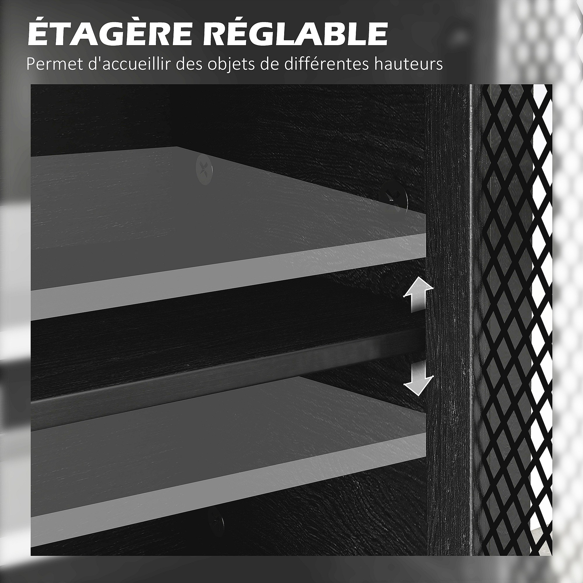 Buffet design industriel - 4 portes, 2 étagères réglables, 2 tiroirs - panneaux façades grillagées poignées métal noir