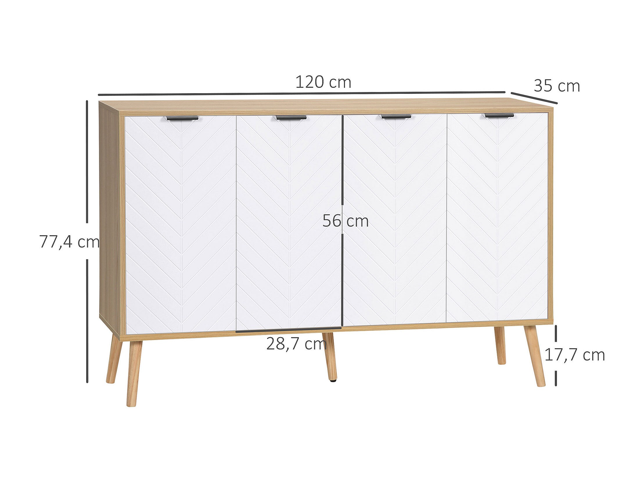 Buffet design scandinave 4 portes 2 étagères piètement bois de pin panneaux portes motif chevrons blanc aspect bois clair