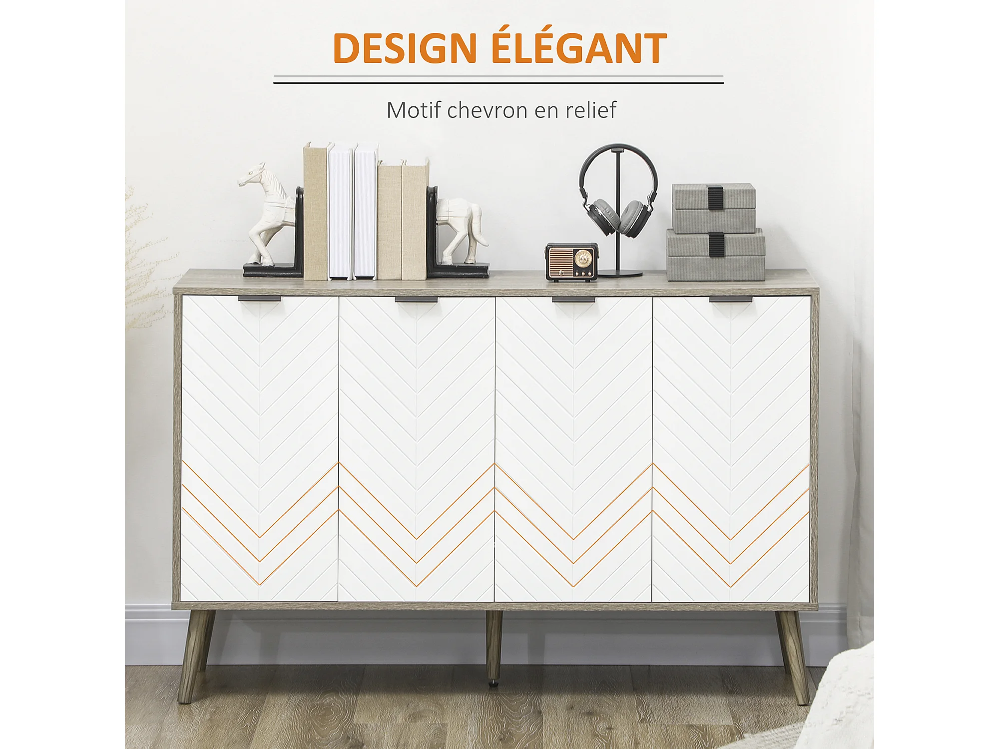 Buffet design scandinave 4 portes 2 étagères piètement bois de pin panneaux portes motif chevrons blanc aspect bois gris
