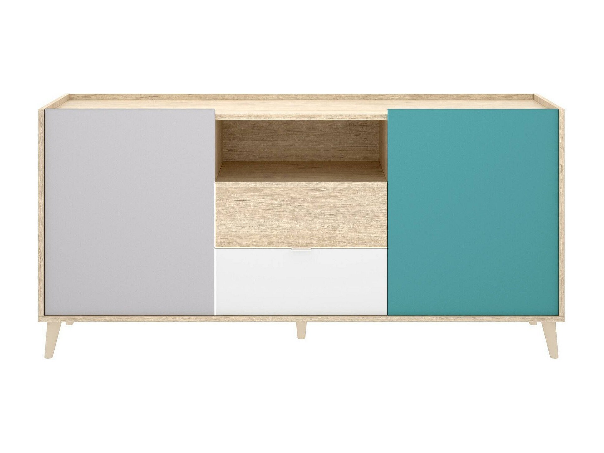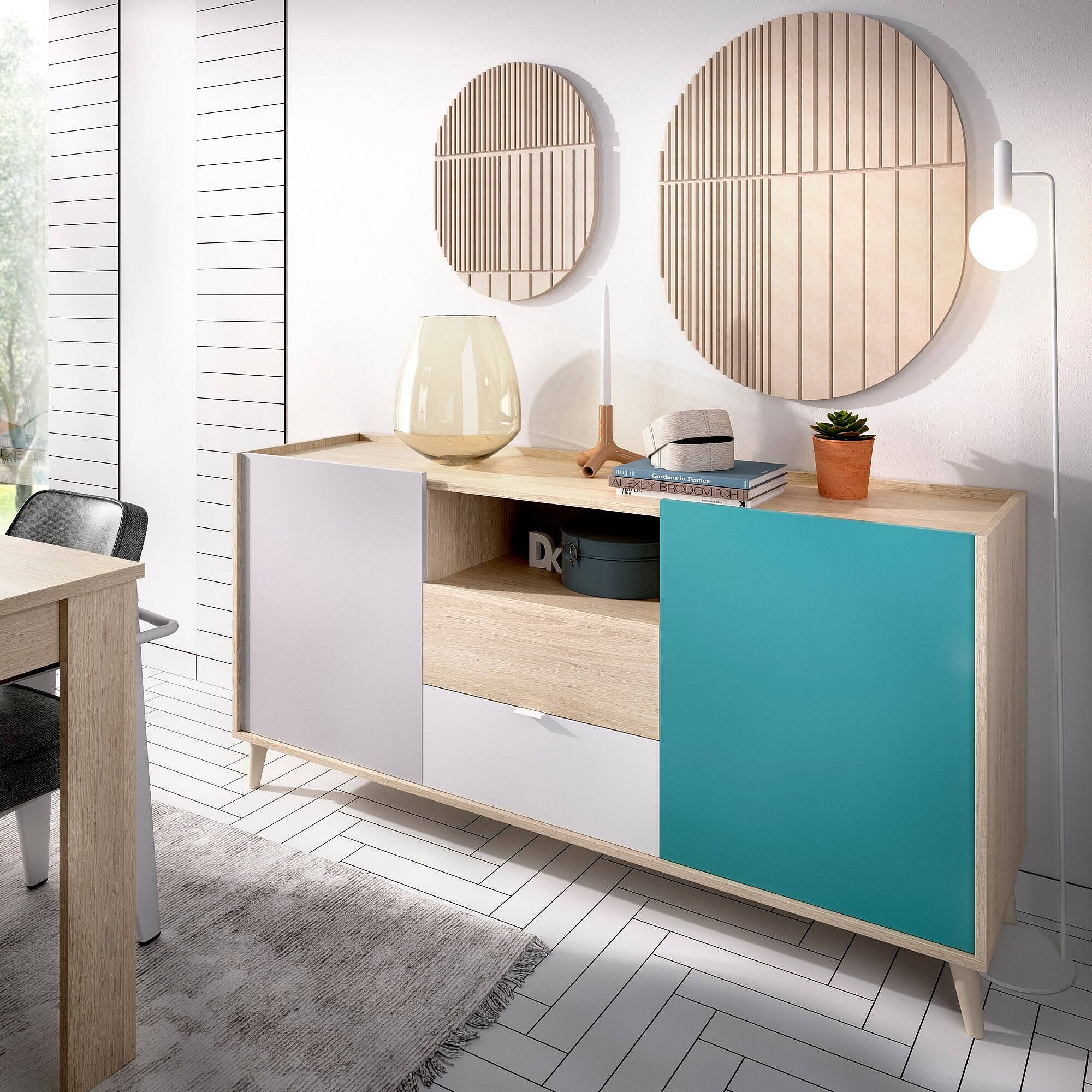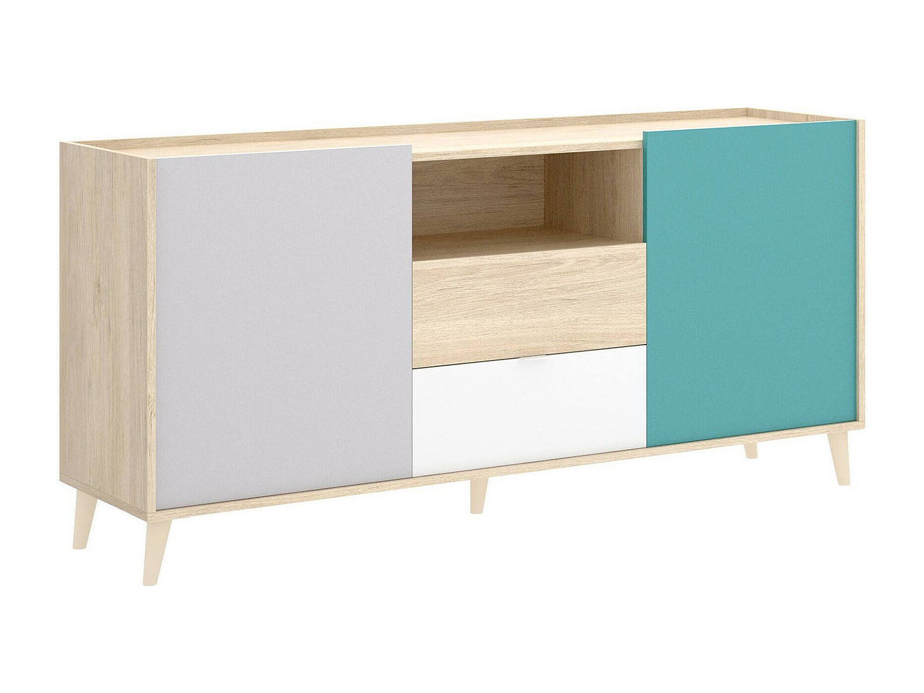 Buffet Dmaje, Buffet de salon, Buffet de salon moderne avec 2 portes, 155x43h75 cm, Blanc et Chêne