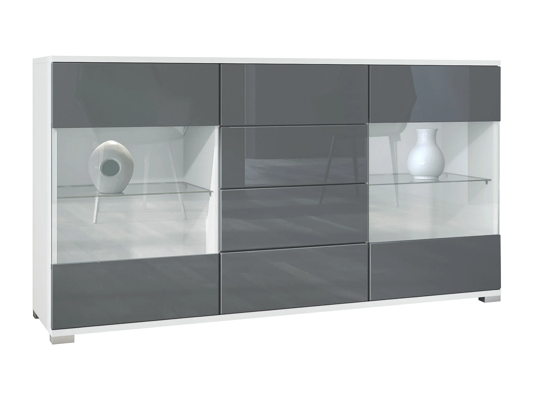 Buffet Bari V1 – Meuble avec 2 Grandes Portes et 4 Tiroirs, blanc mat/gris haute brillance (138,5 x 75,5 x 35)