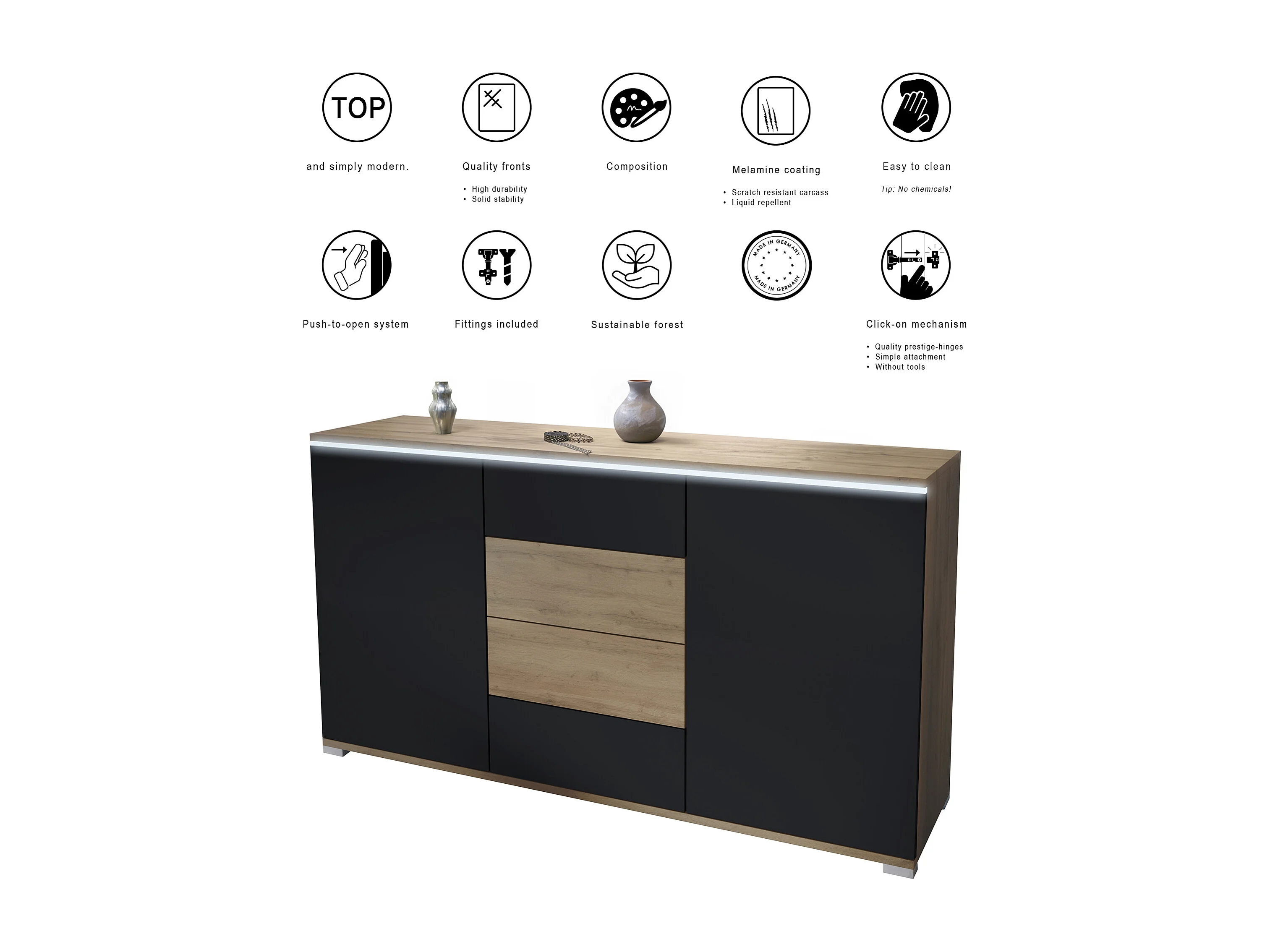 Buffet Faro V1 – Meuble avec 2 Portes & 4 Tiroirs, Armoire avec Bande LED Lumineuse, Chêne Evoke / anthracite mat (138,5 x 75,5 x 35)
