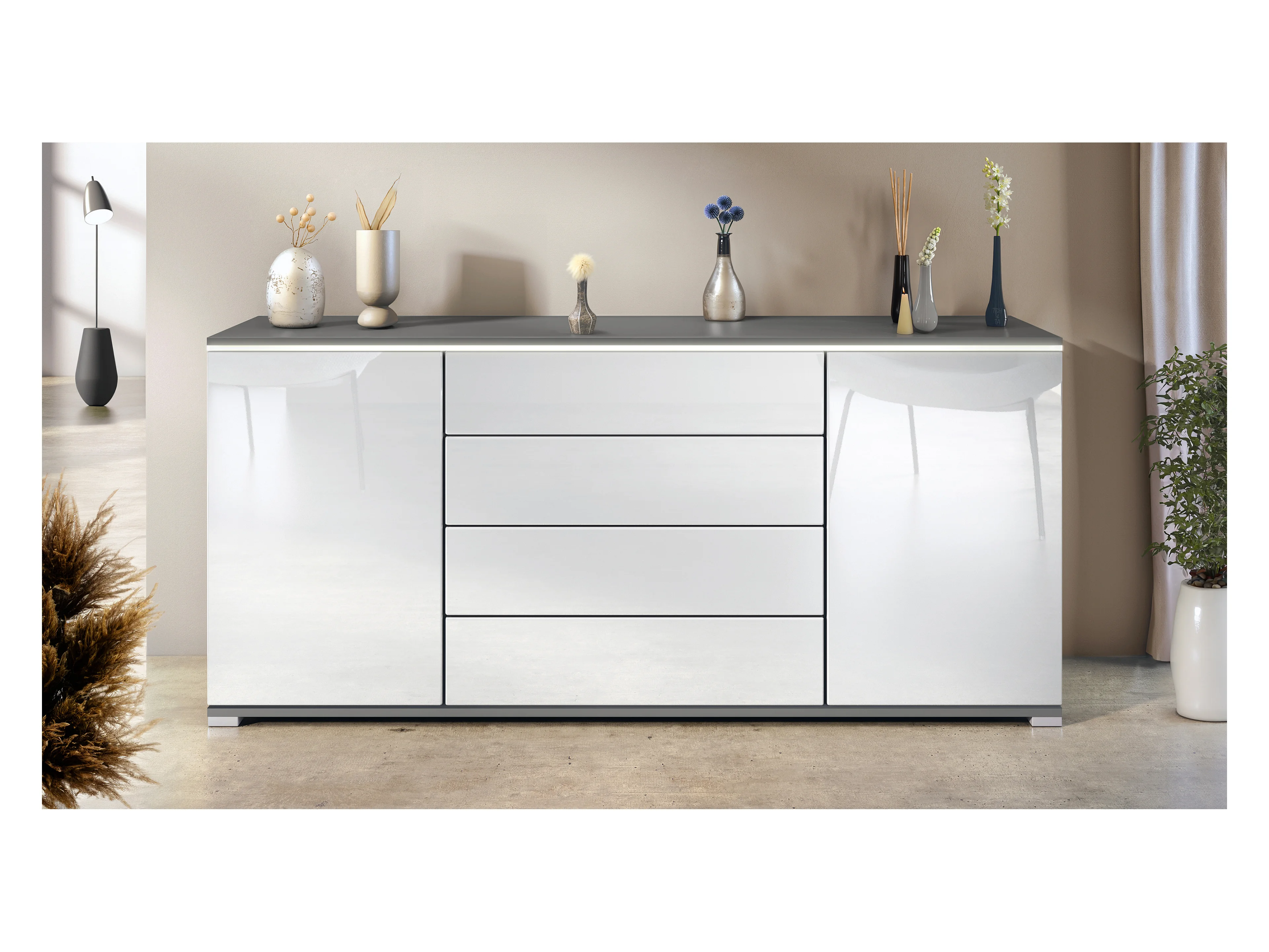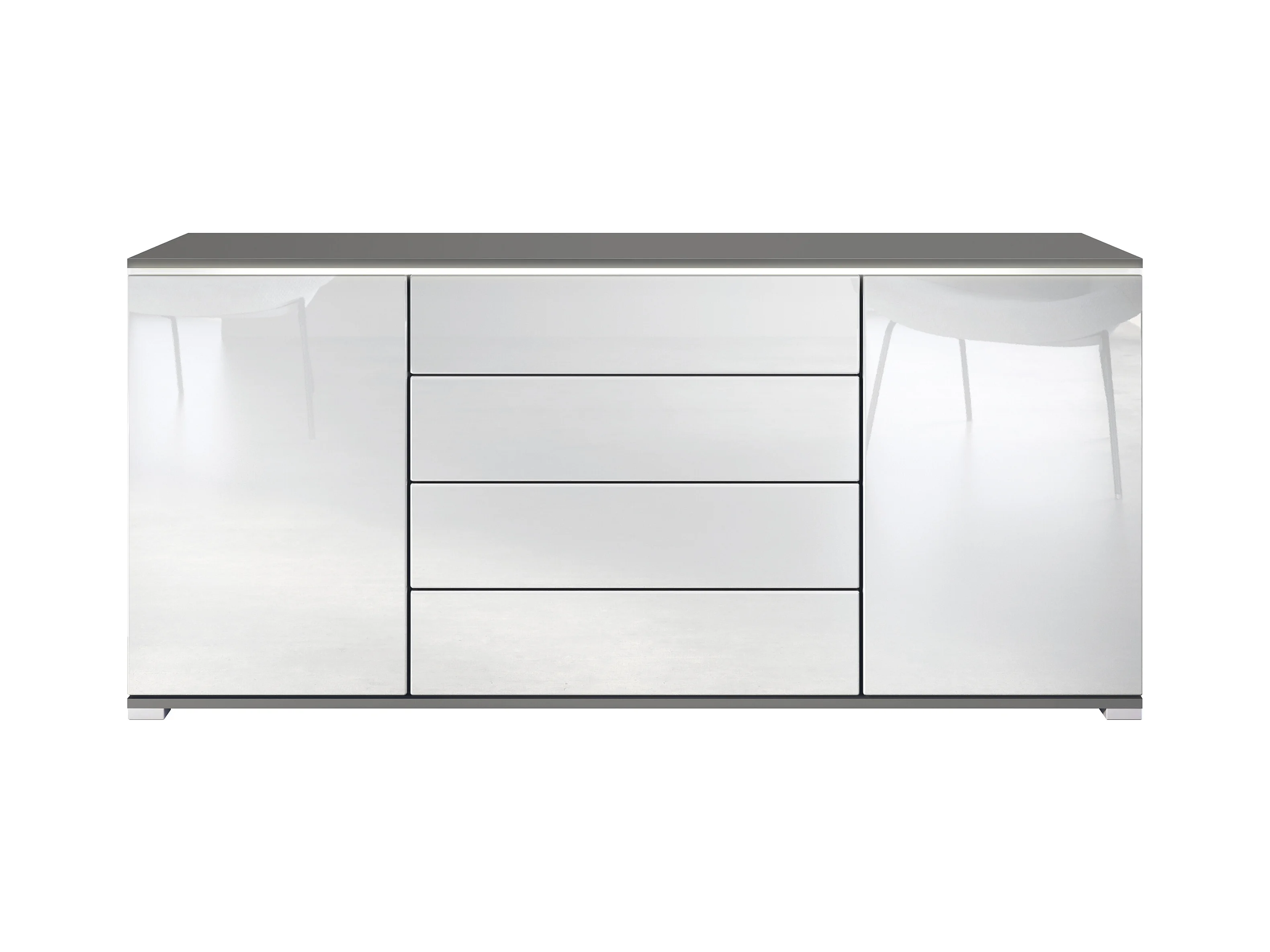 Buffet Faro V2 – Meuble avec 2 Portes & 4 Tiroirs, Armoire avec Bande LED Lumineuse, anthracite mat / blanc haute brillance (166,5 x 75,5 x 35)