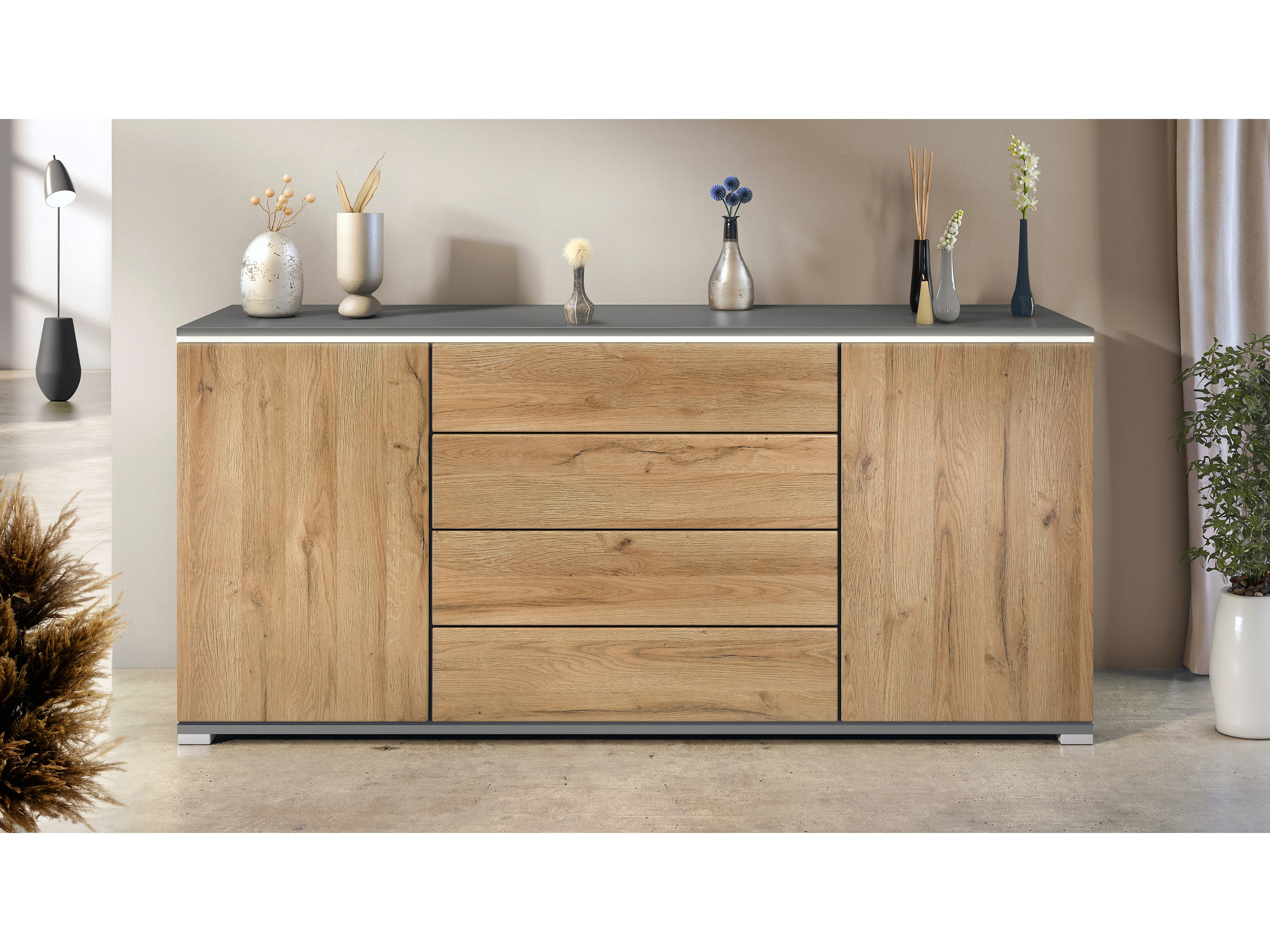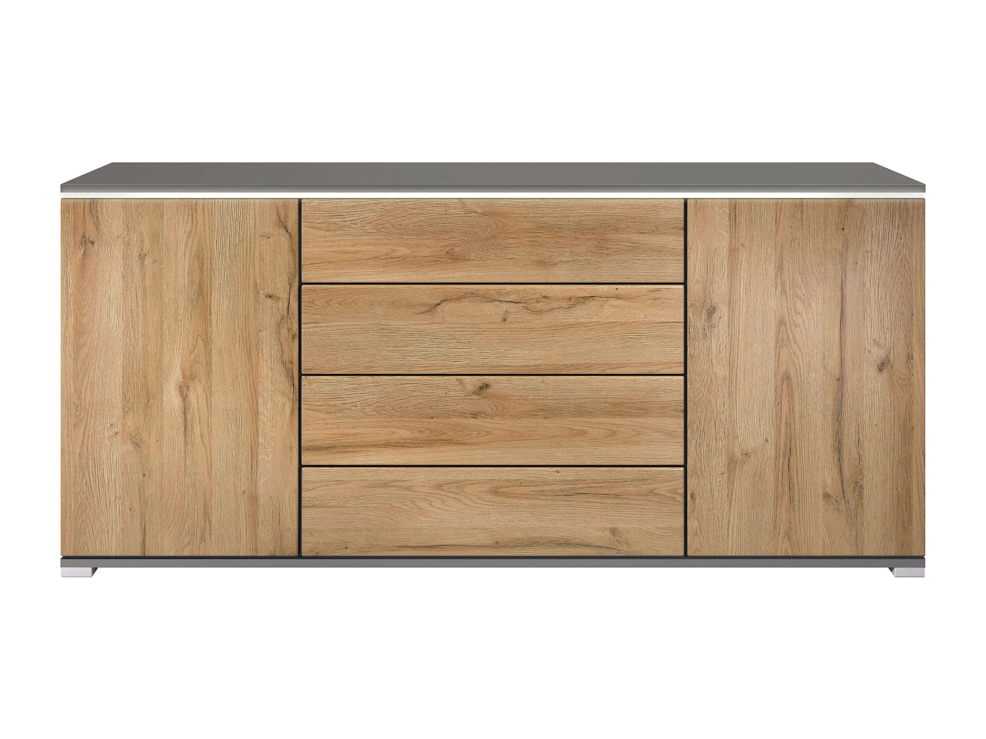 Buffet Faro V2 – Meuble avec 2 Portes & 4 Tiroirs, Armoire avec Bande LED Lumineuse, anthracite mat / chêne nature (166,5 x 75,5 x 35)