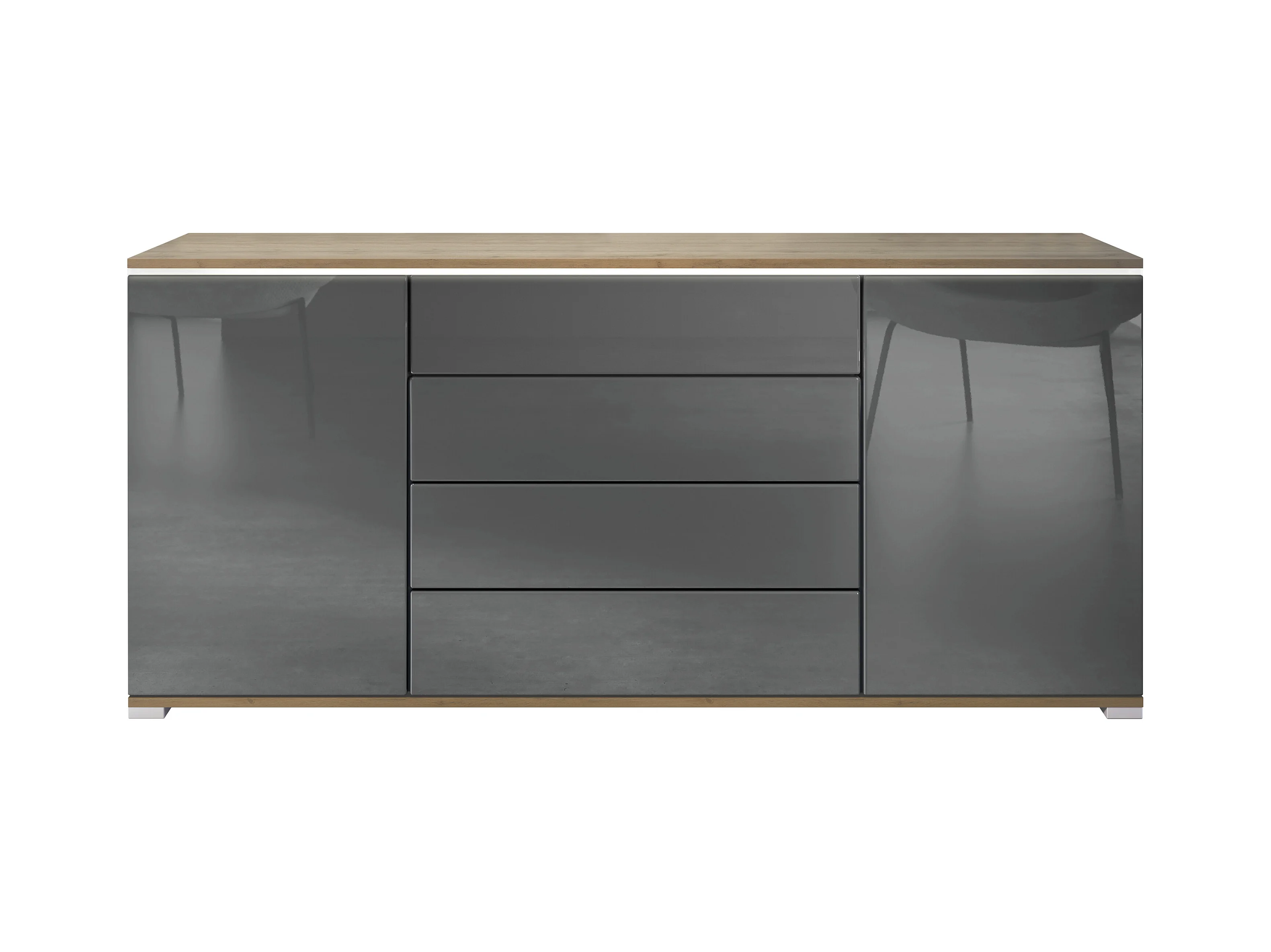 Buffet Faro V2 – Meuble avec 2 Portes & 4 Tiroirs, Armoire avec Bande LED Lumineuse, Chêne Evoke / gris haute brillance (166,5 x 75,5 x 35)