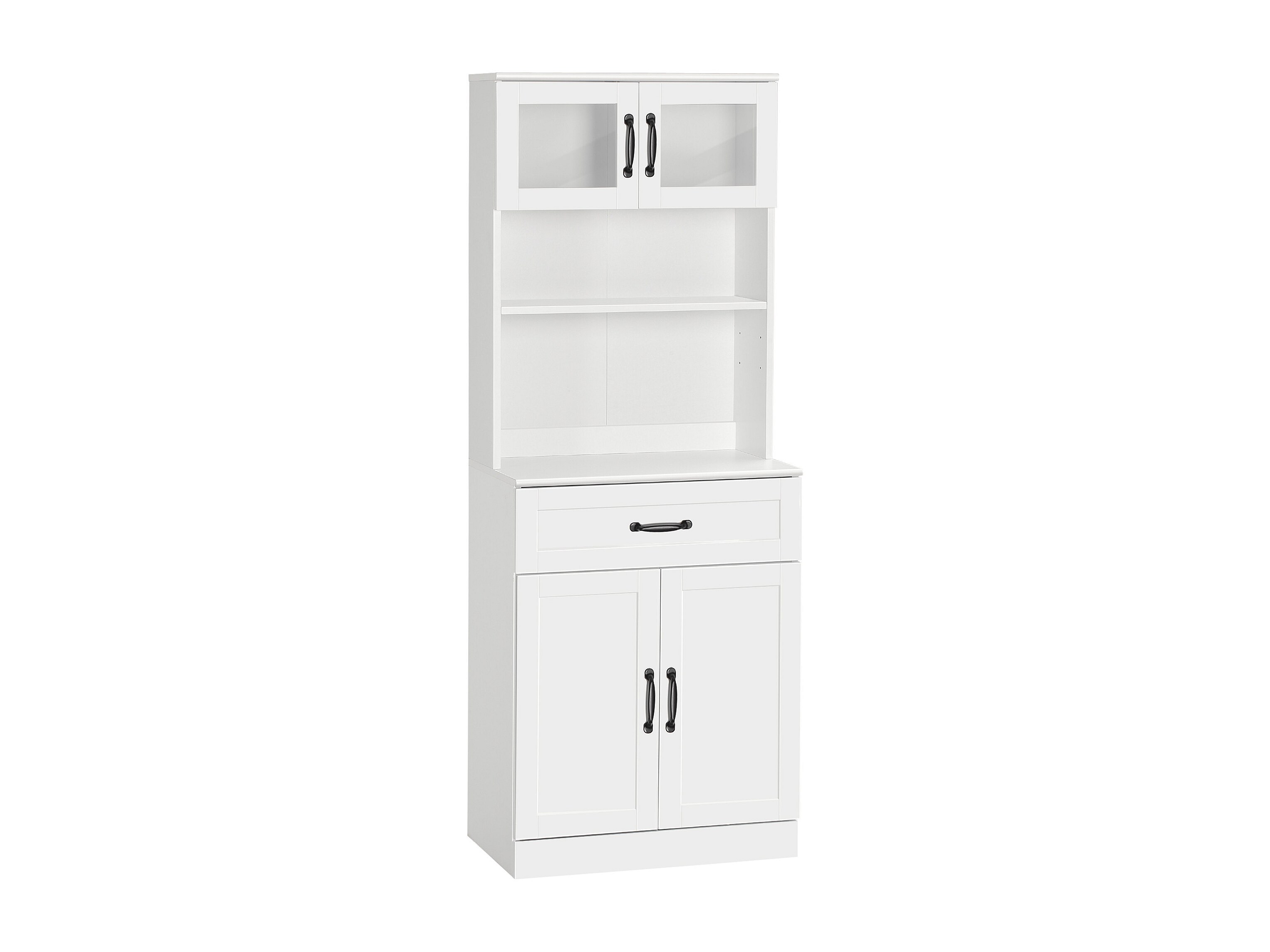 Buffet haut 4 portes étagère niche tiroir coulissant plan de travail poignées métal noir verre trempé MDF blanc