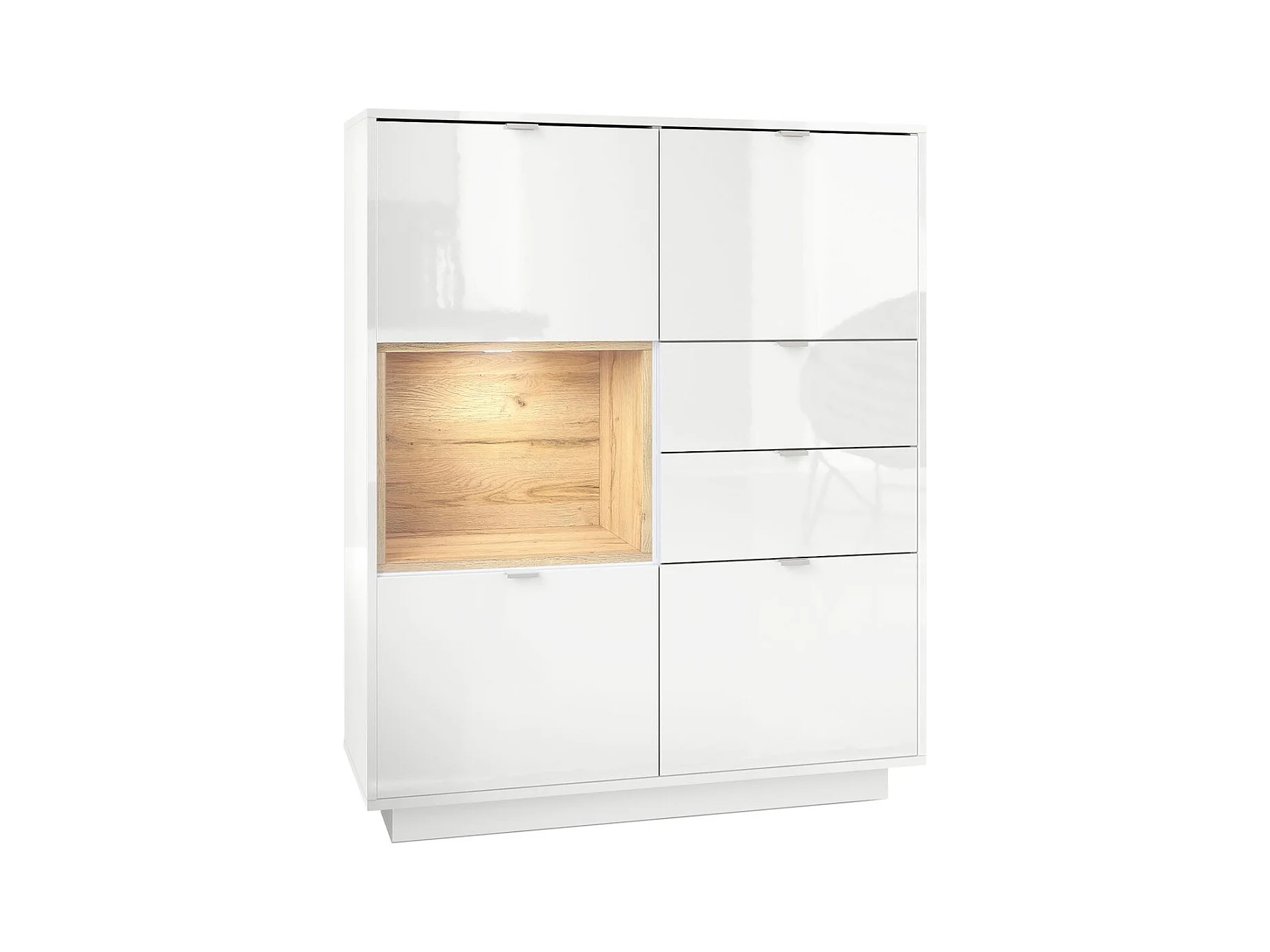 Buffet haut Armoire Metro, Corps en Blanc haute brillance / Façades en Blanc haute brillance avec une insertion en Chêne Nature, incl. L'éclairage LED