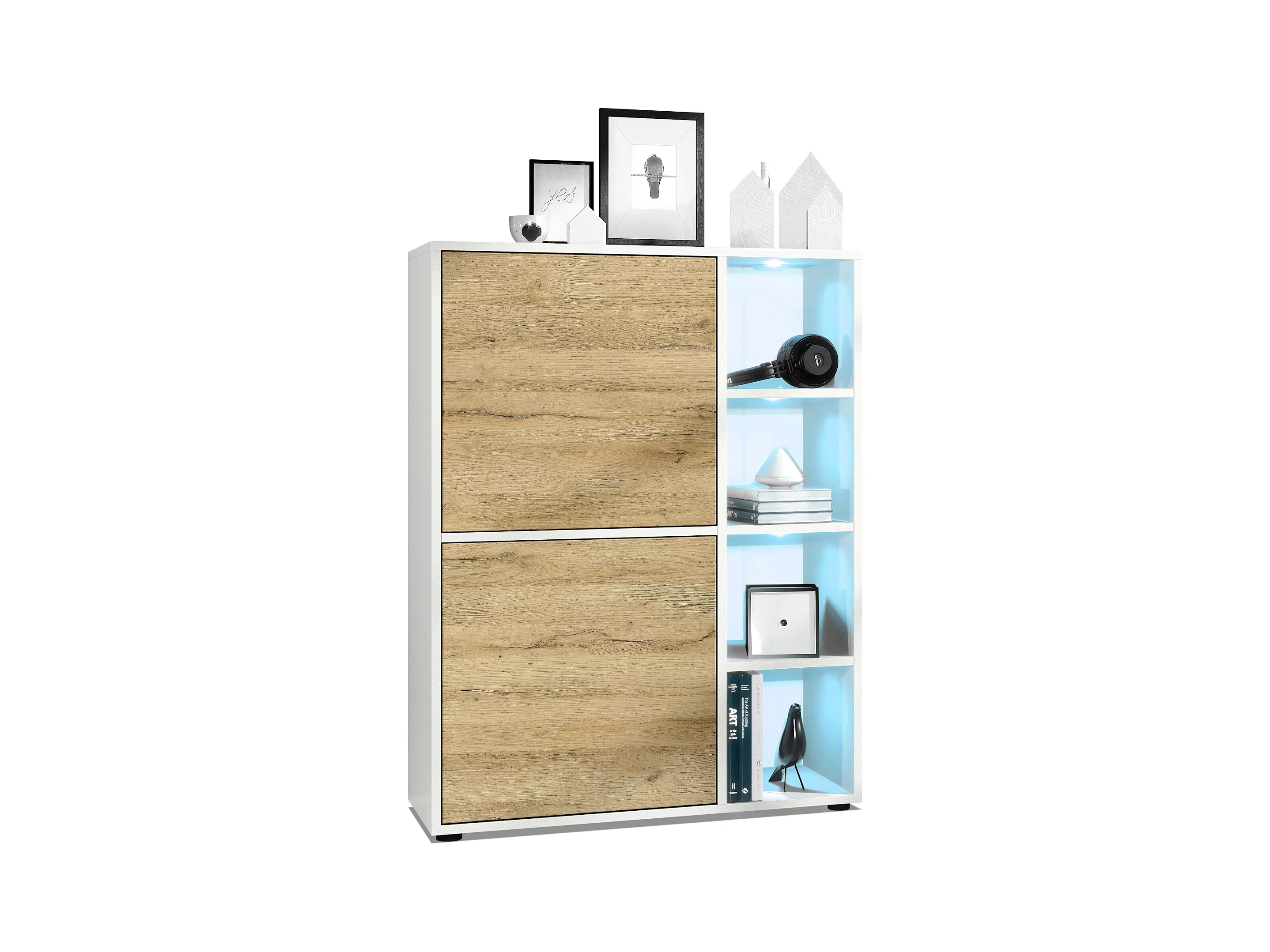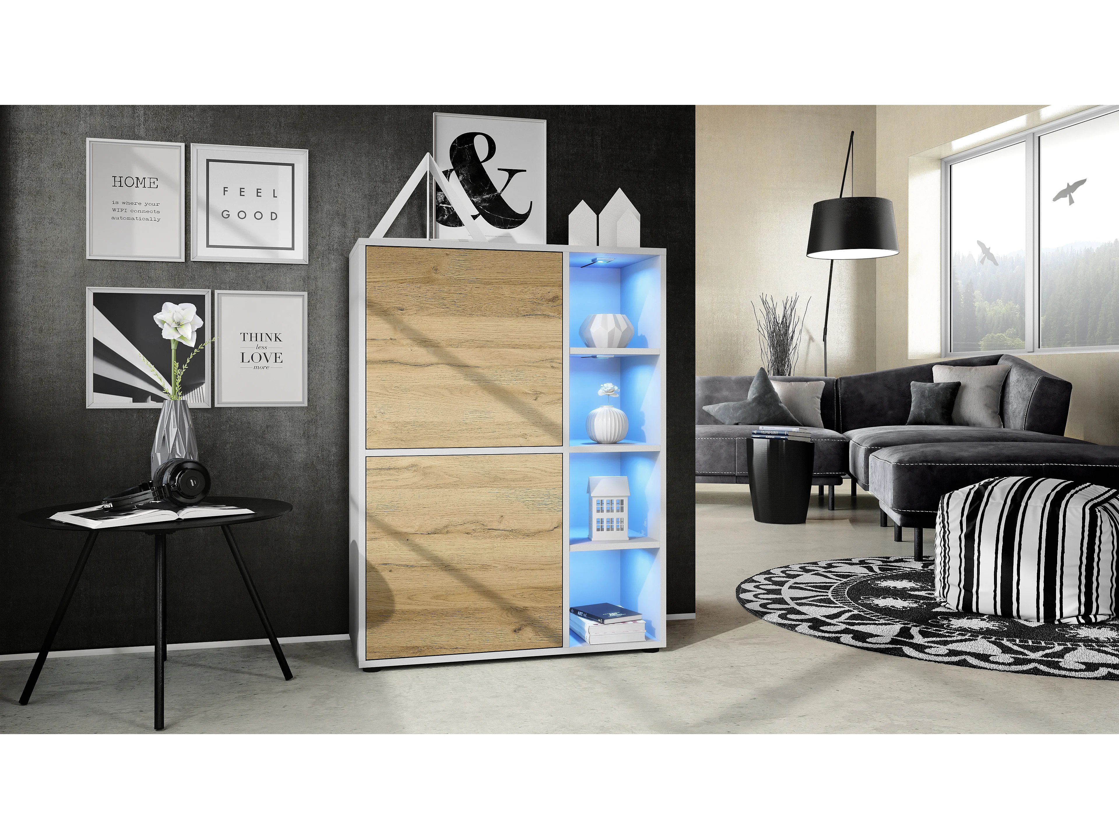 Buffet haut Cuba avec 8 compartiments, caisson en blanc mat / Façades en Chêne Nature avec éclairage LED RGB
