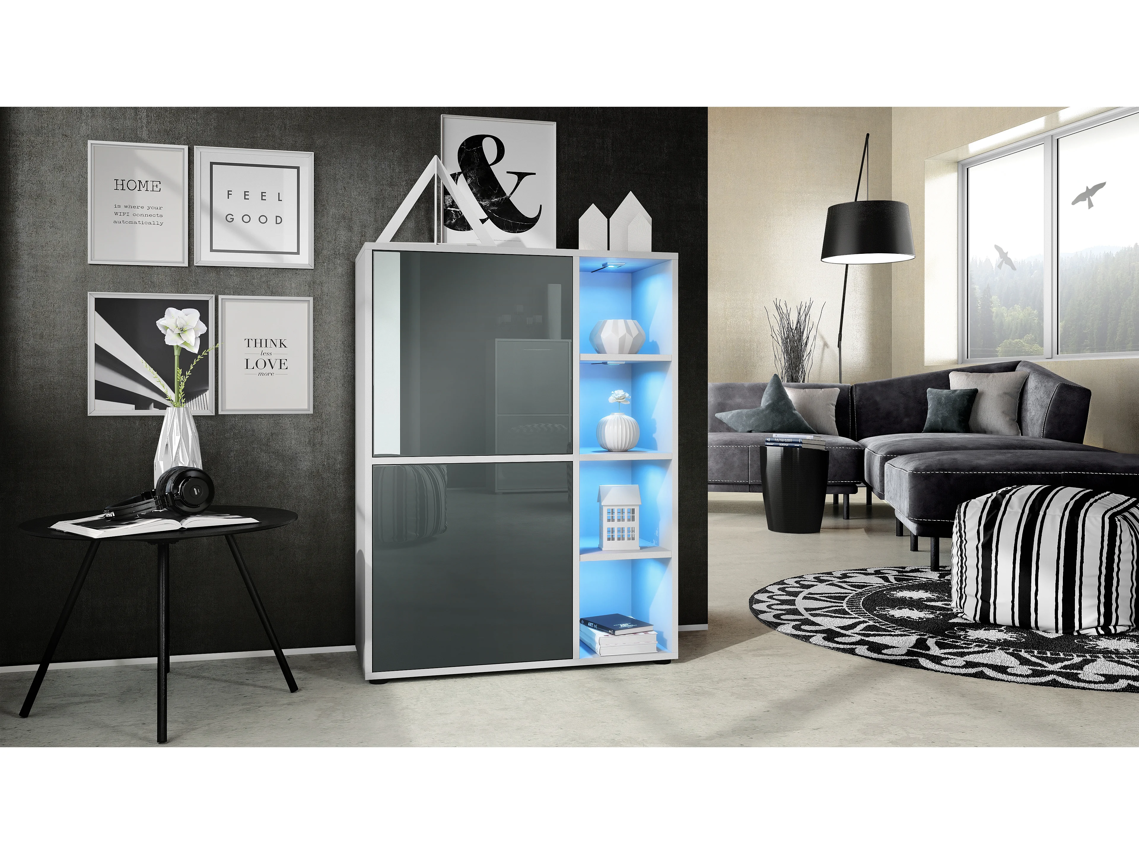 Buffet haut Cuba avec 8 compartiments, caisson en blanc mat / Façades en Gris laqué haute brillance avec éclairage LED RGB