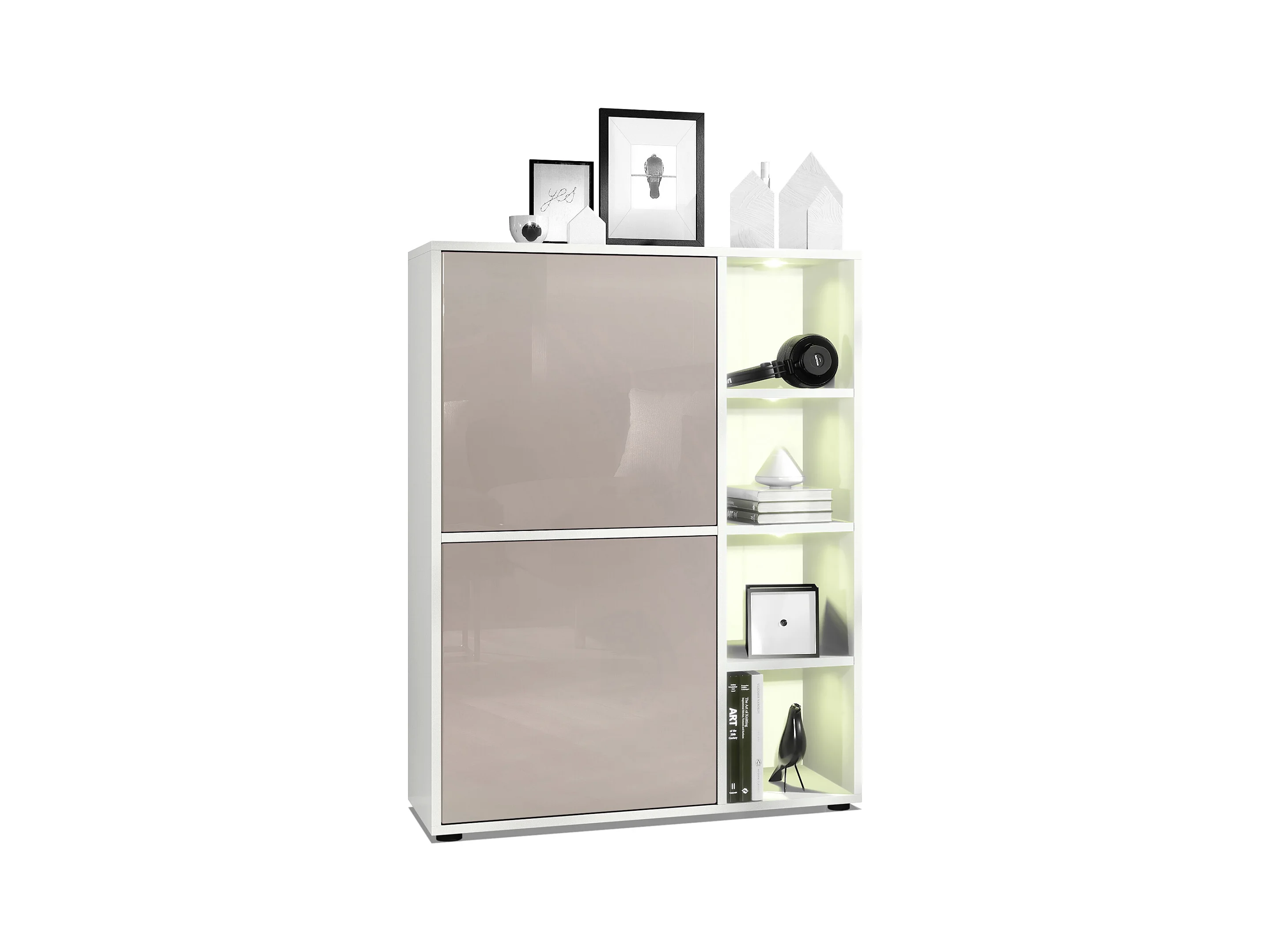 Buffet haut Cuba avec 8 compartiments, caisson en blanc mat / Façades en Gris sable laqué haute brillance avec éclairage LED RGB