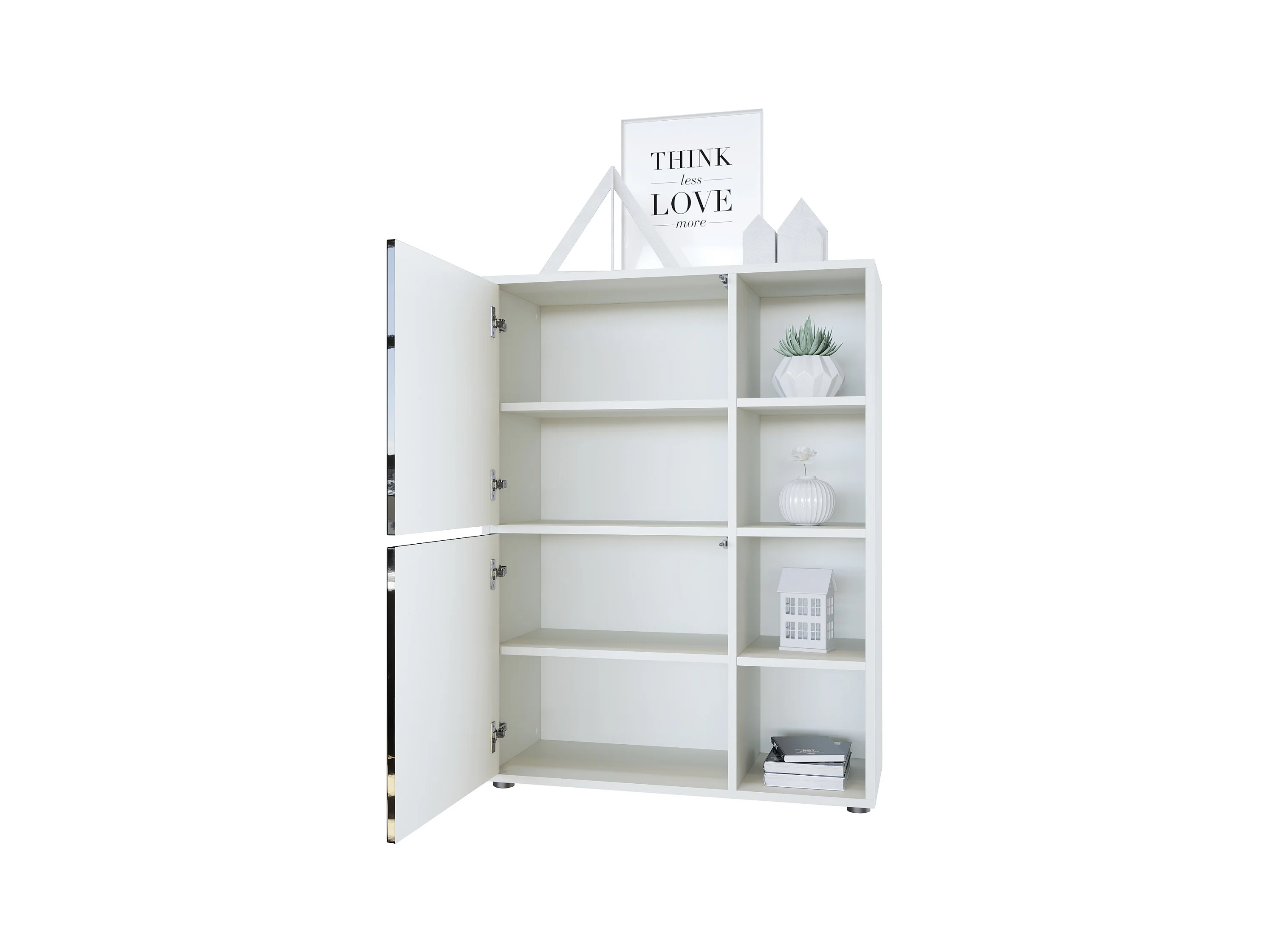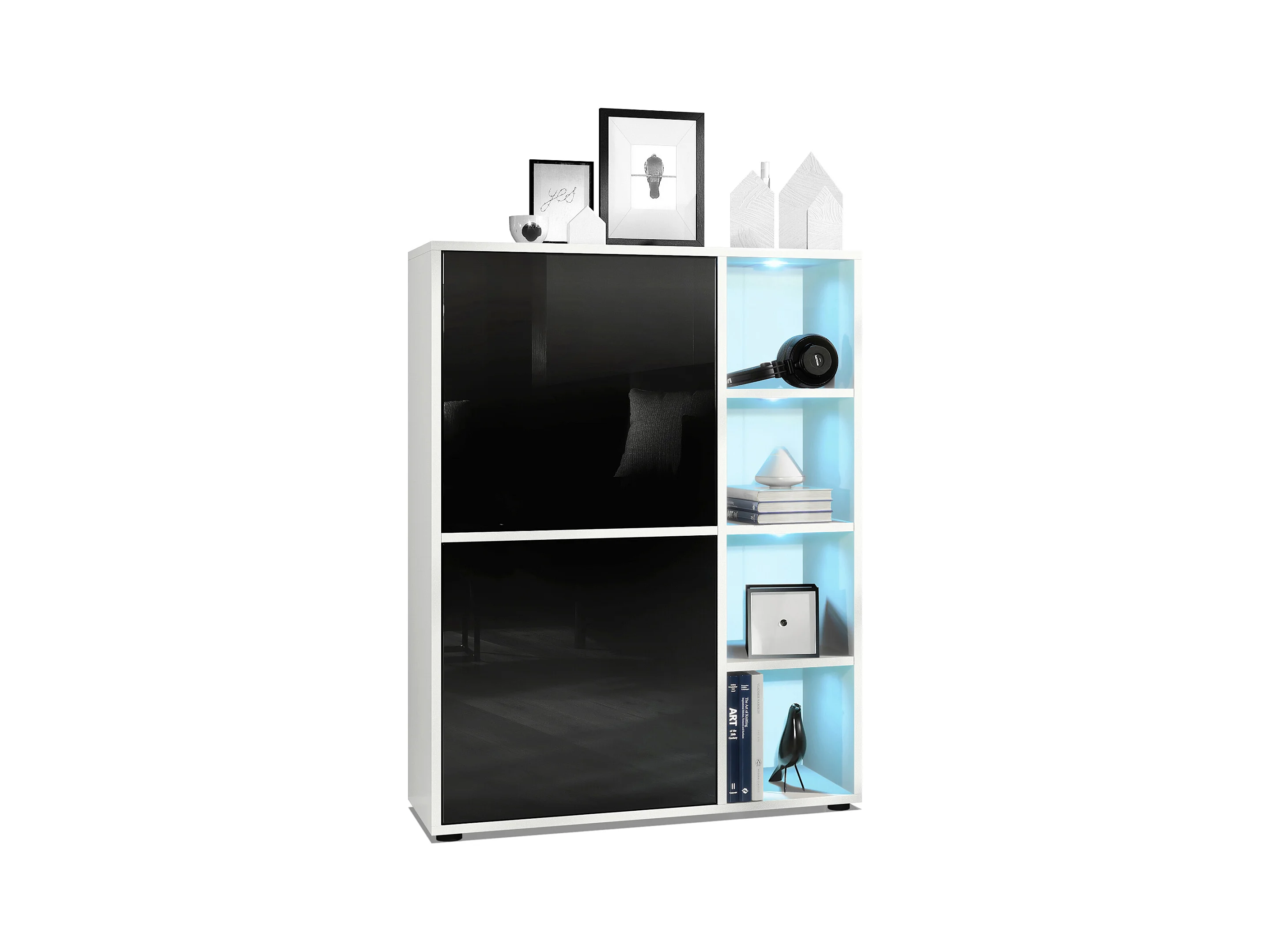 Buffet haut Cuba avec 8 compartiments, caisson en blanc mat / Façades en Noir laqué haute brillance avec éclairage LED RGB
