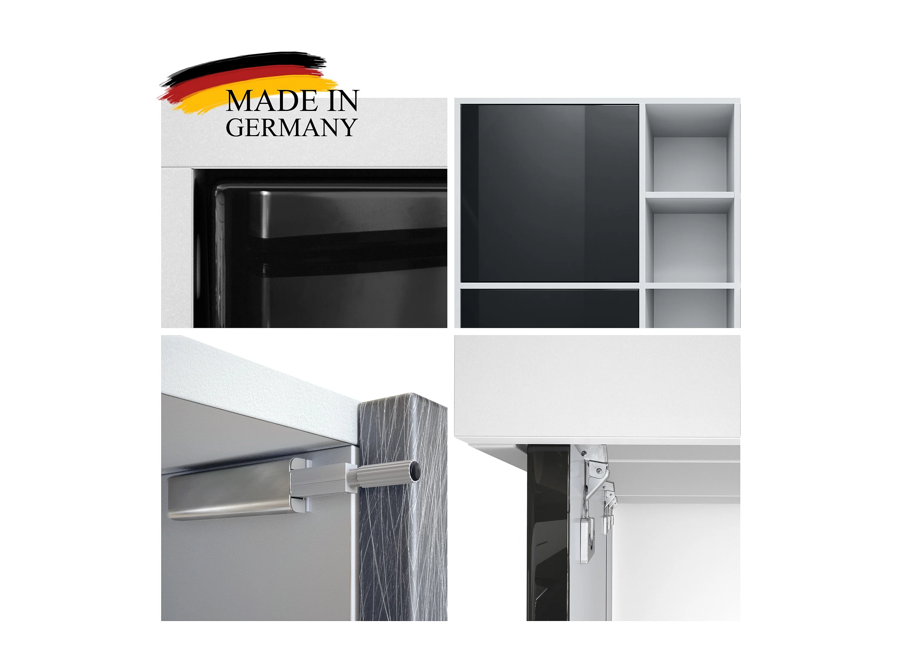 Buffet haut Cuba avec 8 compartiments, caisson en noir mat / Façades en Blanc laqué haute brillance avec éclairage LED RGB