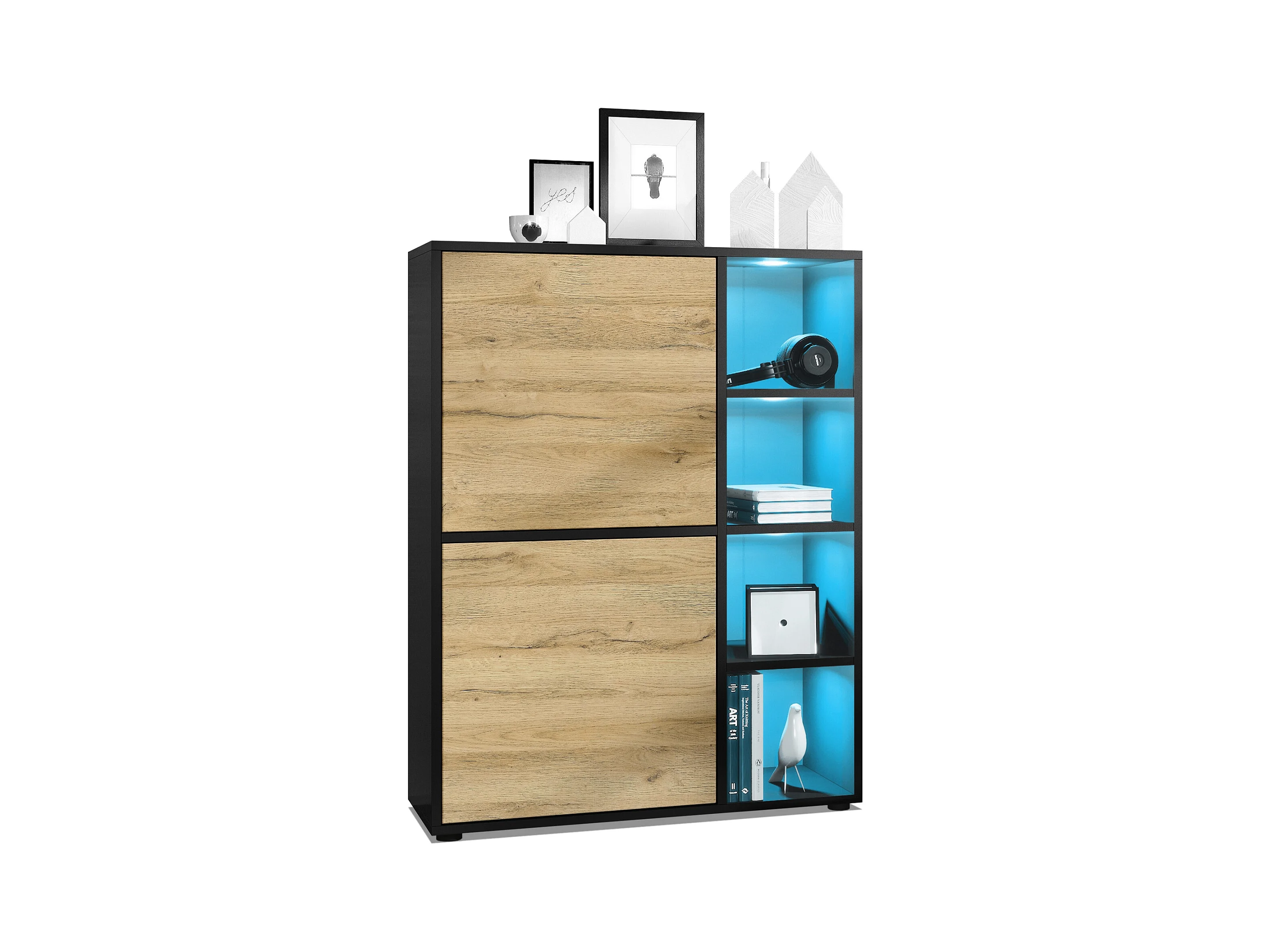 Buffet haut Cuba avec 8 compartiments, caisson en noir mat / Façades en Chêne Nature avec éclairage LED RGB