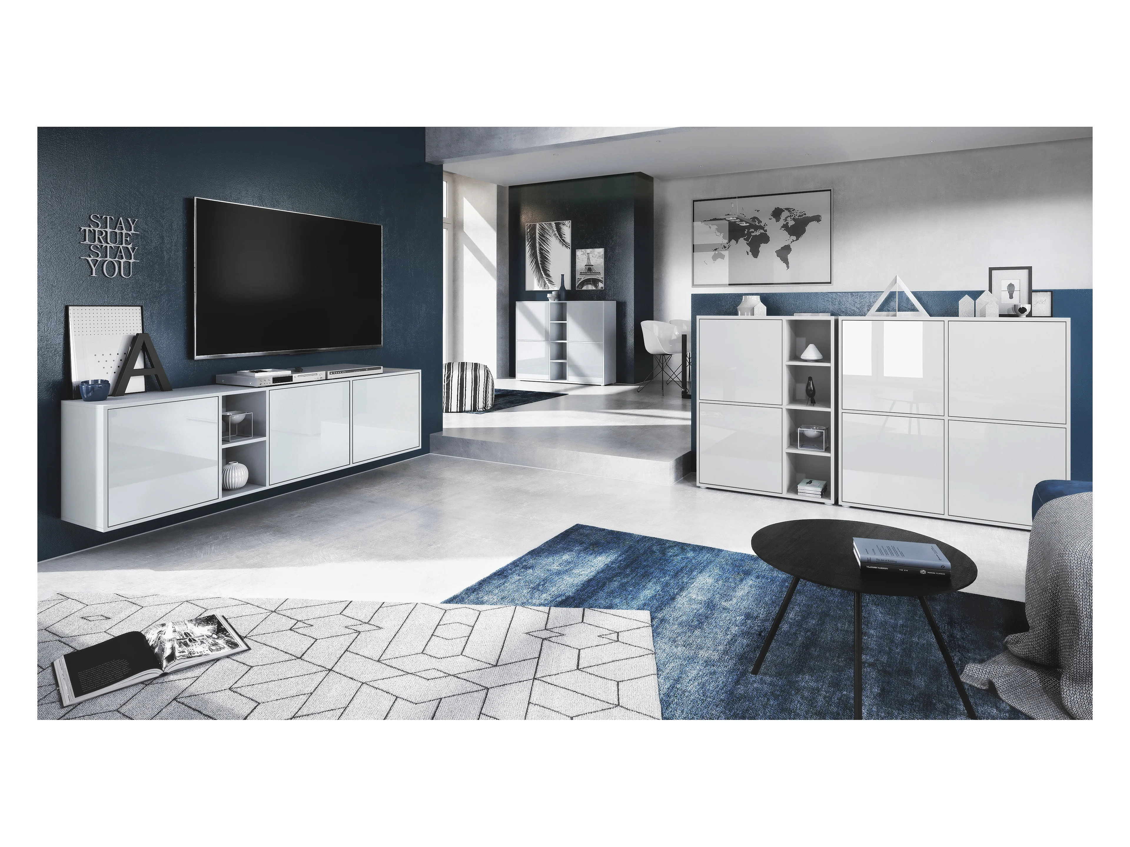 Buffet haut Cuba avec 8 compartiments, caisson en noir mat / Façades en Gris clair satiné mat avec éclairage LED RGB