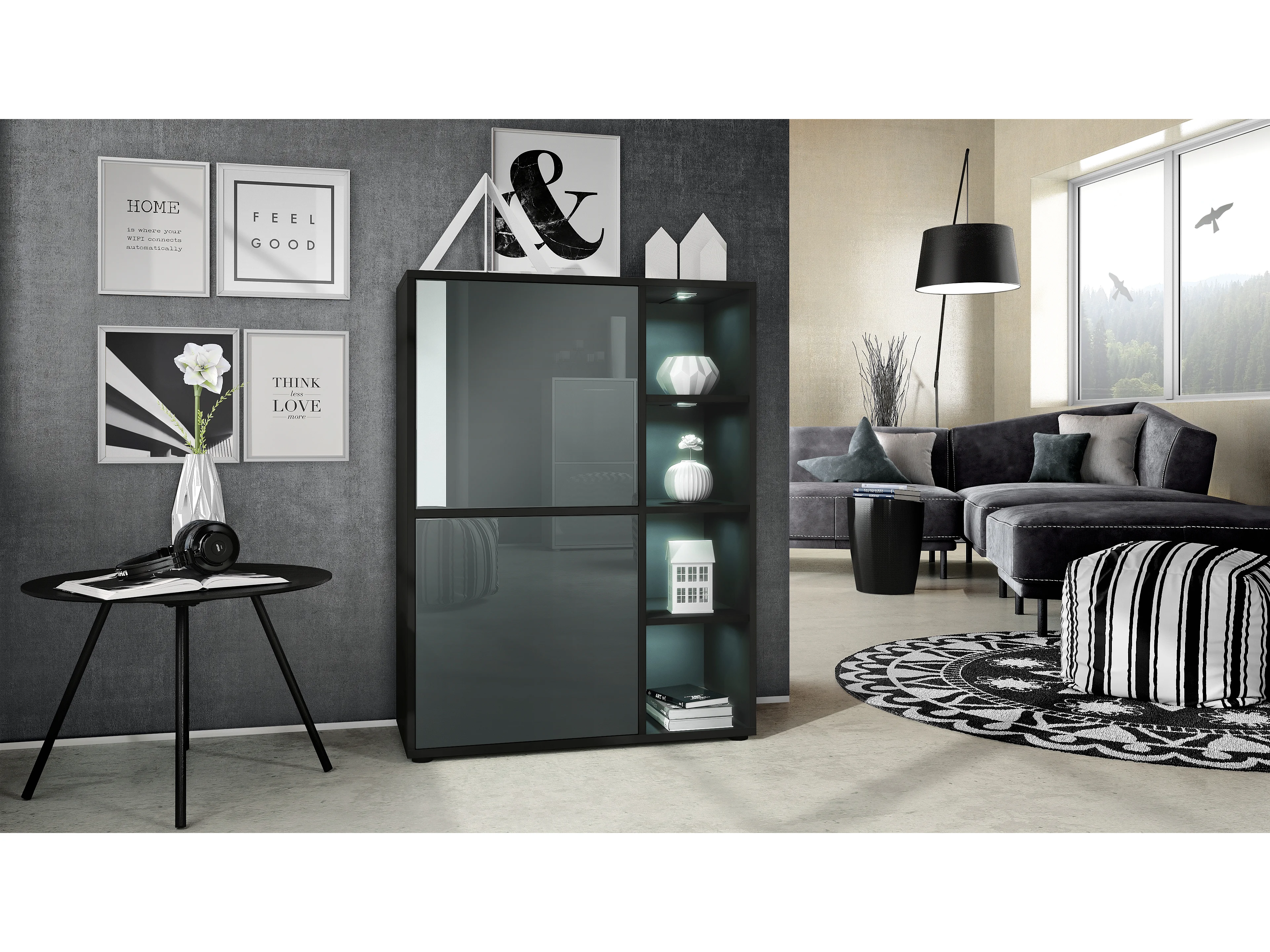 Buffet haut Cuba avec 8 compartiments, caisson en noir mat / Façades en Gris laqué haute brillance avec éclairage LED RGB