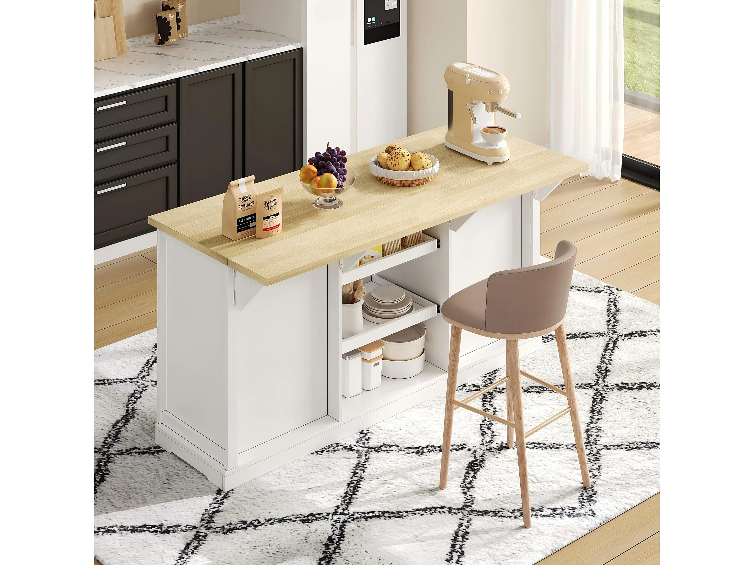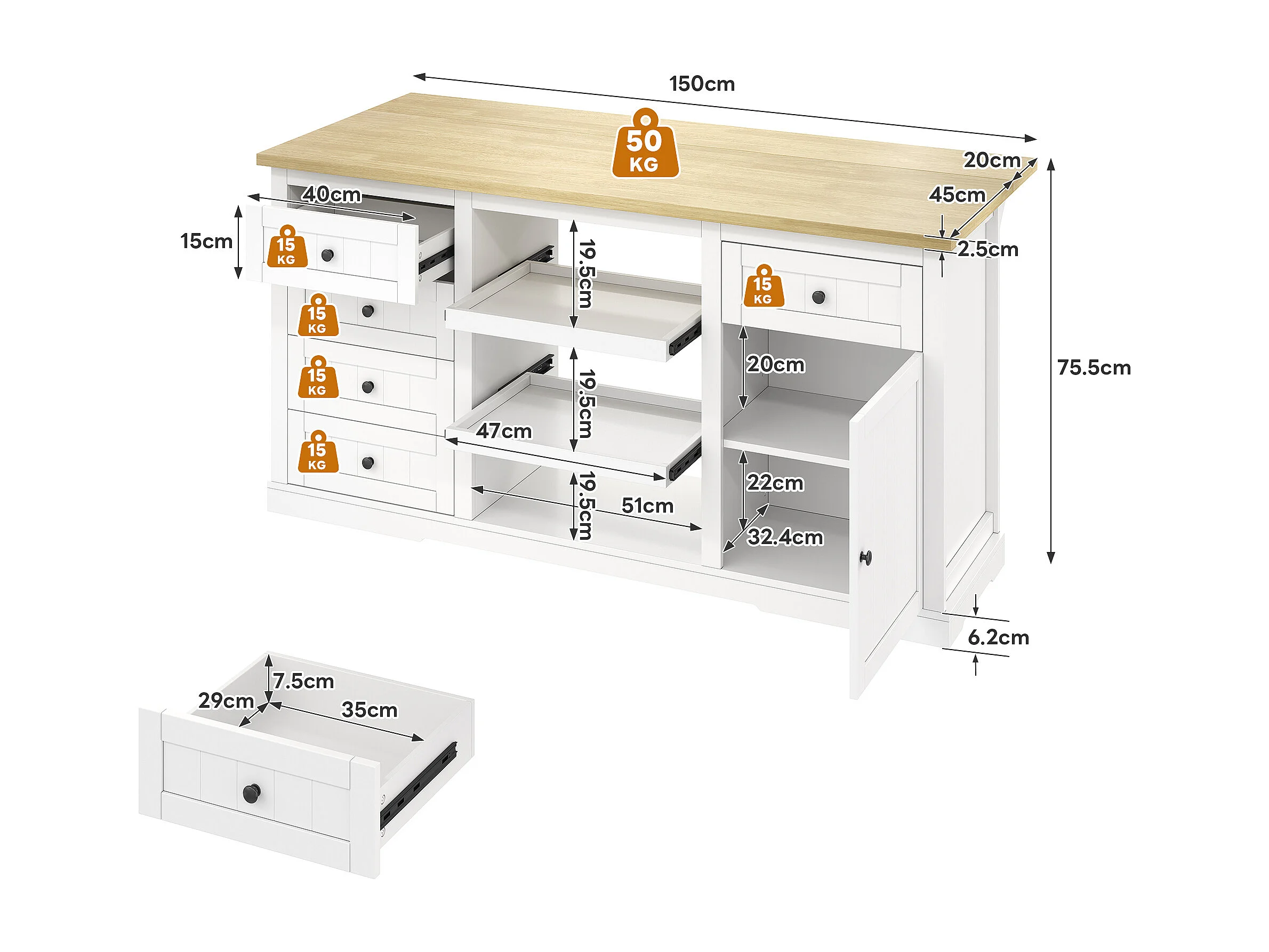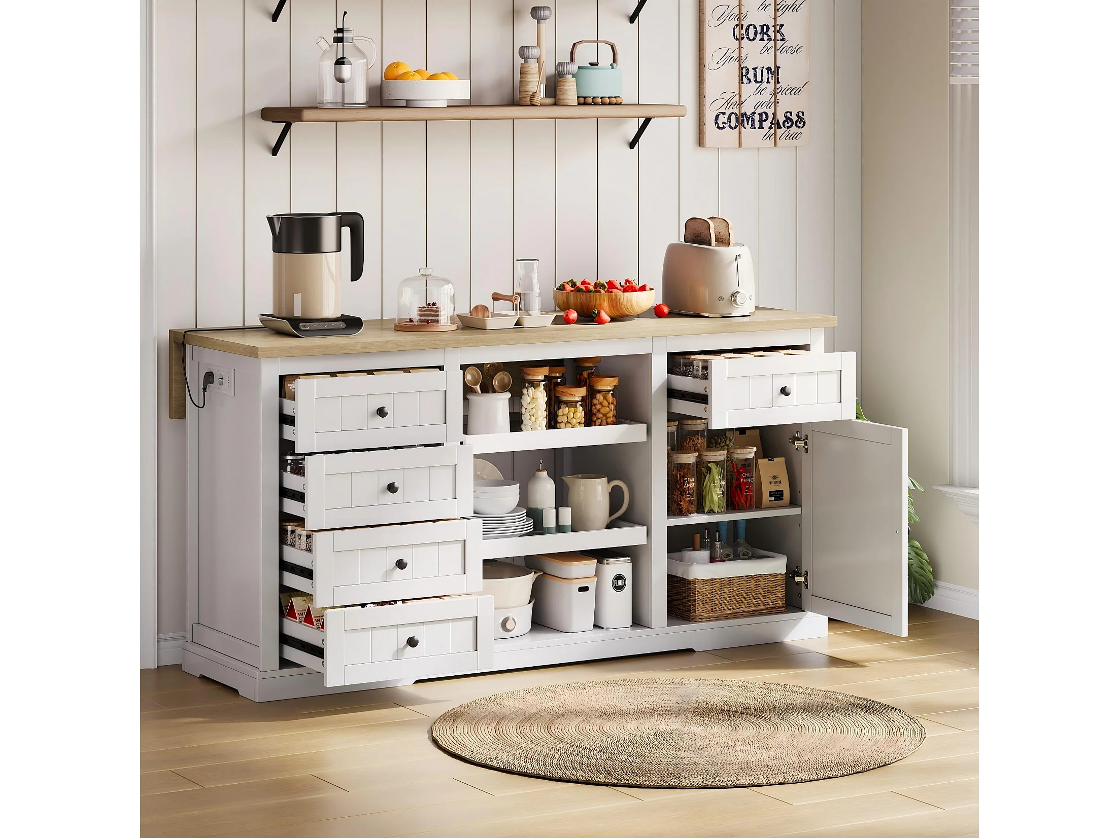 Buffet / îlot de cuisine / meuble bar avec 5 tiroirs, 2 étagères coulissantes et prises intégrées pour cuisine, salle à manger et salon, blanc