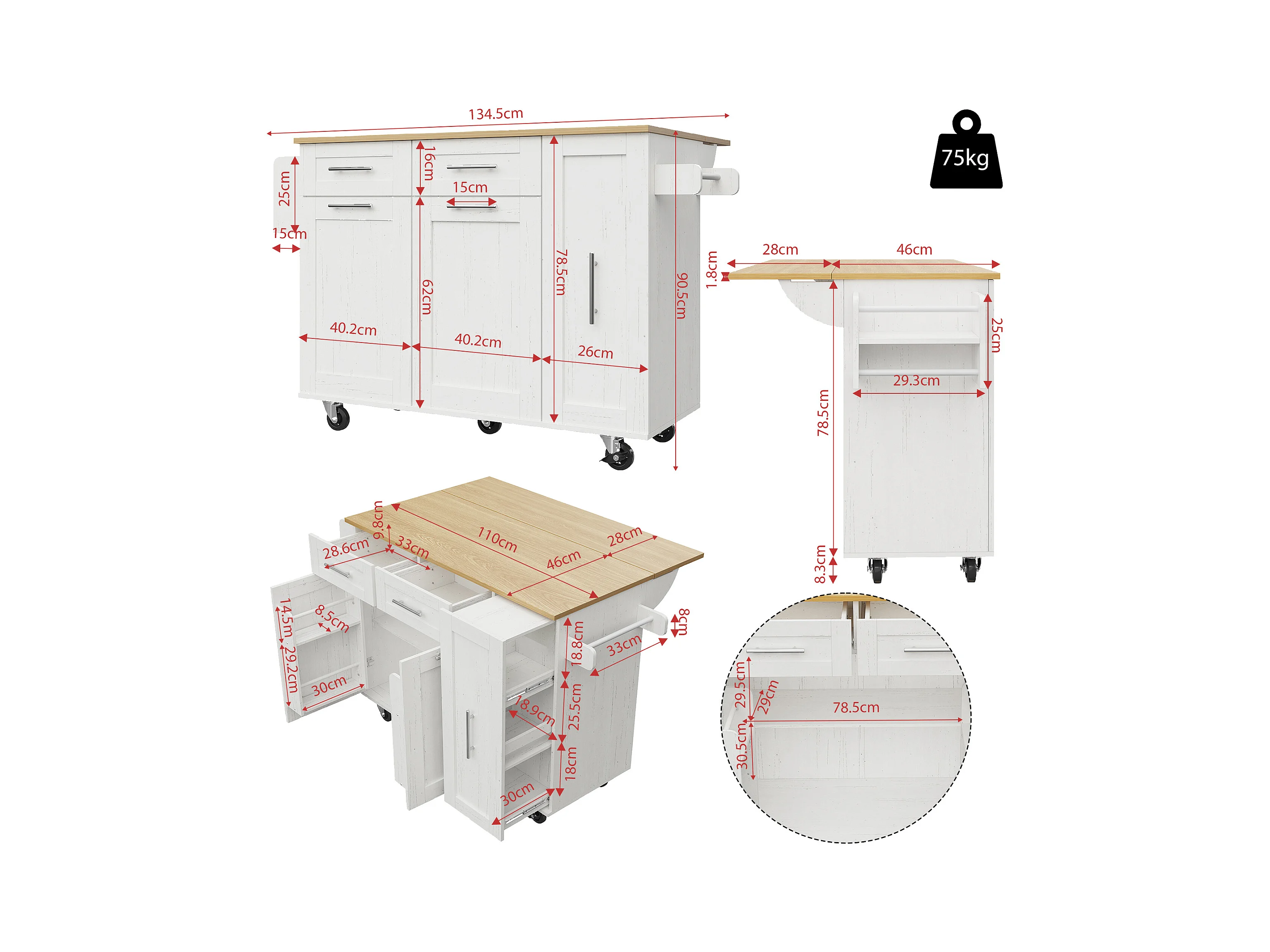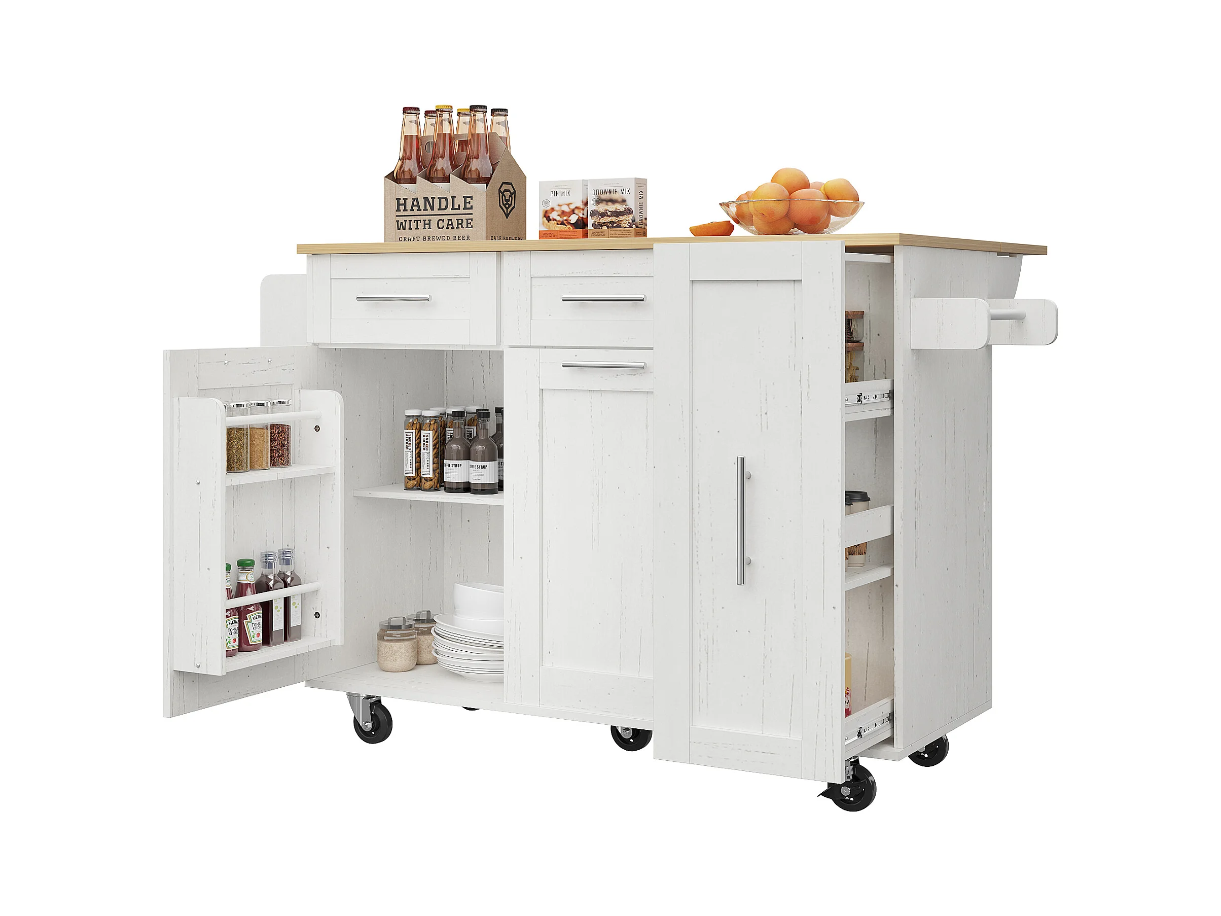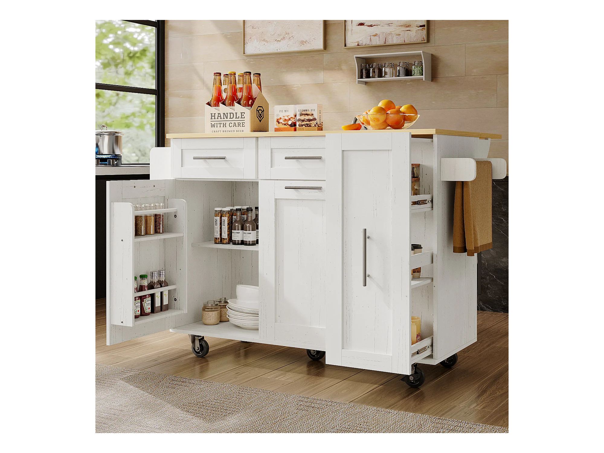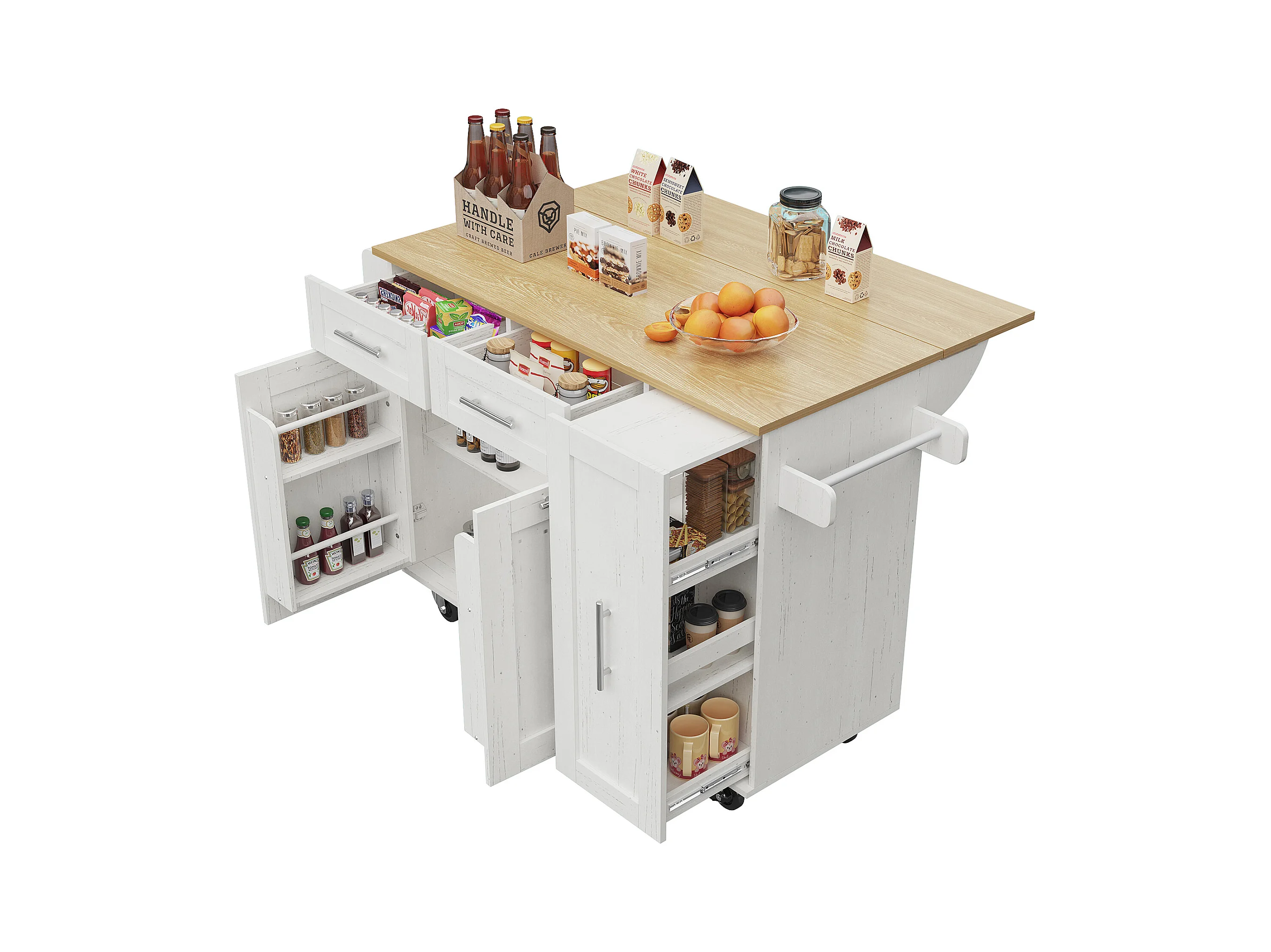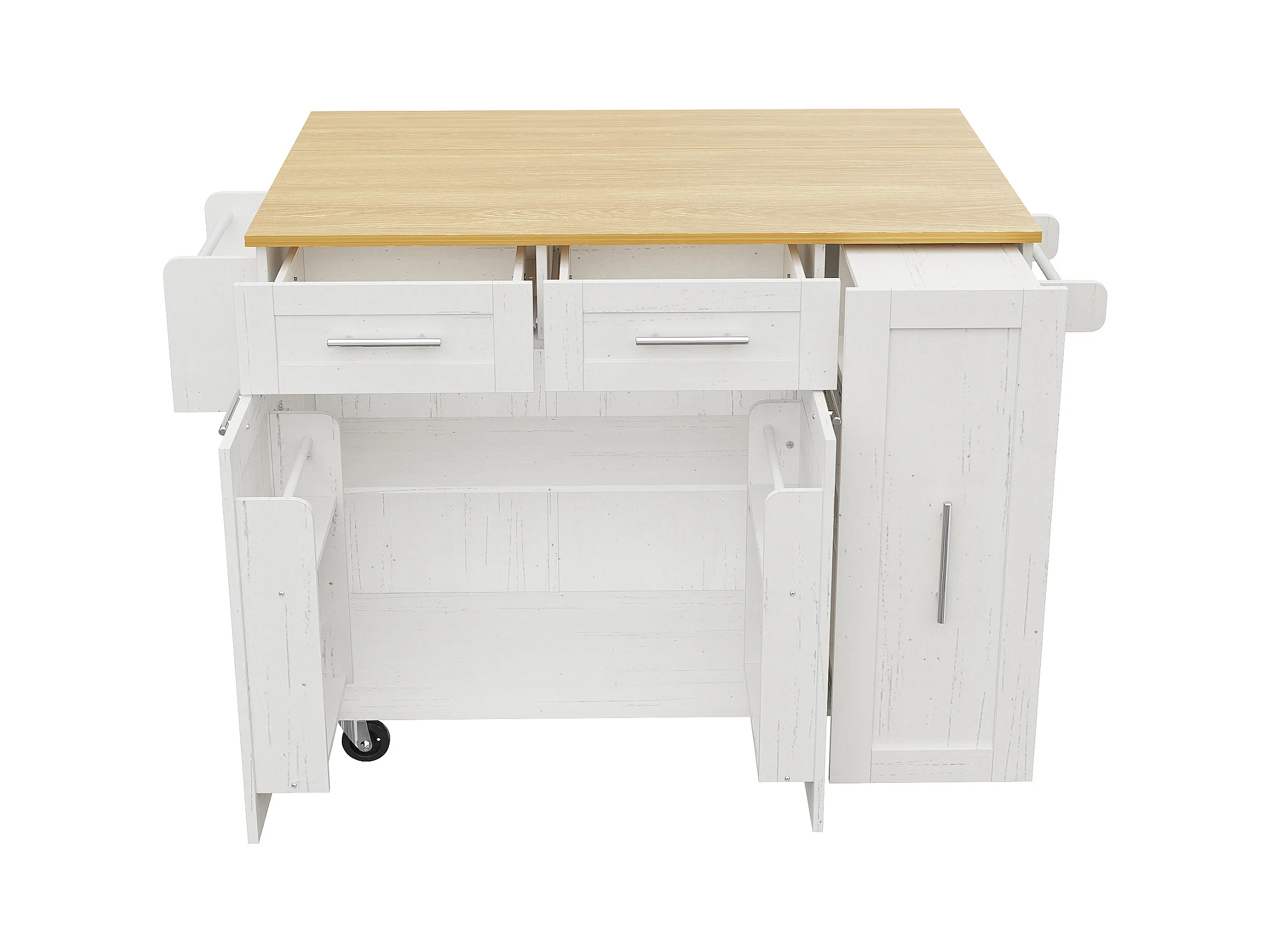 Ilot central de cuisine - chariot à roulette avec plateau escamotable - 2 tiroirs et 2 portes - Blanc