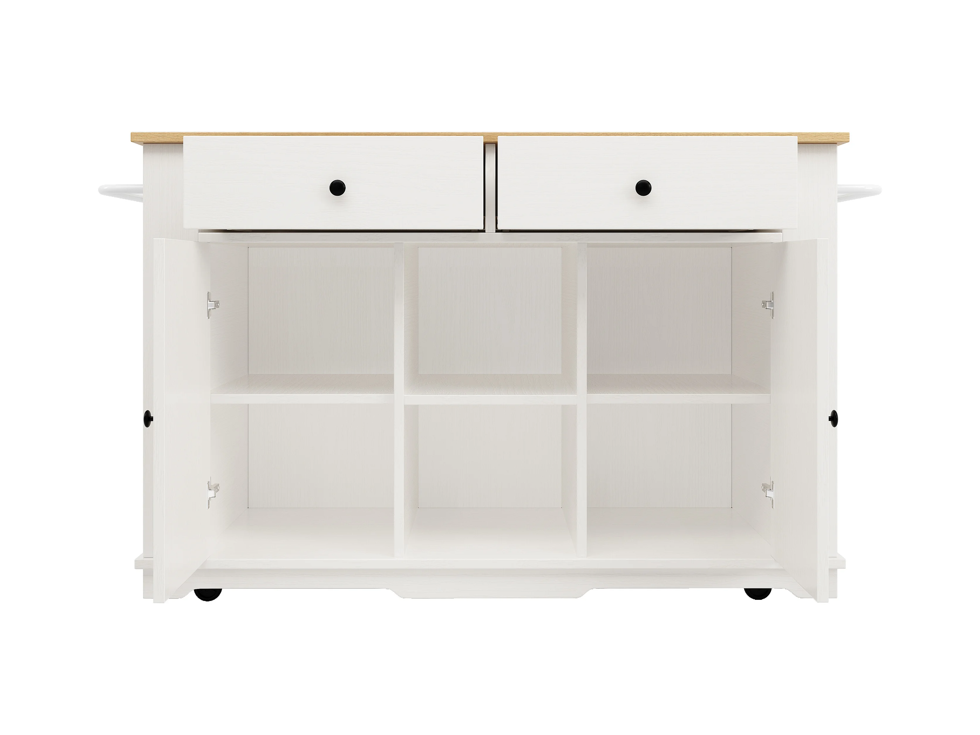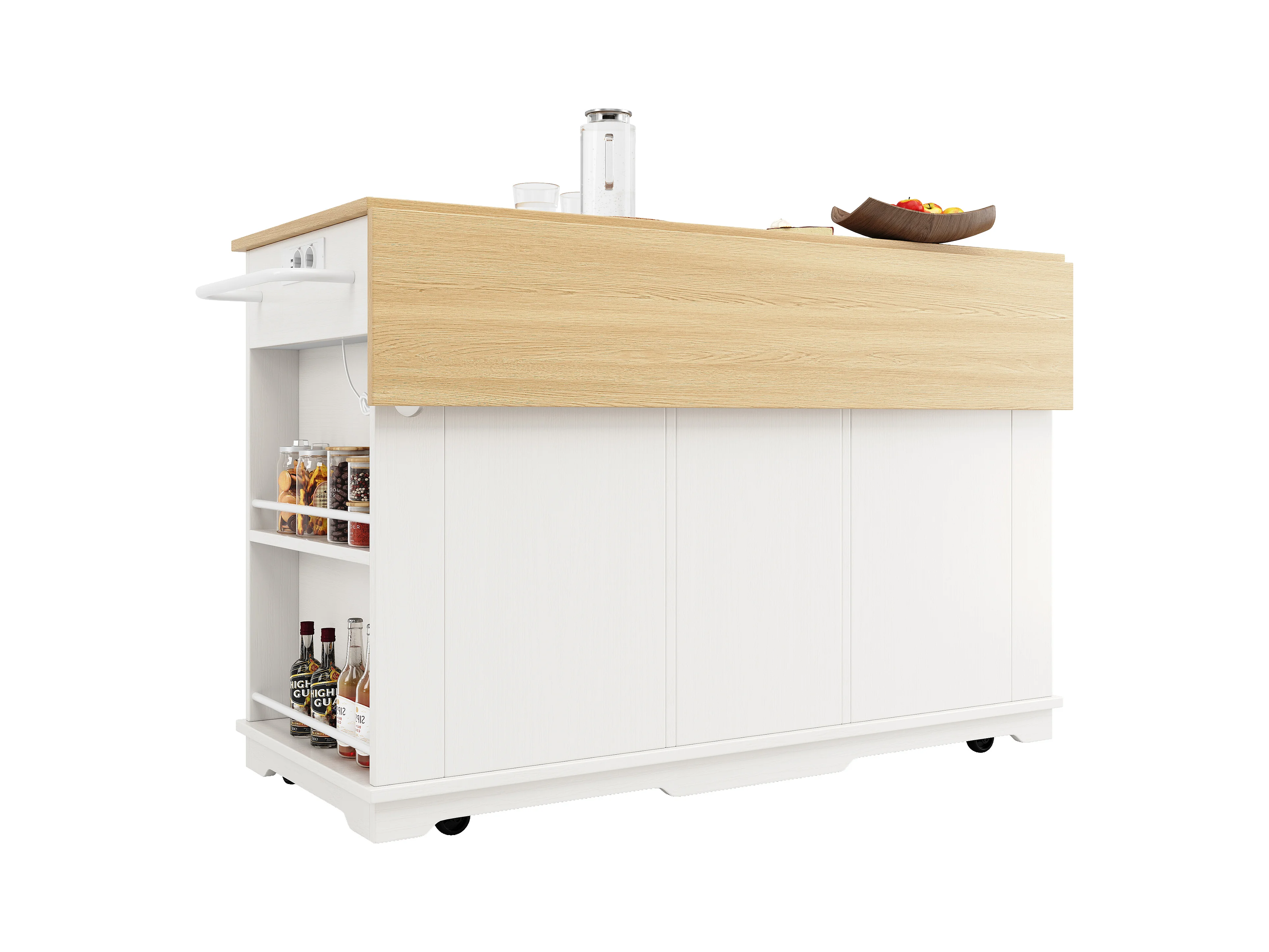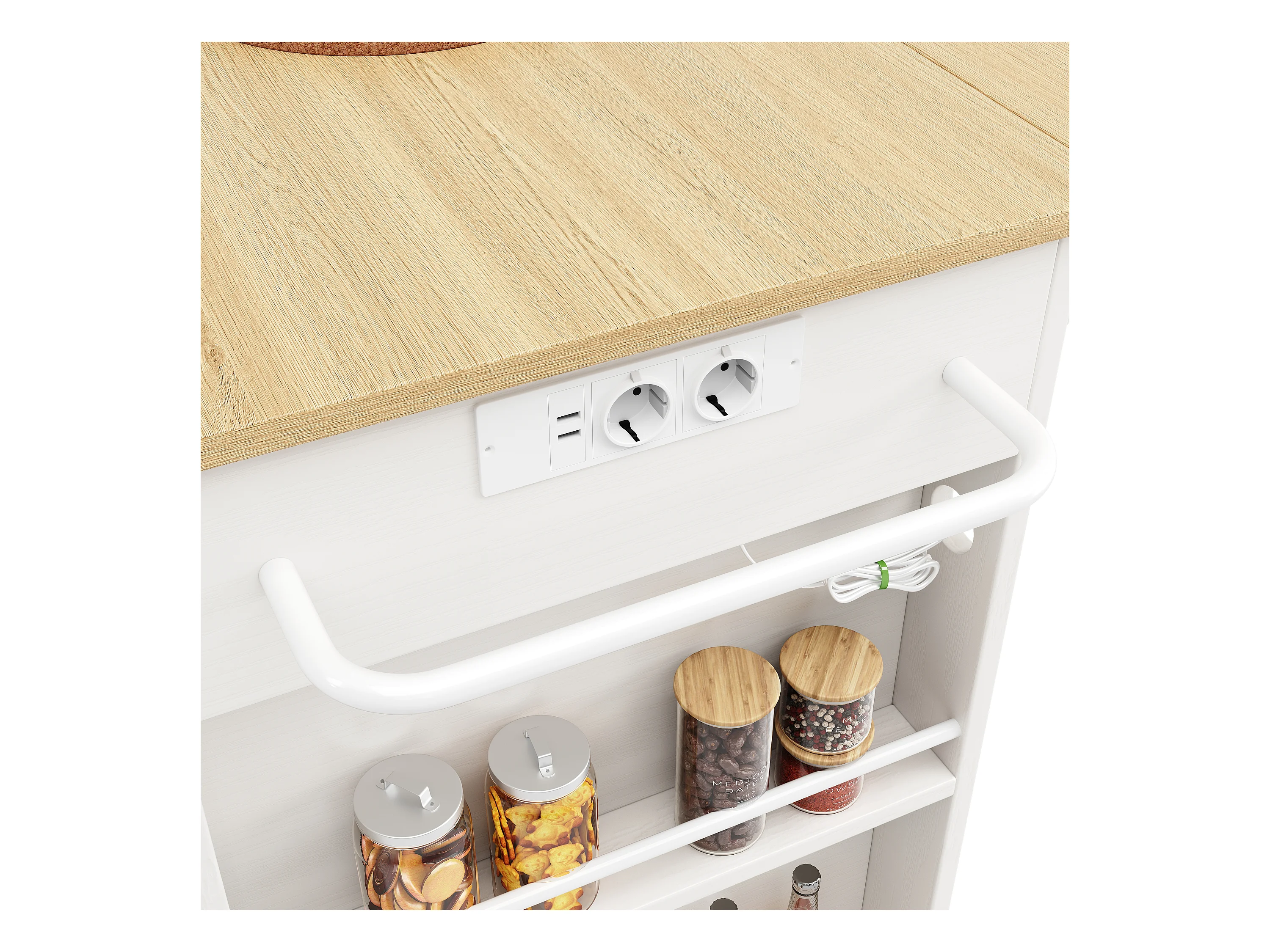 Ilot central de cuisine - chariot à roulette avec prises - avec plan extensible - 2 portes 2 tiroirs et 2 compartiments - Blanc