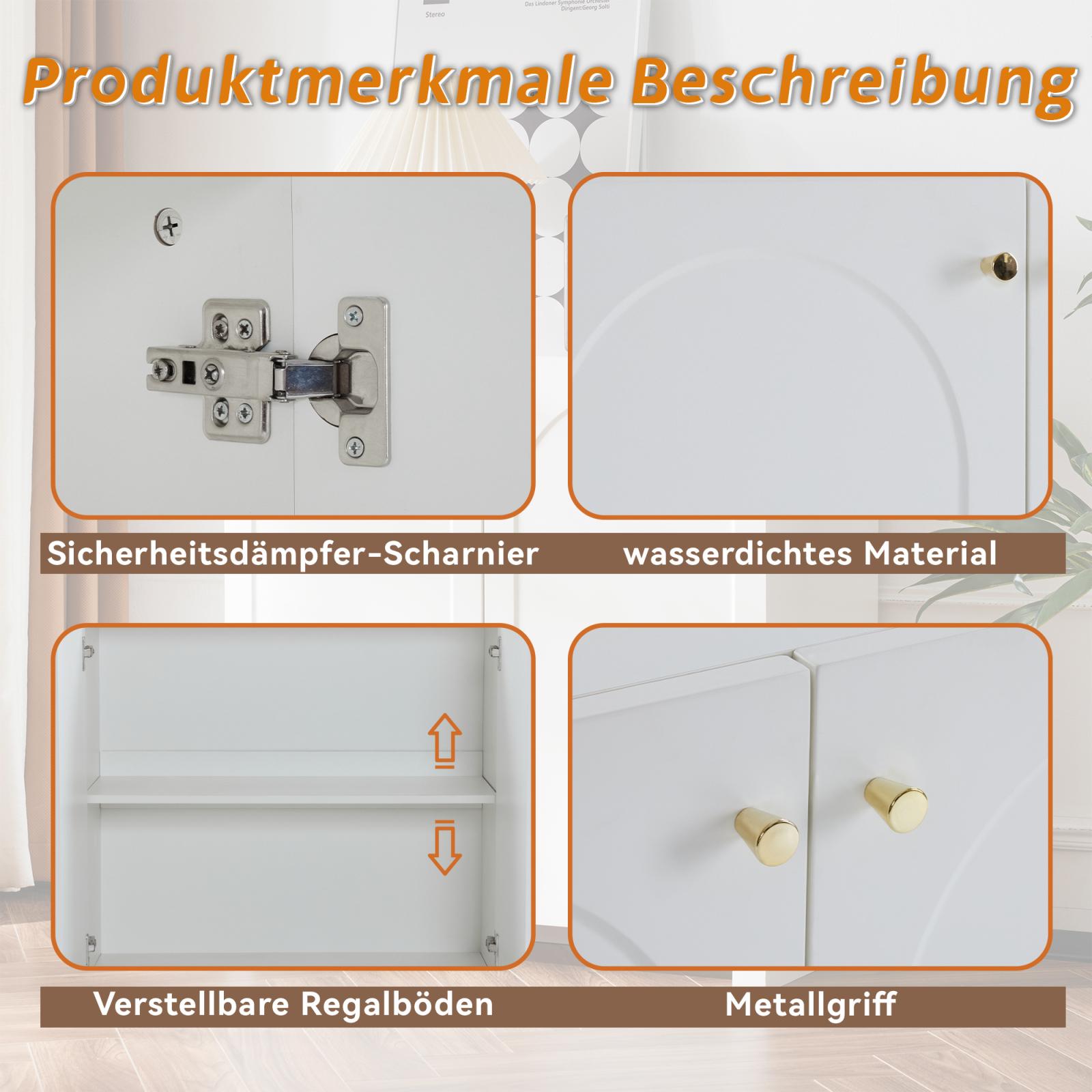 Buffet haut brillant, 4 portes, avec poignées et pieds en métal, design géométrique, MDF, blanc (140x40x80 cm)