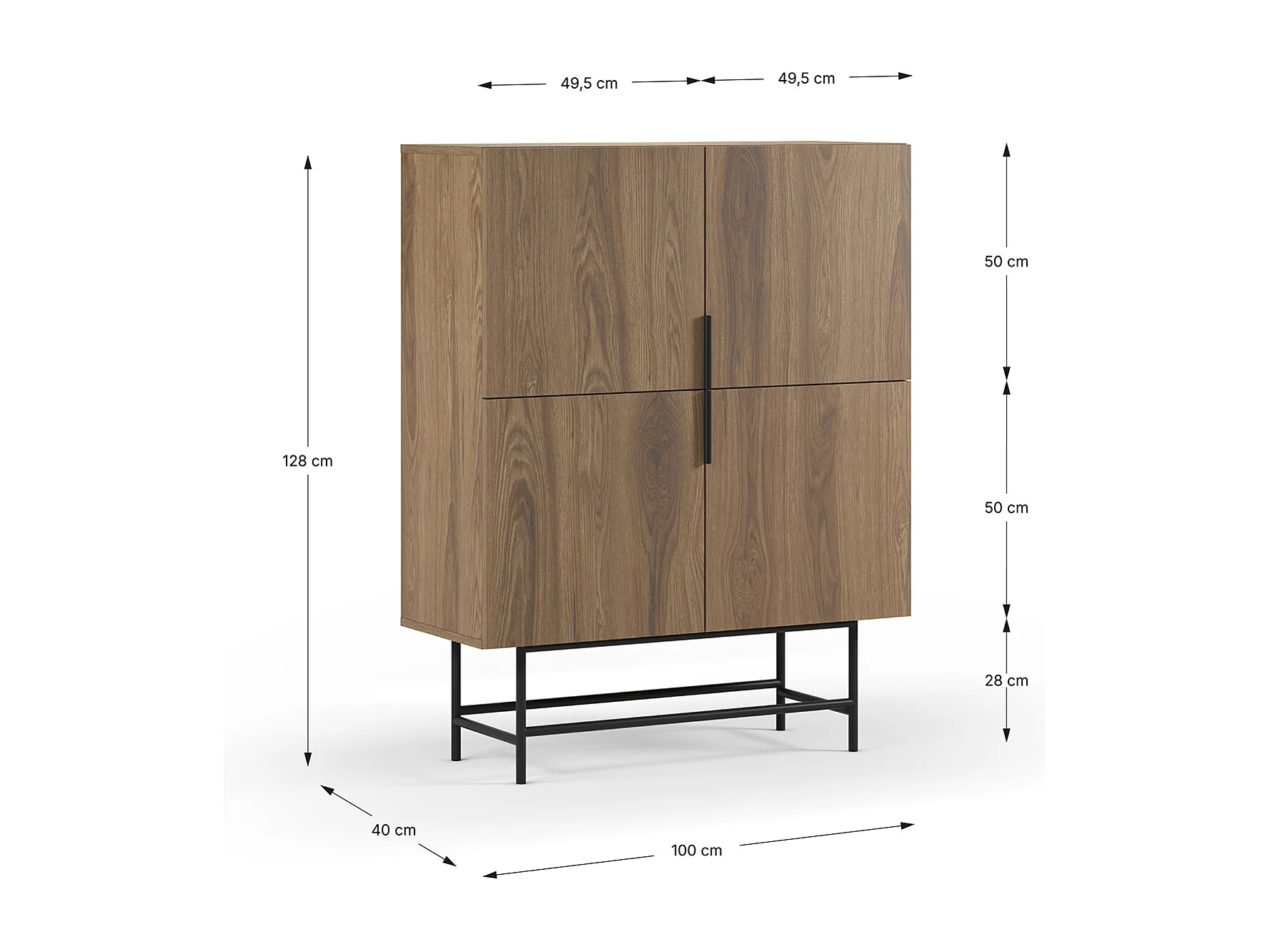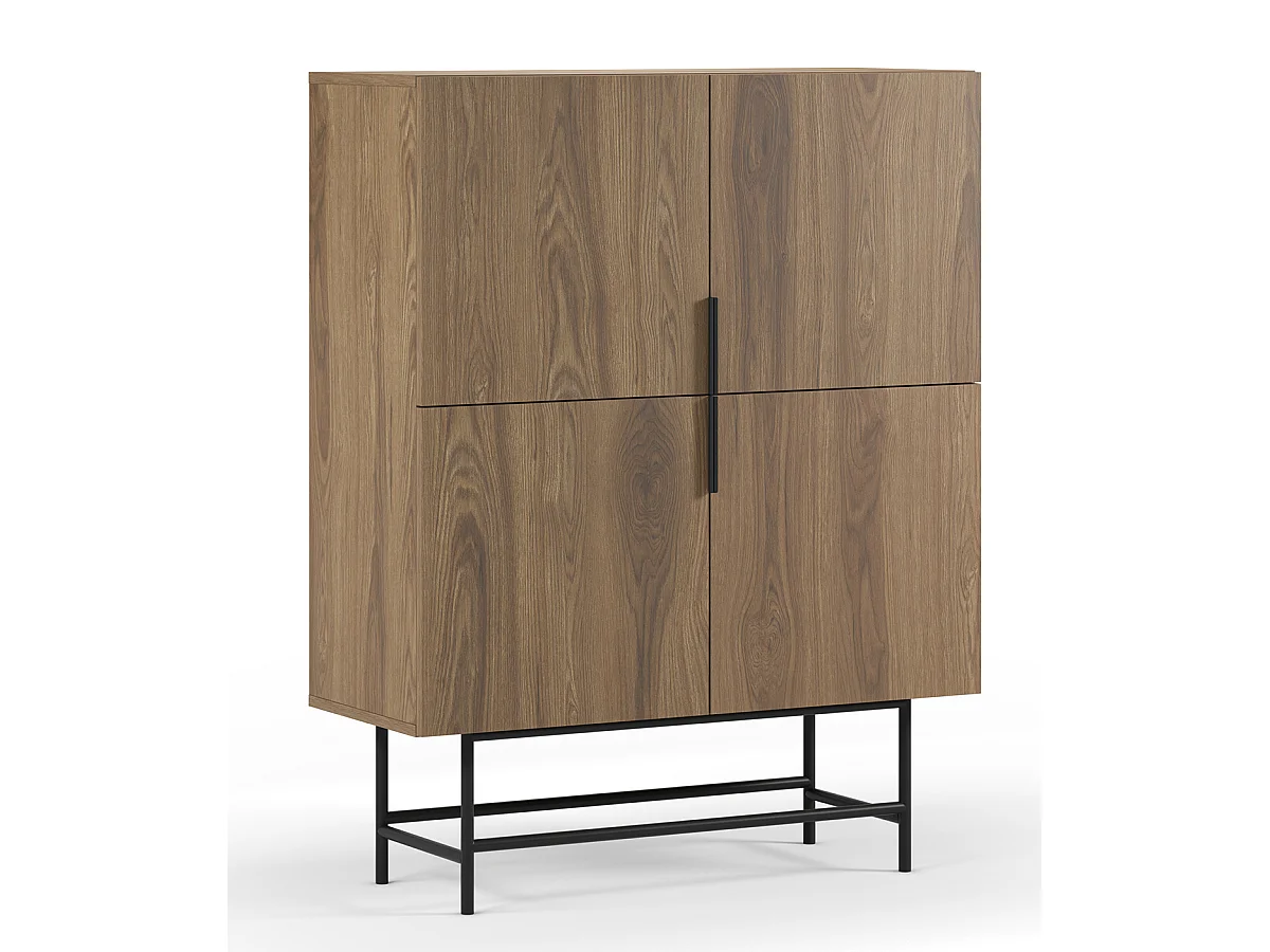 Buffet, meuble de rangement avec 4 portes aspect bois coloris chêne, pieds en métal coloris noir - Longueur 100 x Profondeur 40 x Hauteur 128 cm