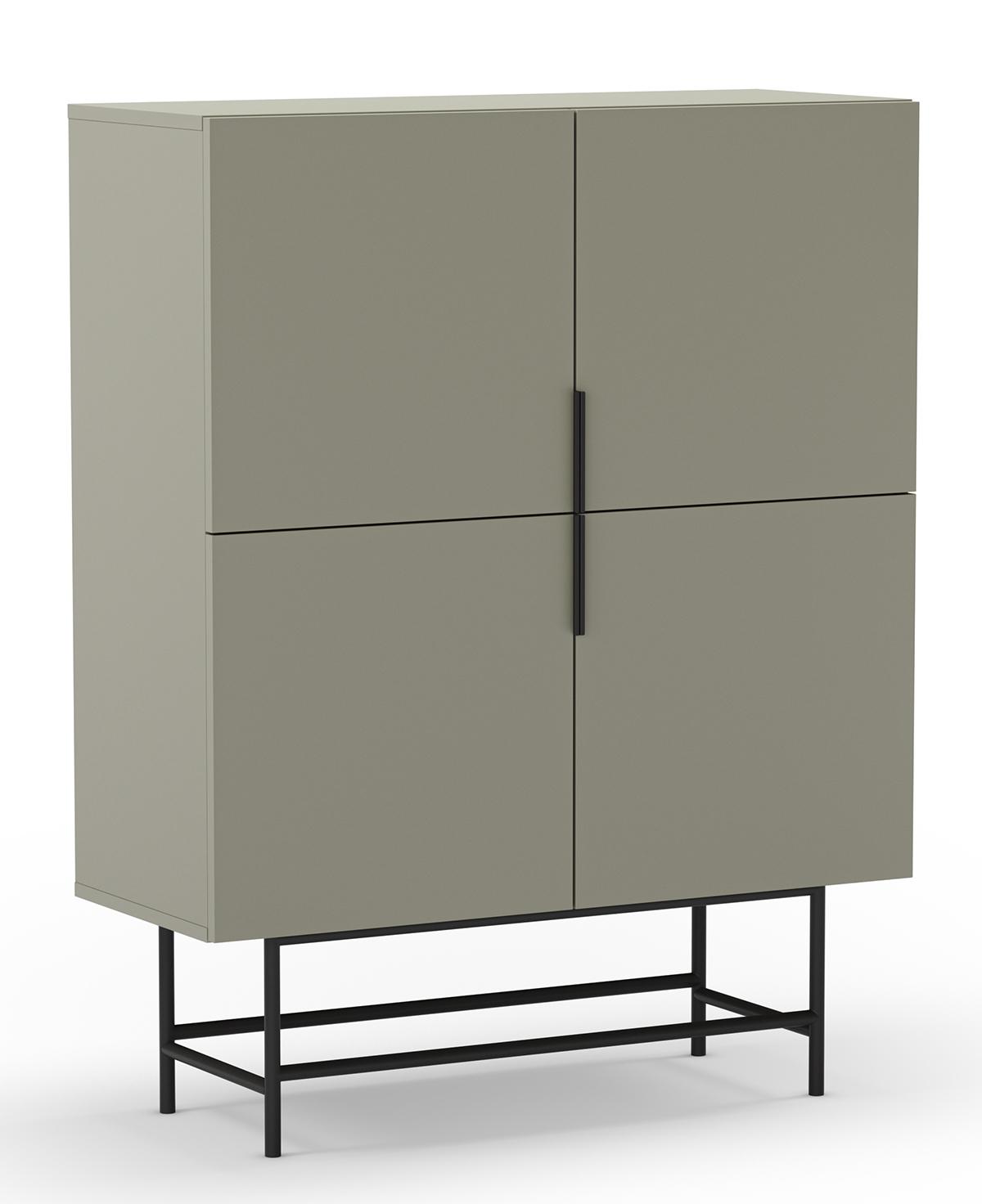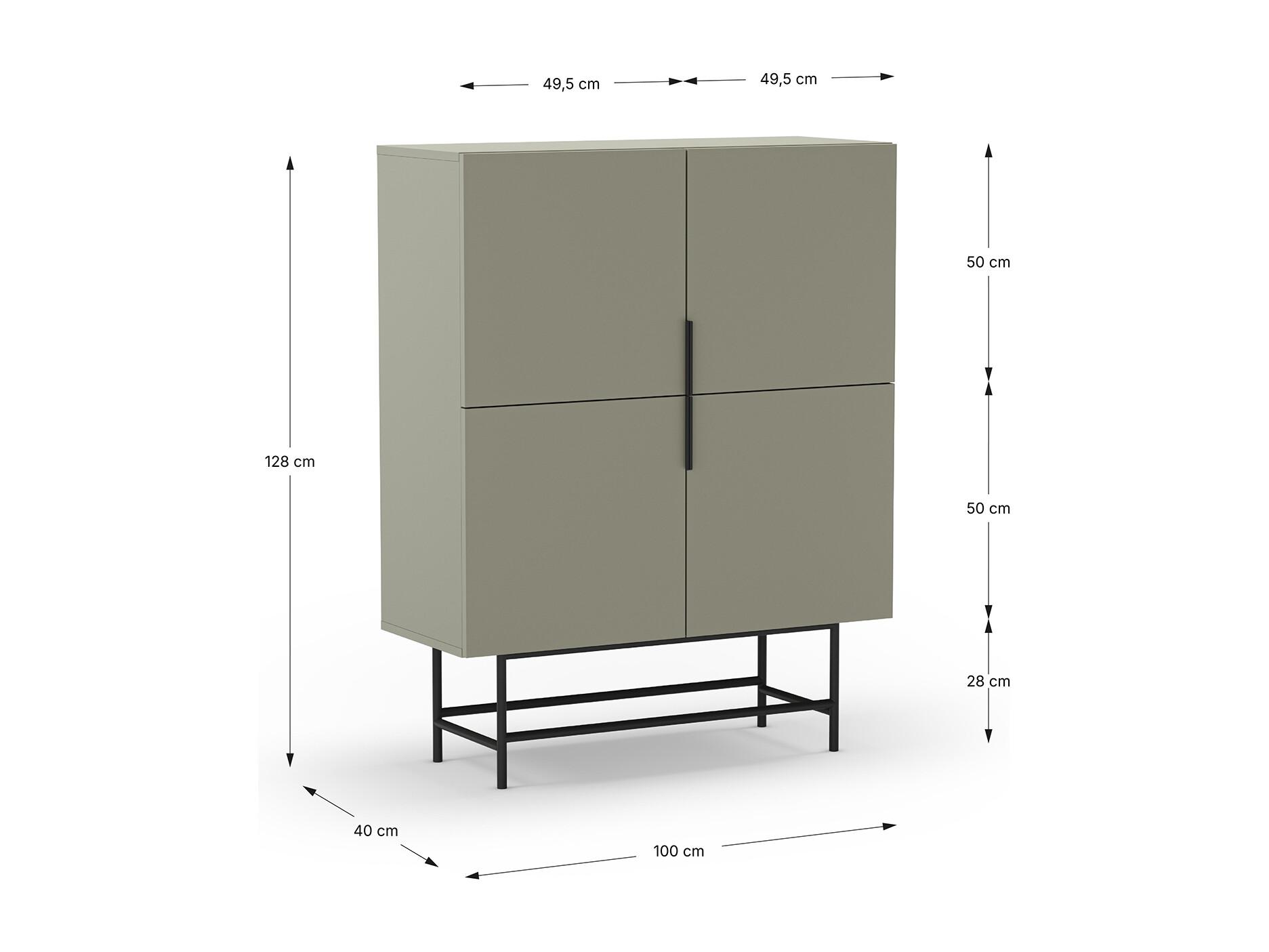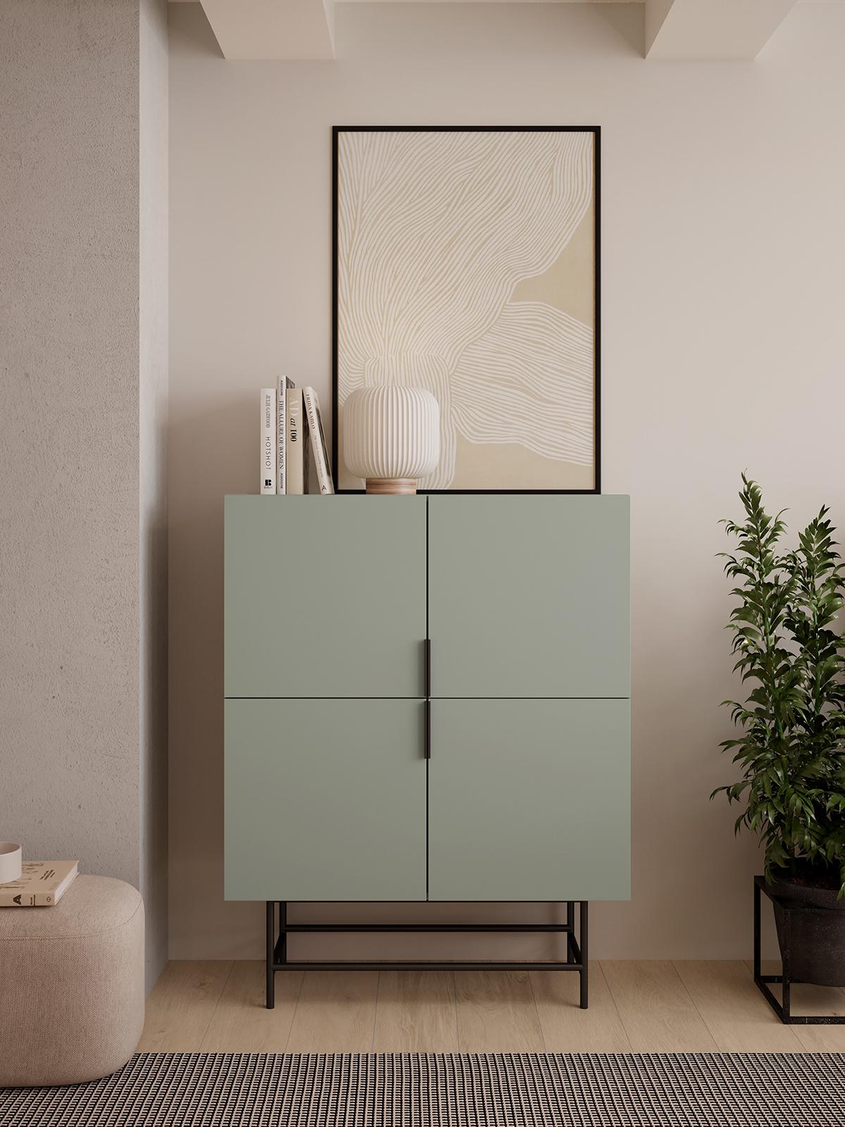 Buffet, meuble de rangement avec 4 portes aspect bois coloris Vert, pieds en métal noir - Longueur 100 x Profondeur 40 x Hauteur 128 cm