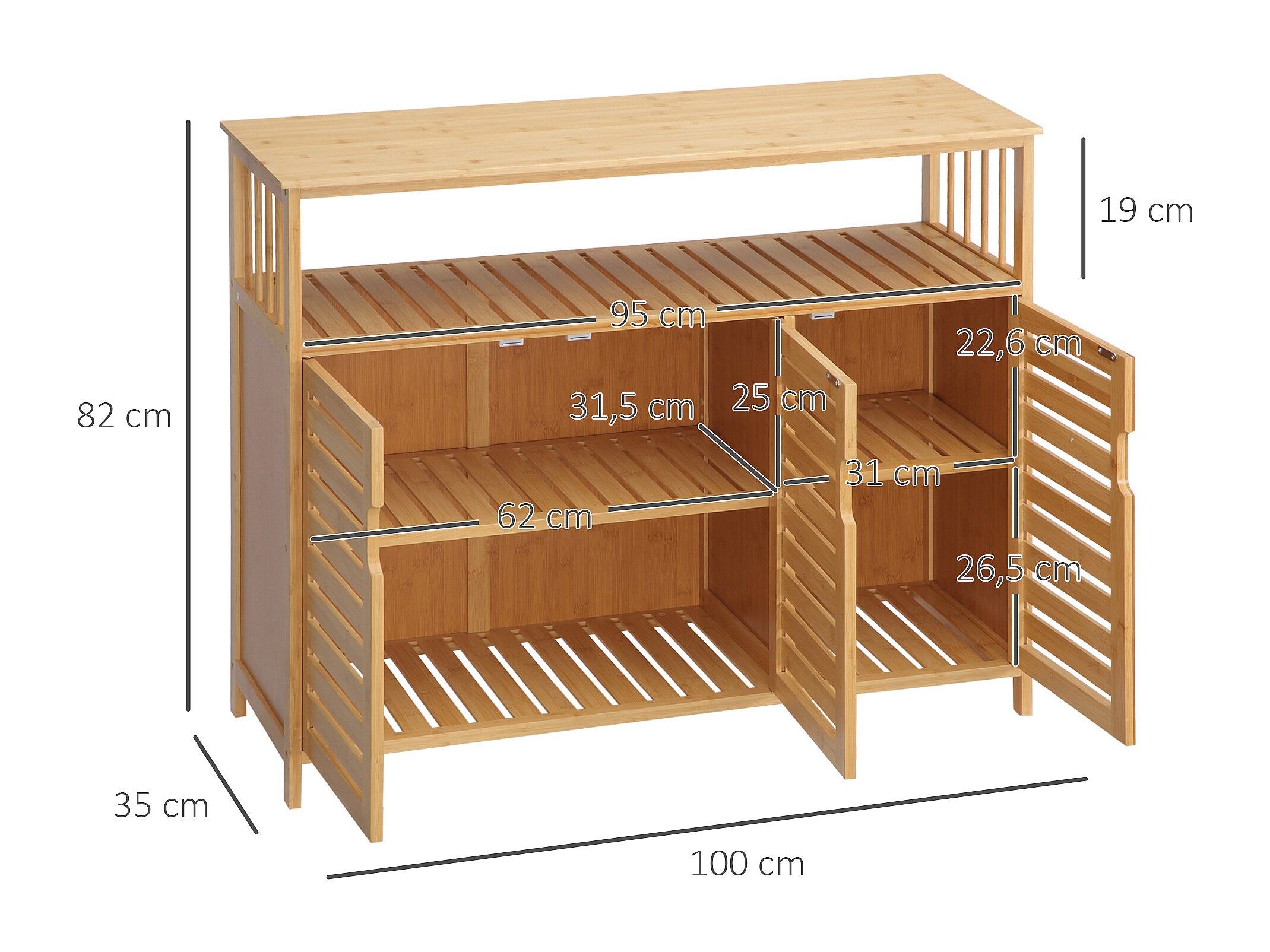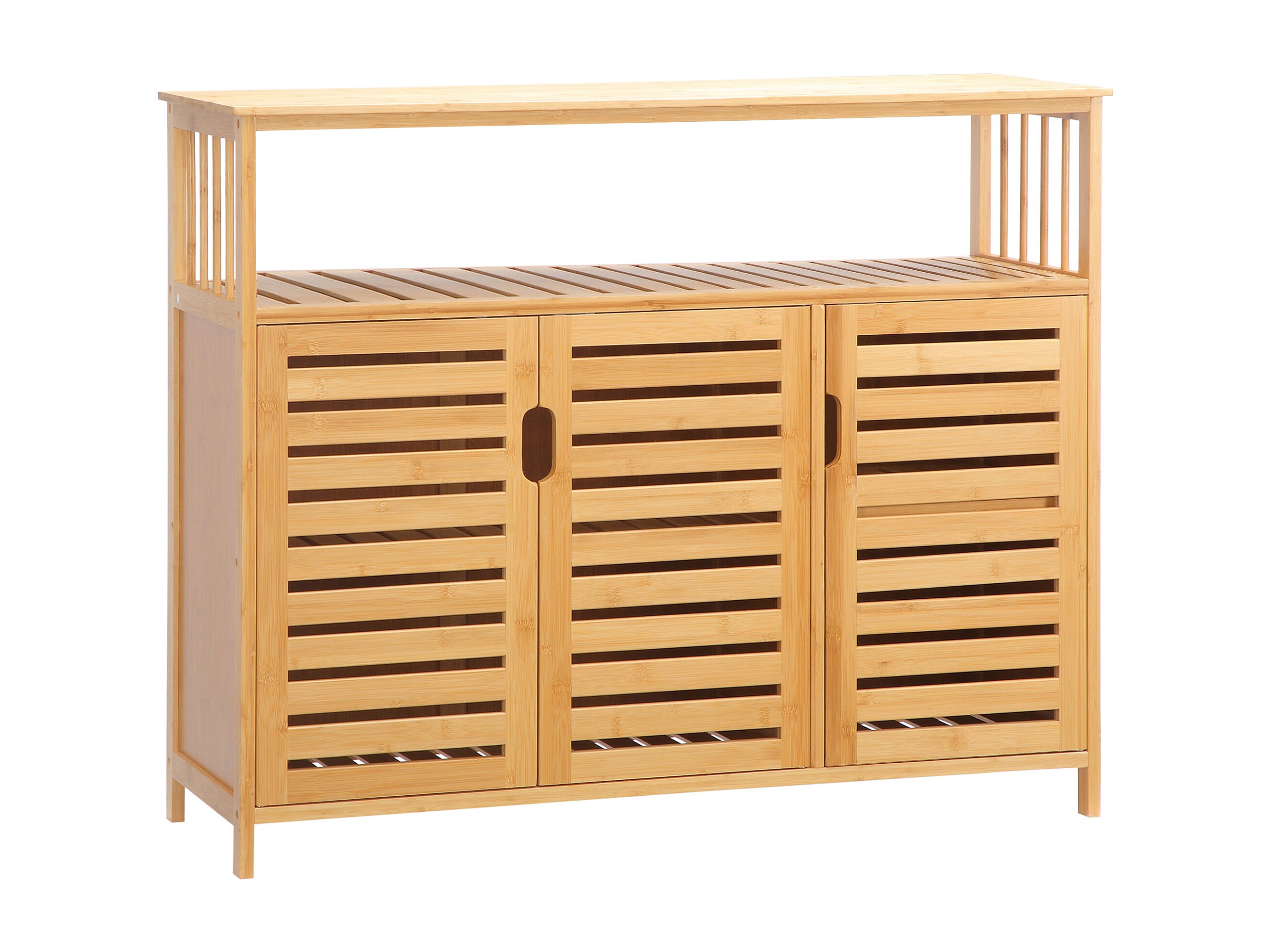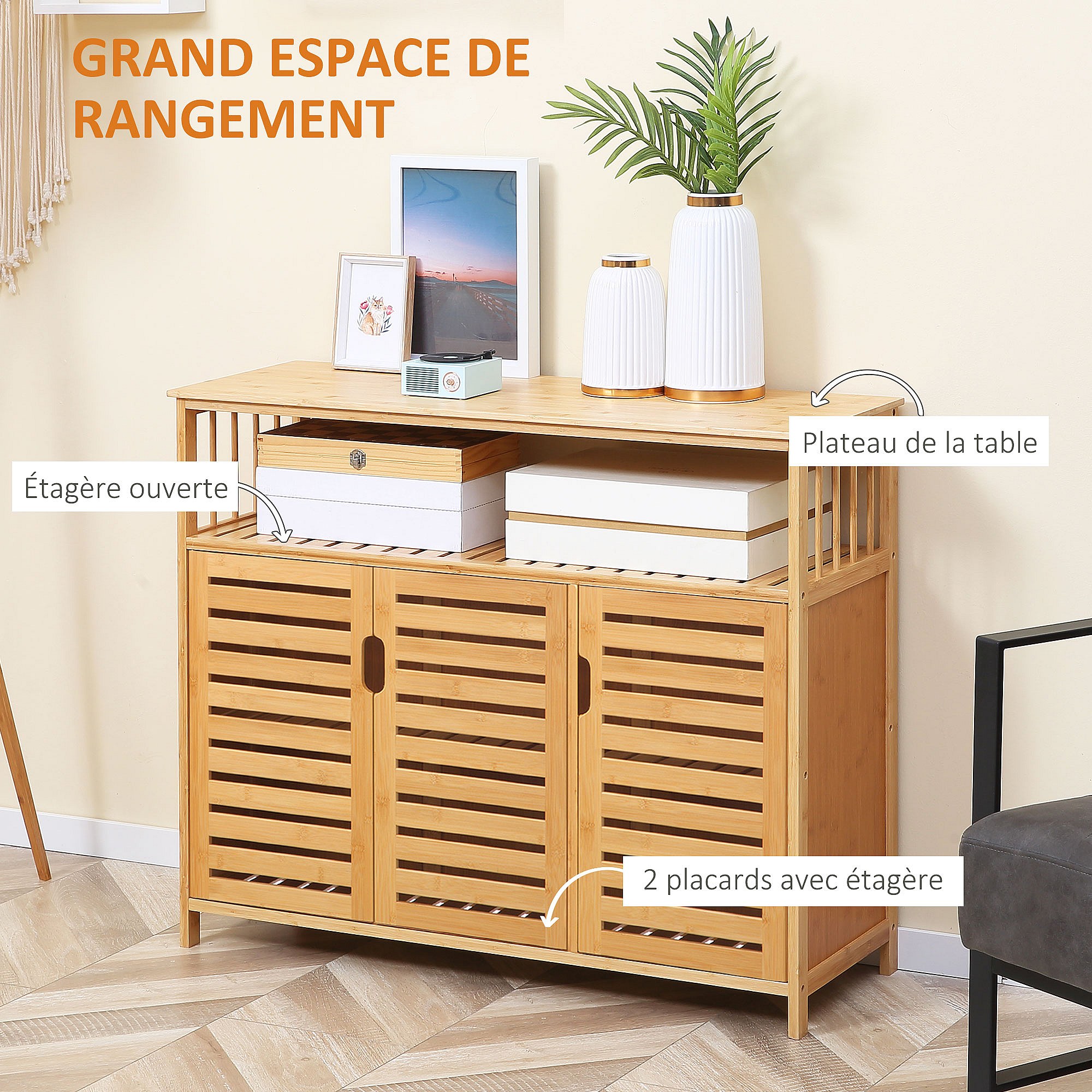 Buffet meuble de rangement bois bambou à lattes style naturel - 3 portes, 4 étagères