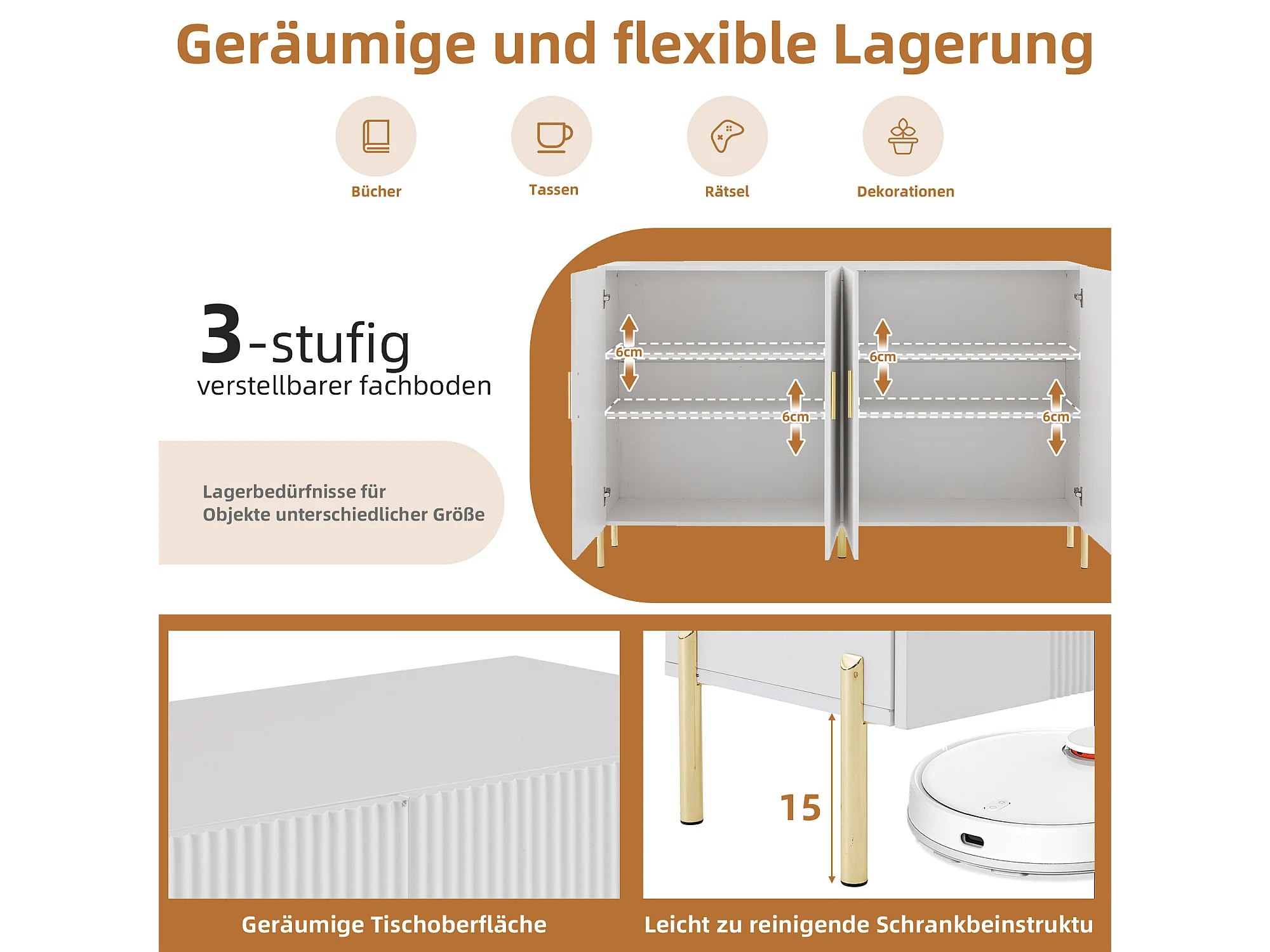 Buffet multifonctionnelle moderne blanc mat 4 portes poignets et pieds dorée 160*35*100 cm