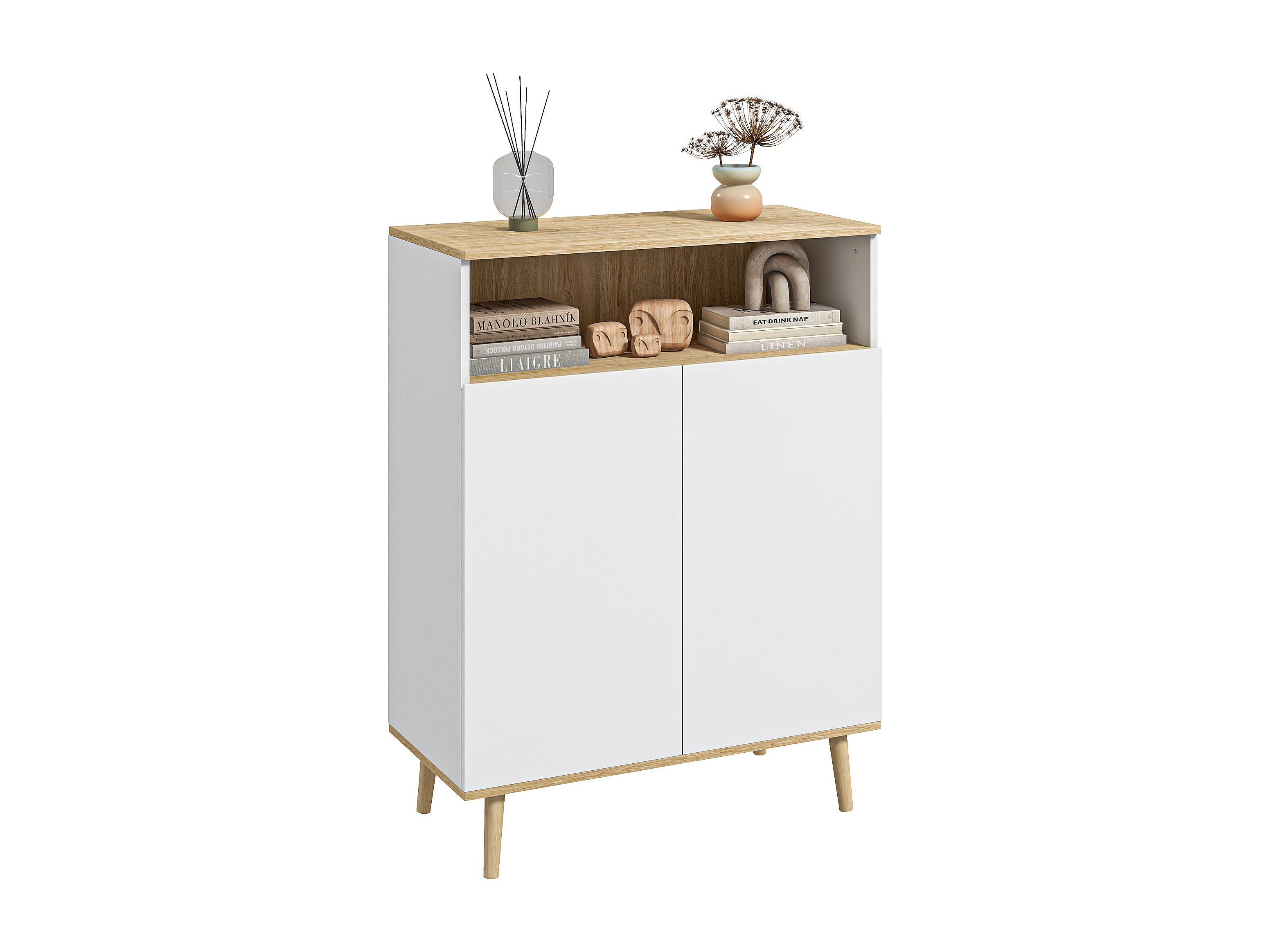 Buffet rangement design scandinave 2 portes étagère niche piètement bois pin panneaux blanc aspect chêne clair