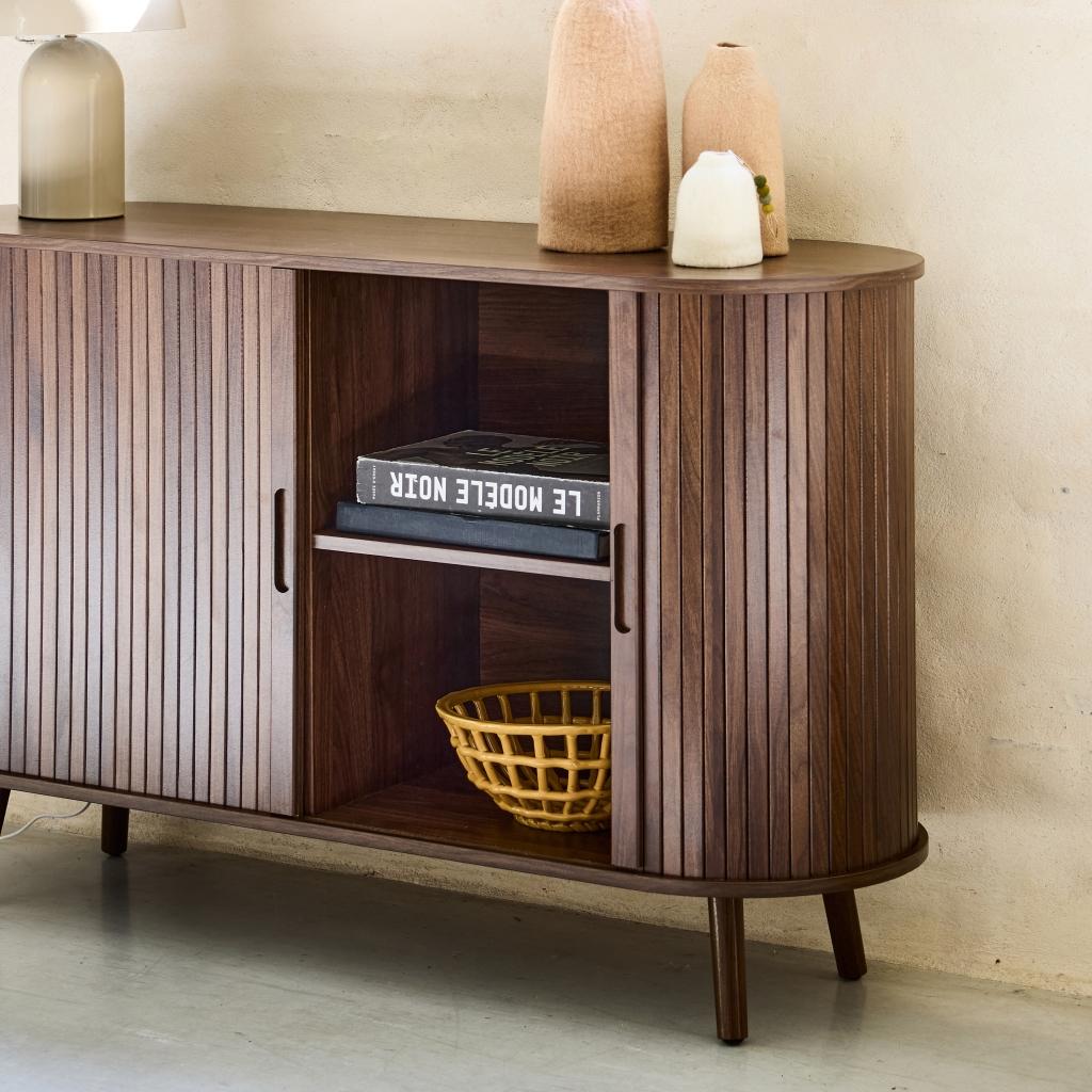 Buffet scandinave 2 portes coulissantes. 4 compartiments. effet bois rainuré. couleur noyer. buffet bas. L 120 x P 40 x H 75cm