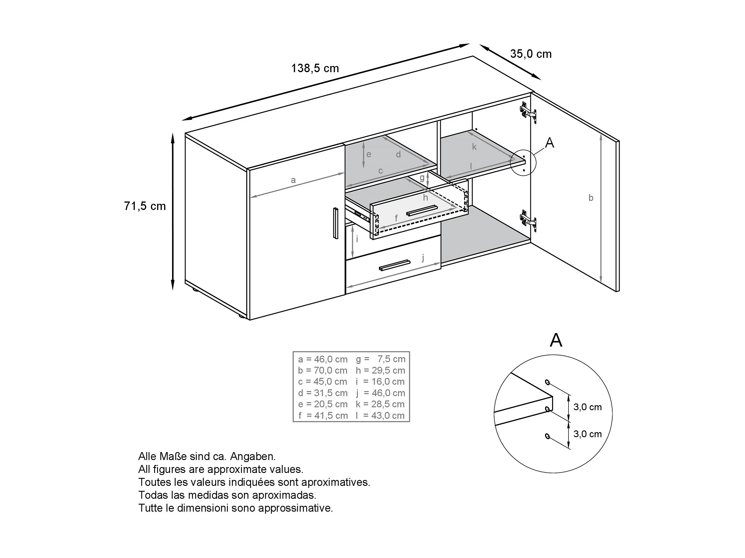 Buffet Skadu, Commode avec 2 portes, 3 tiroirs et 1 compartiment ouvert, blanc mat/bordeaux haute brillance (138,5 x 71,5 x 35 cm)