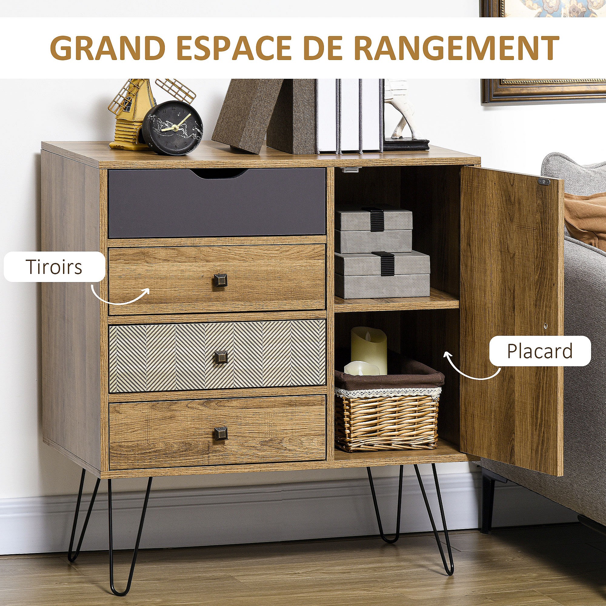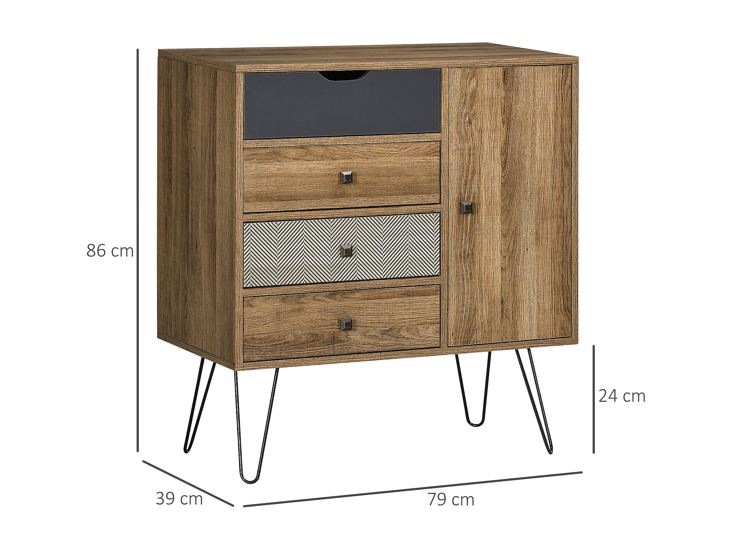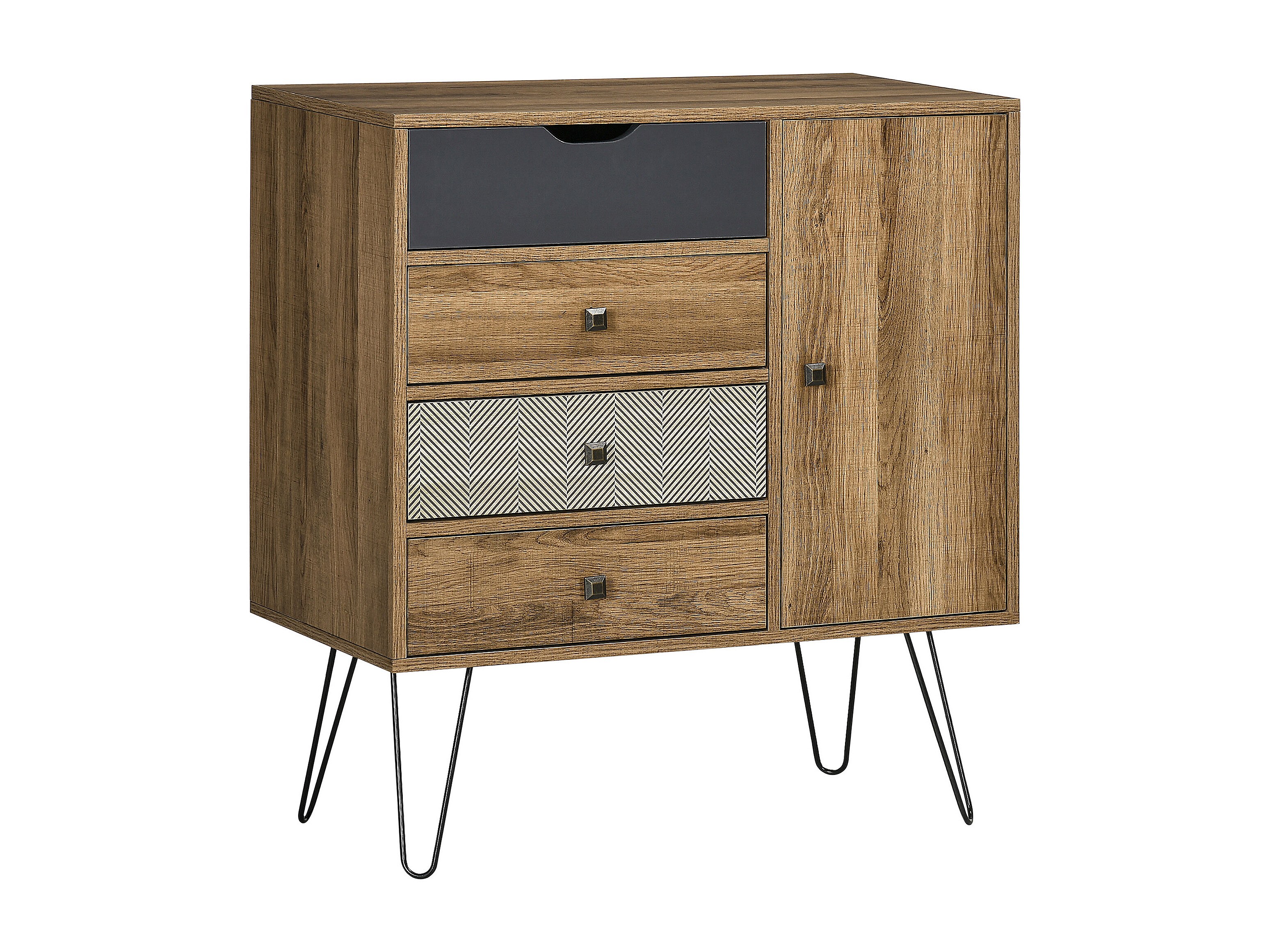 Buffet style industriel motif graphique - porte, étagère, 4 tiroirs - piètement épingle métal noir aspect bois