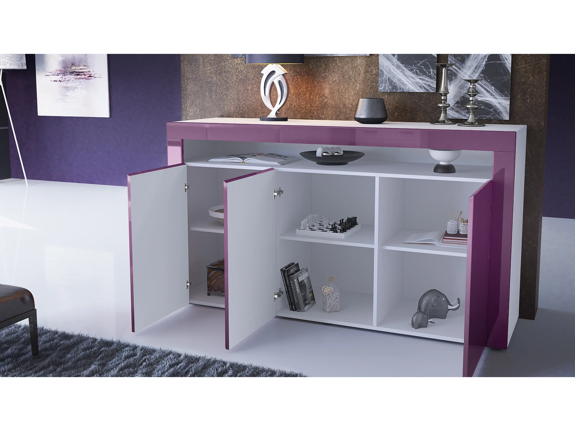 Buffet Valencia, Commode avec 3 portes et 1 compartiment ouvert, Blanc mat/bordeaux haute brillance/blanc haute brillance (155 x 92 x 40 cm)