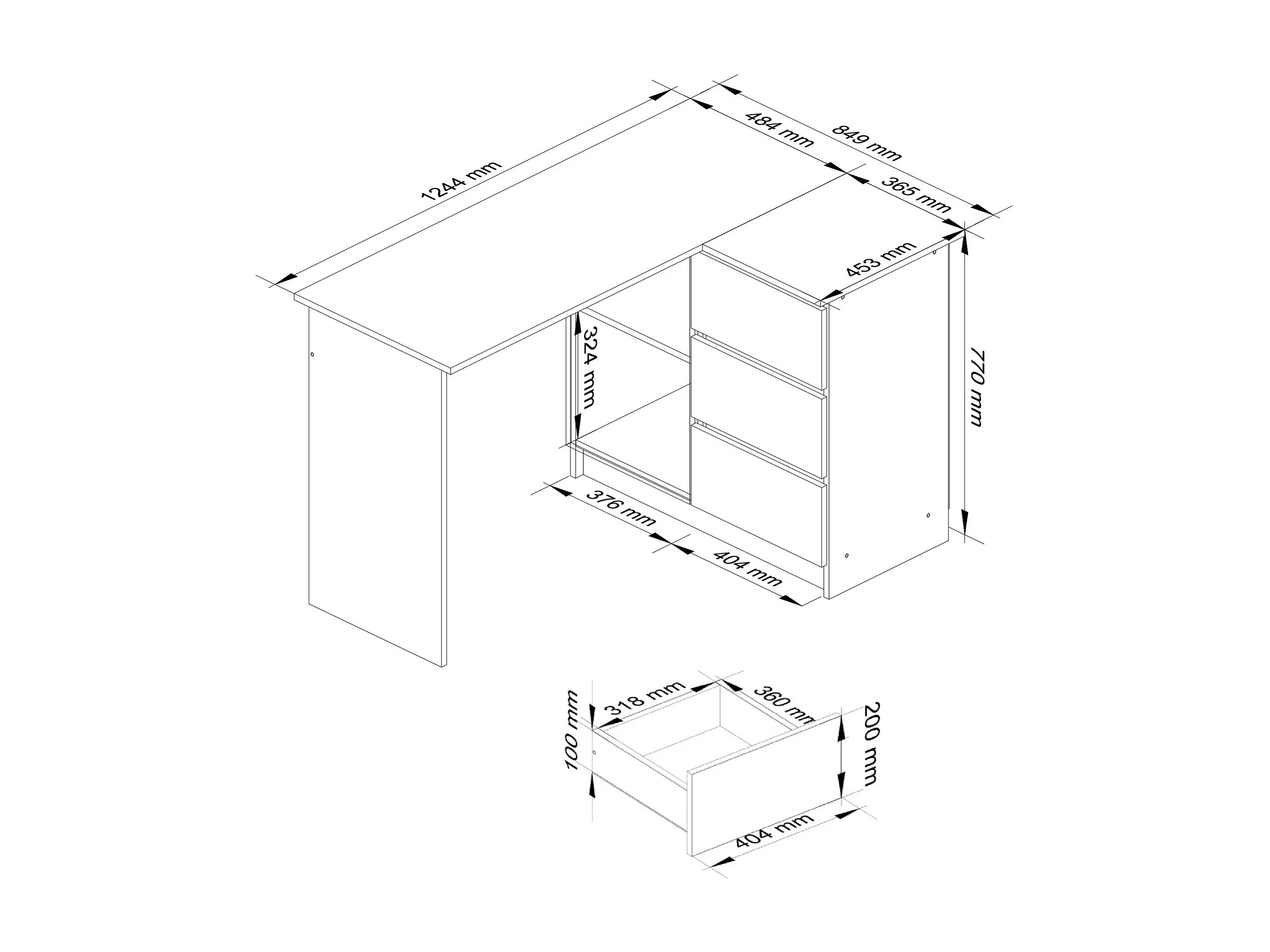 Bureau AKORD d'angle droit B16 Blanc 124 cm 3 tiroirs façade Blanche 2 étagères 124x85x77 cm