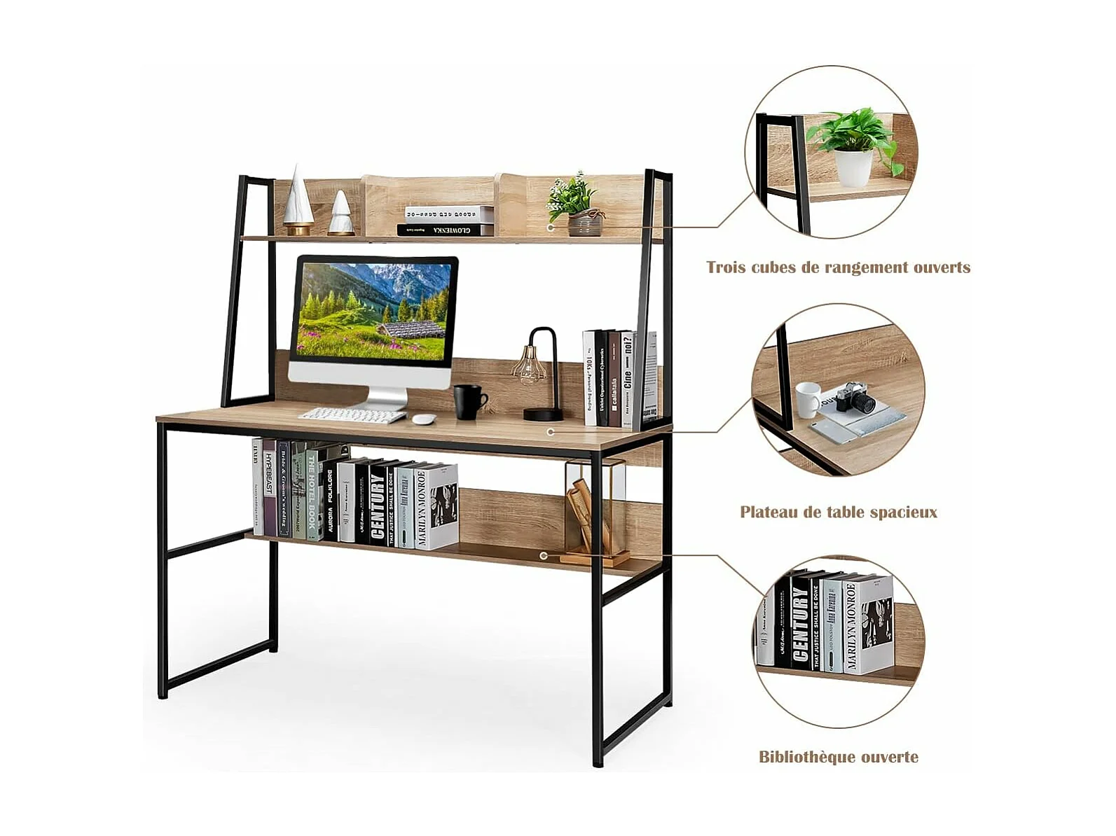 Bureau avec Bibliothèque, Bureau d’Ordinateur à Domicile avec Étagères de Rangement, Table de Travail Design Industriel, 57 x 120 x 139,5 cm (Naturel)