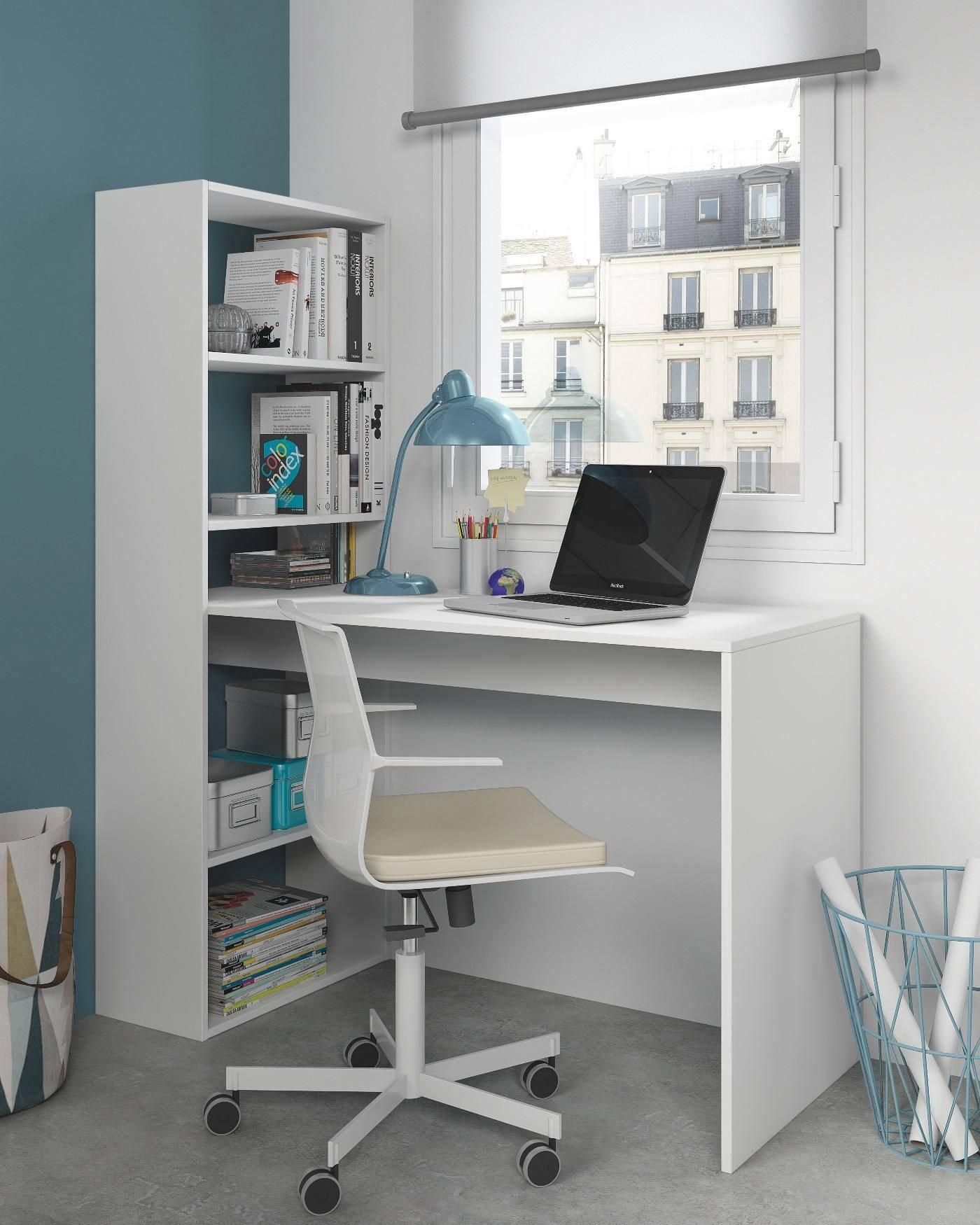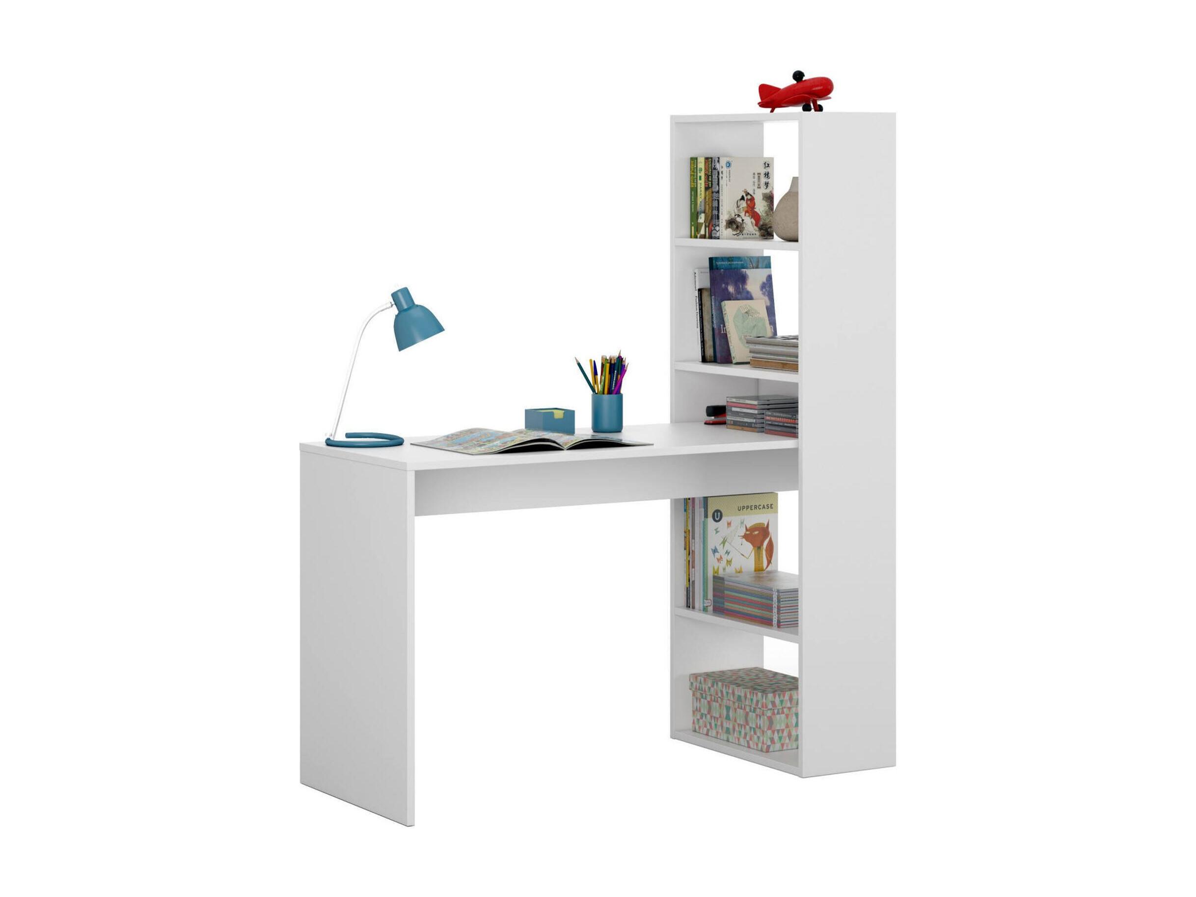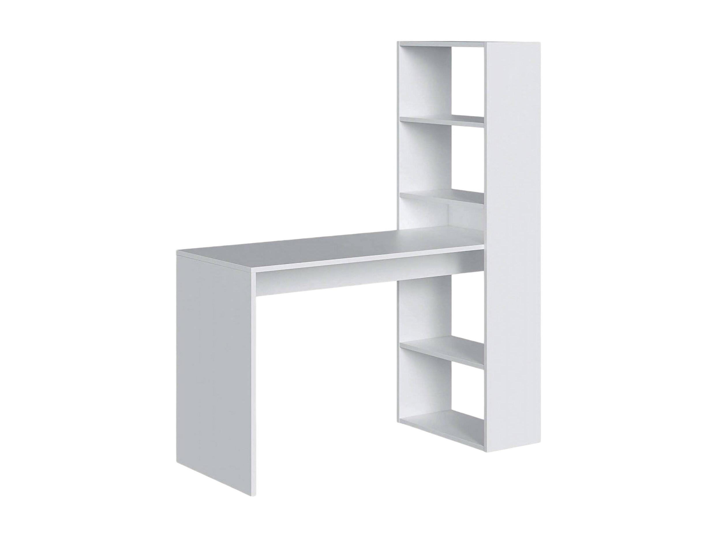 Bureau Denton, Bureau multifonction réversible avec bibliothèque 5 étagères, Table d'étude ou de bureau pour support livre PC, 120x53h144 cm, Blanc