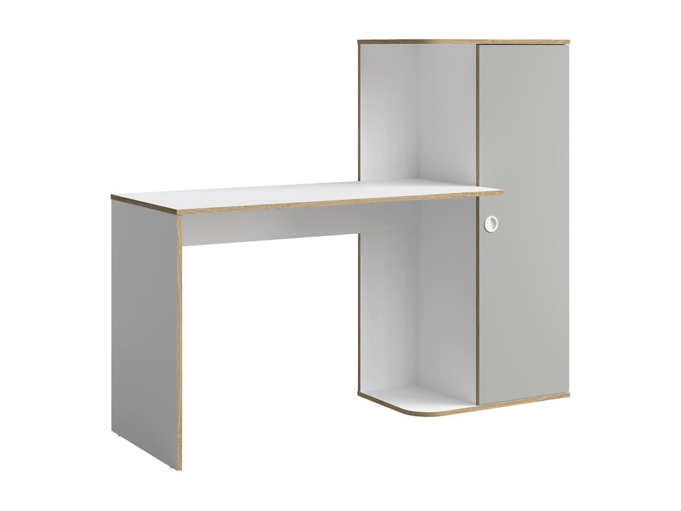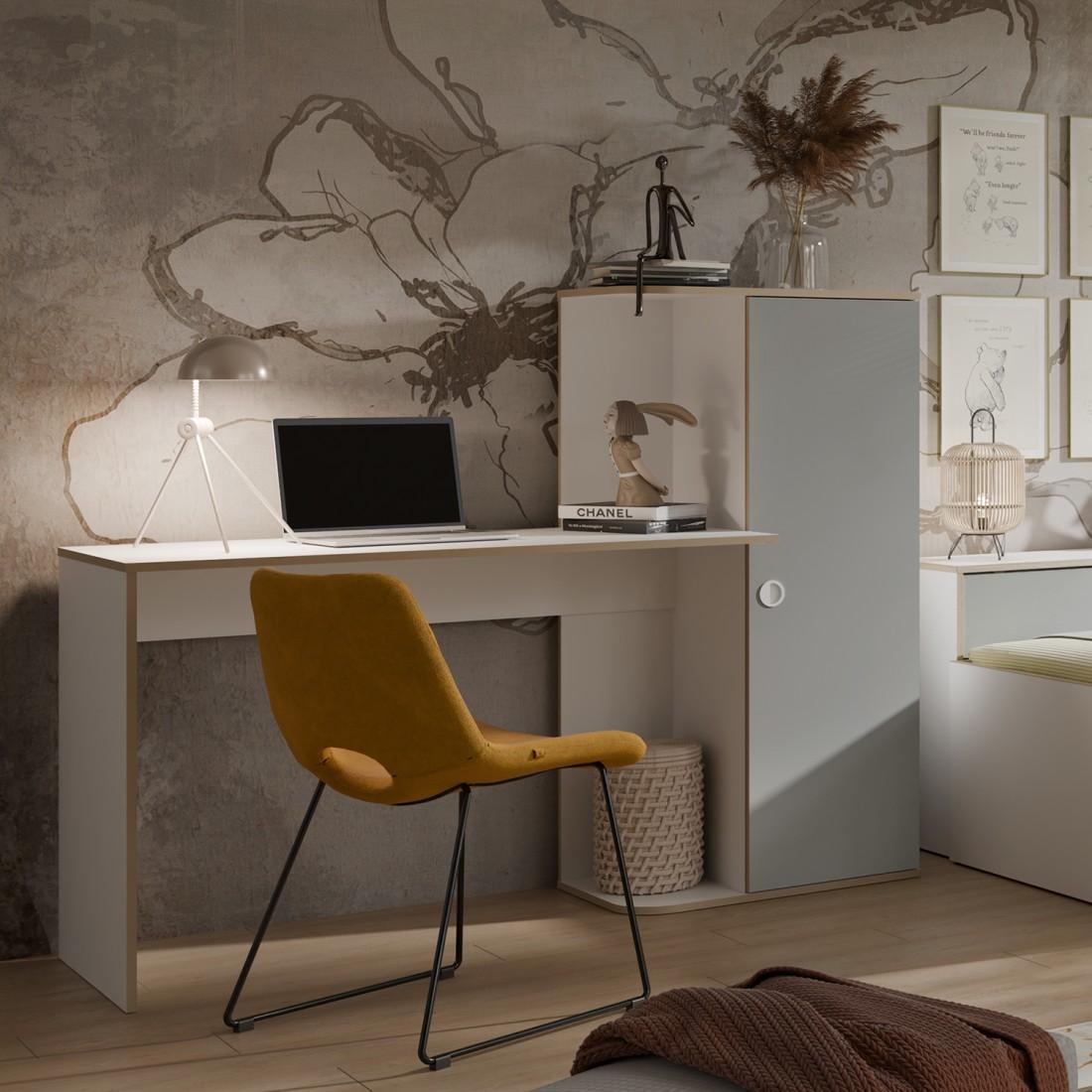 Bureau enfant ELYO – Avec colonne de rangement et 4 niches – Gris, blanc & chêne clair – 160x129x53 cm