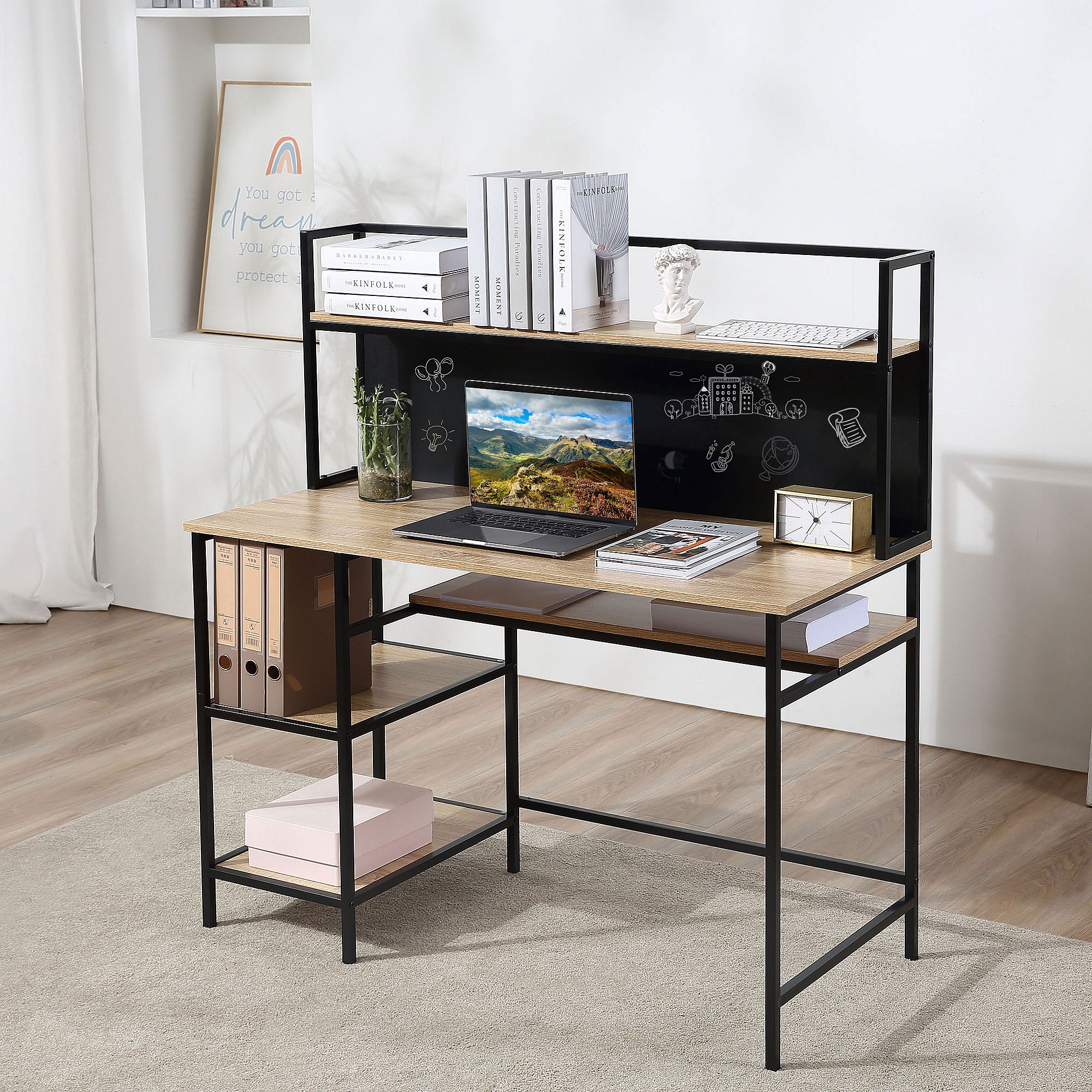 Bureau informatique design industriel 4 étagères grand plateau et panneau noir métal aspect bois